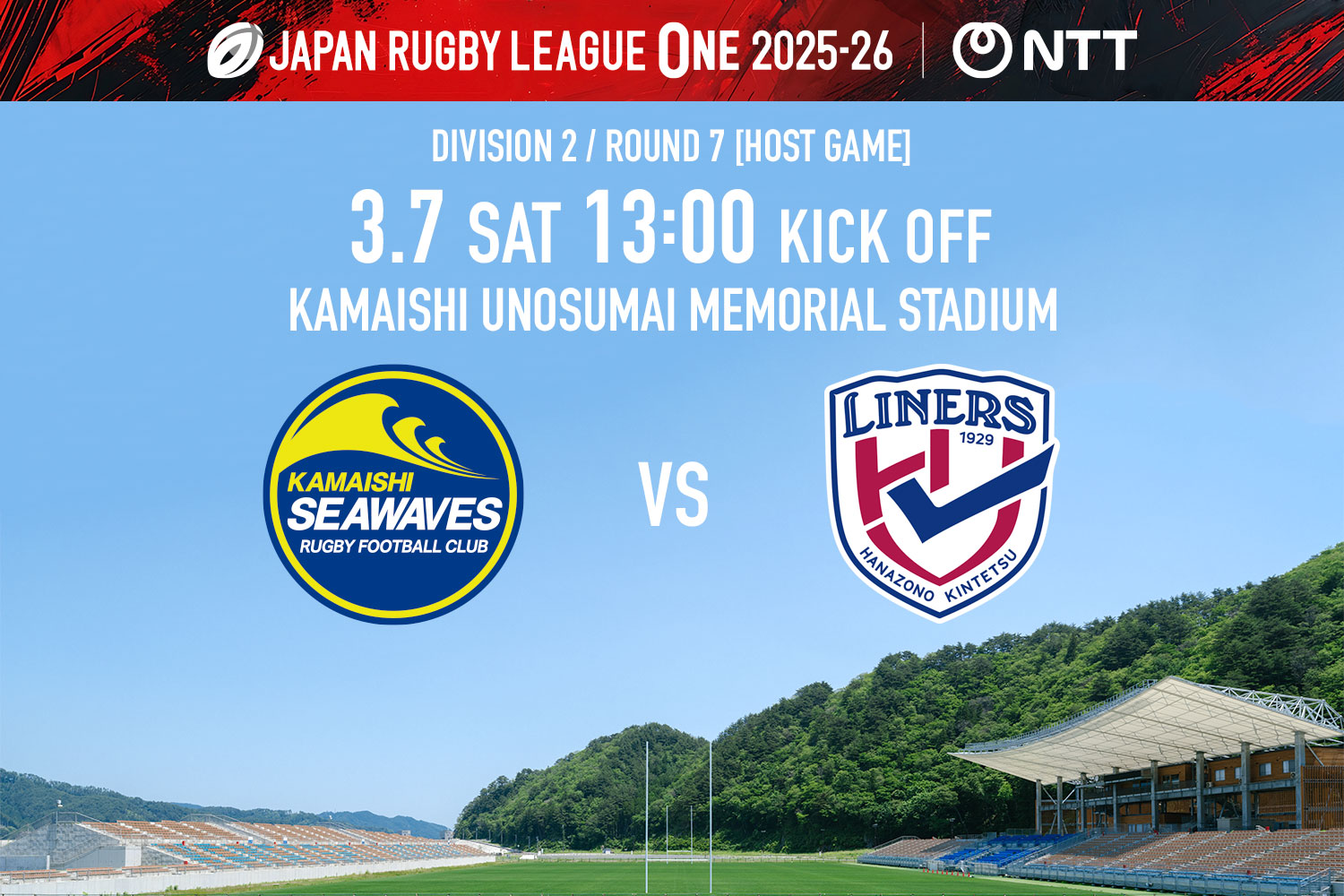 NTTリーグワン2025-26 D2 第7節 東日本大震災復興祈念試合 日本製鉄釜石シーウェイブス vs. 花園近鉄ライナーズ