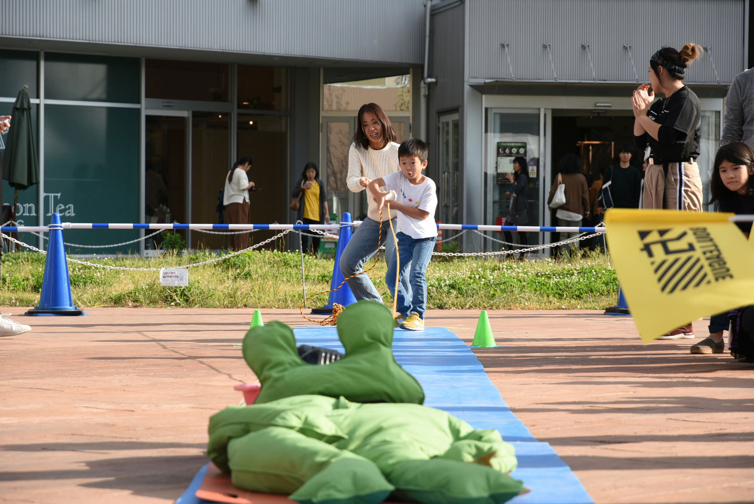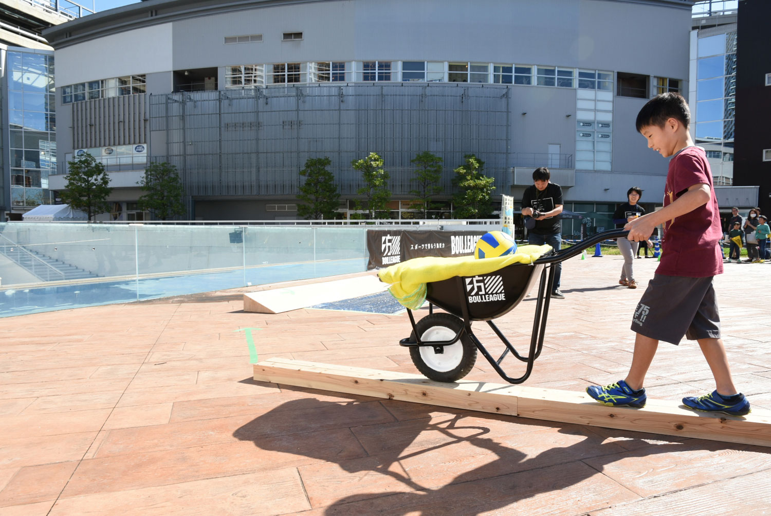 土砂やガレキなどでは小回りが利き悪路にも強い「一輪車」を使う障害物レースです。