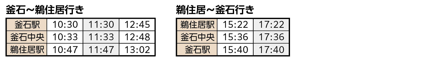 *10:40 釜石駅発、16:46 鵜住居駅発 臨時便は、釜石駅と鵜住居駅にのみ停車し、両駅間のみの運行となります。