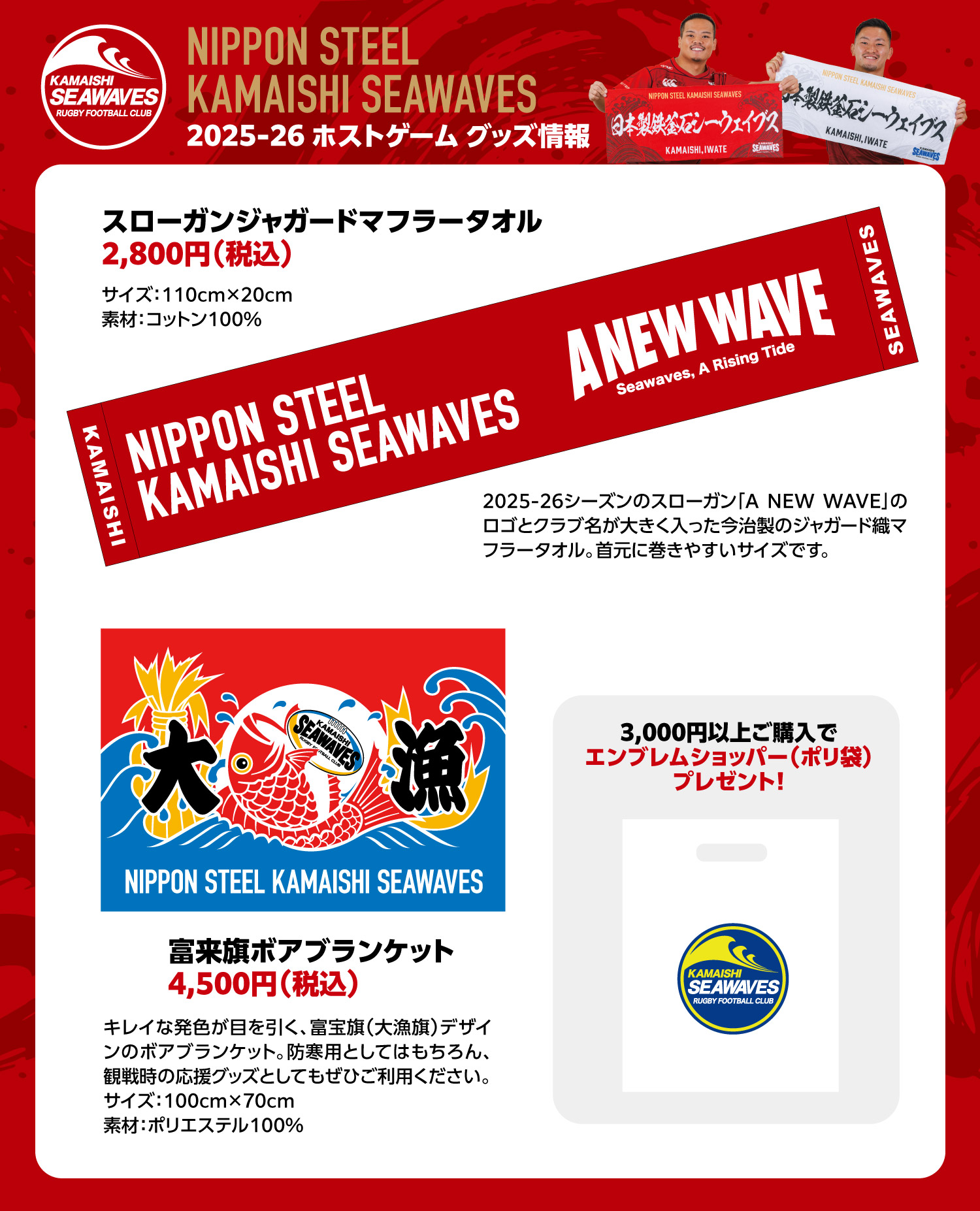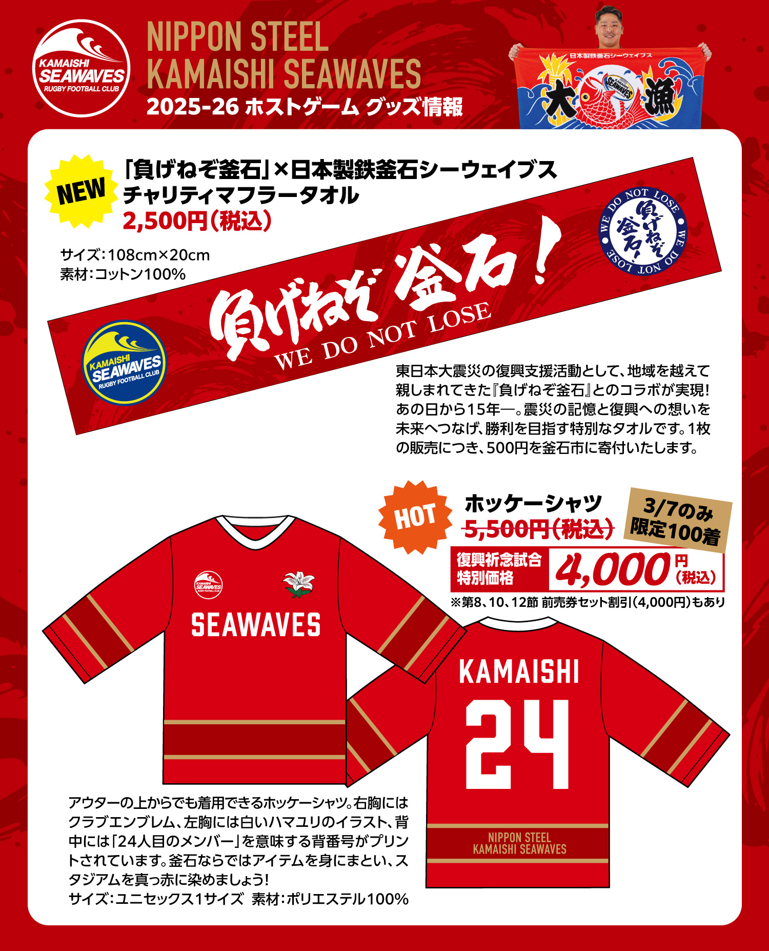 「負げねぞ釜石」× 日本製鉄釜石シーウェイブス チャリティタオル 販売のお知らせ