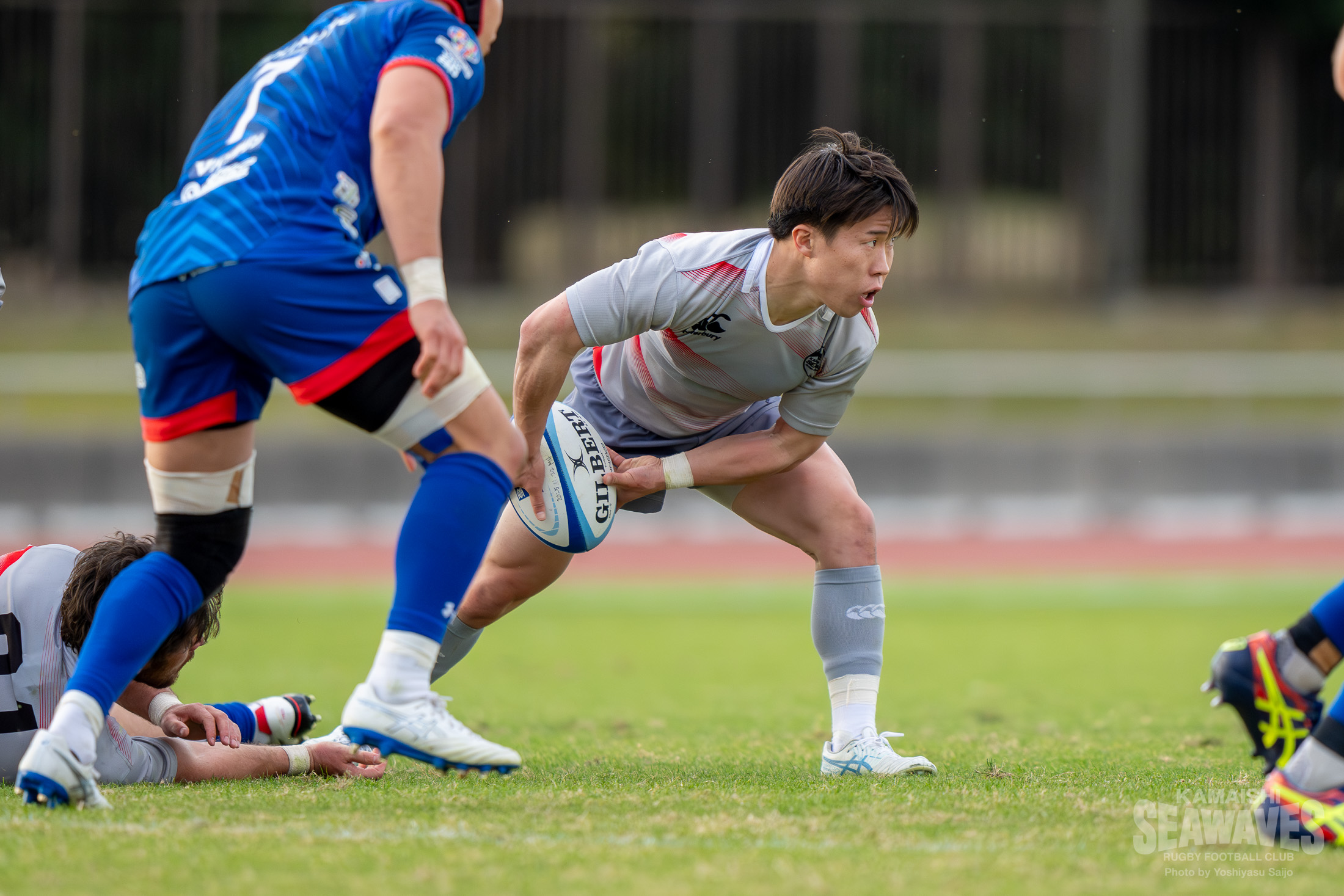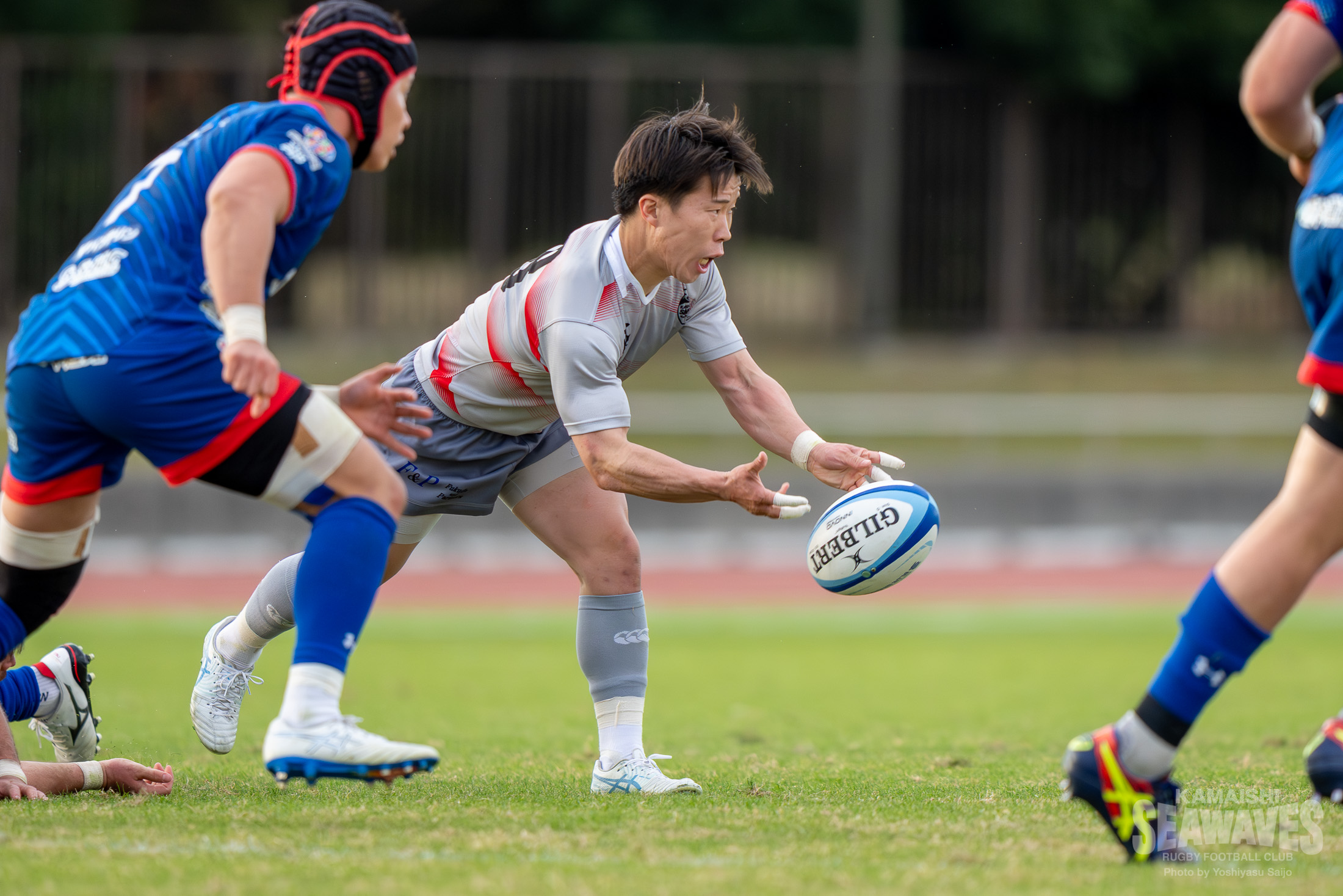 さらに釜石SWはラインアウトからペナルティを犯し、リズムを失います。途中出場のFL髙橋泰地選手が粘りのディフェンスを見せて一度はピンチを脱しますが、勢いづいた江東BSのアタックはさらに続きます。縦への鋭さを見せながら、キックパスでの打開も見せるなど、さまざまな形で仕掛けられますが、釜石SWもなんとか我慢を続けます。しかし、後半29分、精度の高いキックパスを左サイドに通され、ついにその守備網をこじ開けられます。コンバージョンキックは決まらなかったものの、スコアは21-24となり、この試合初めて江東BSにリードを奪われます。