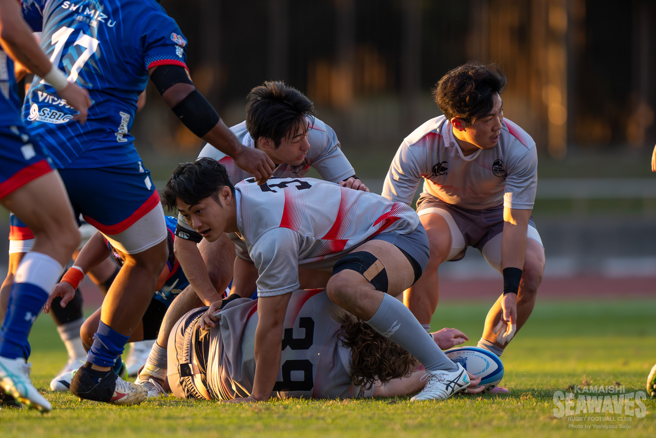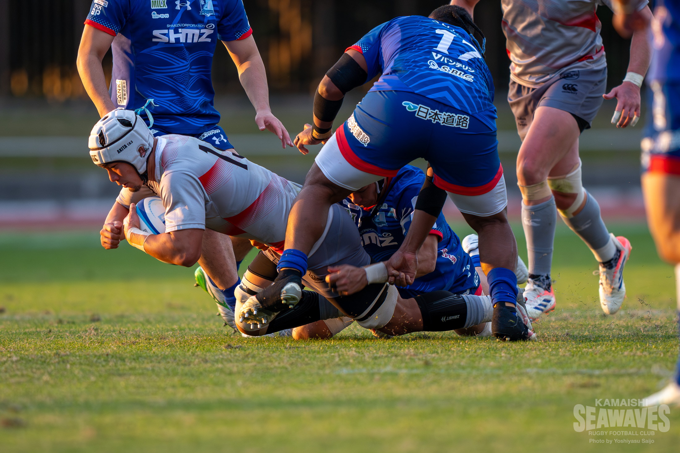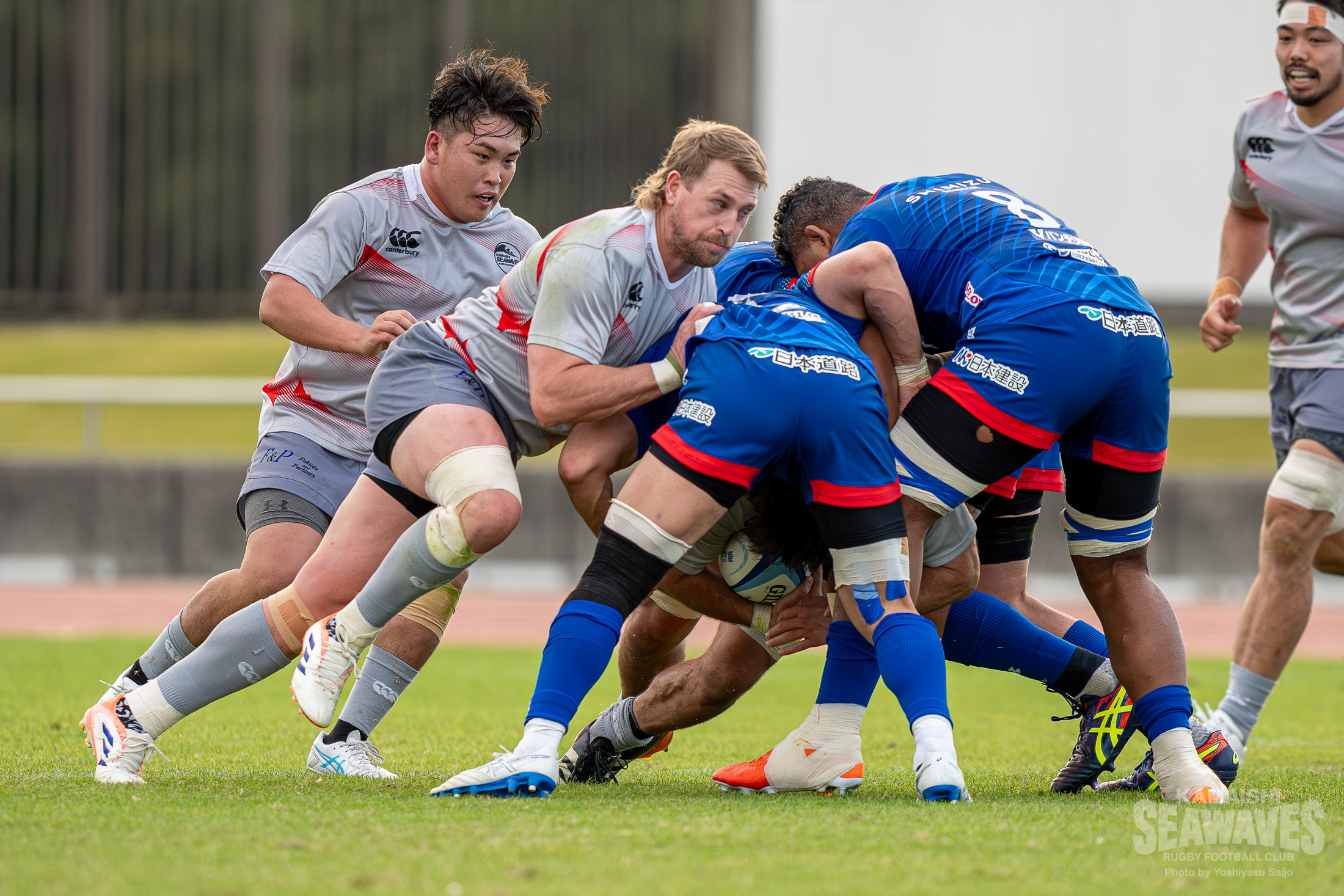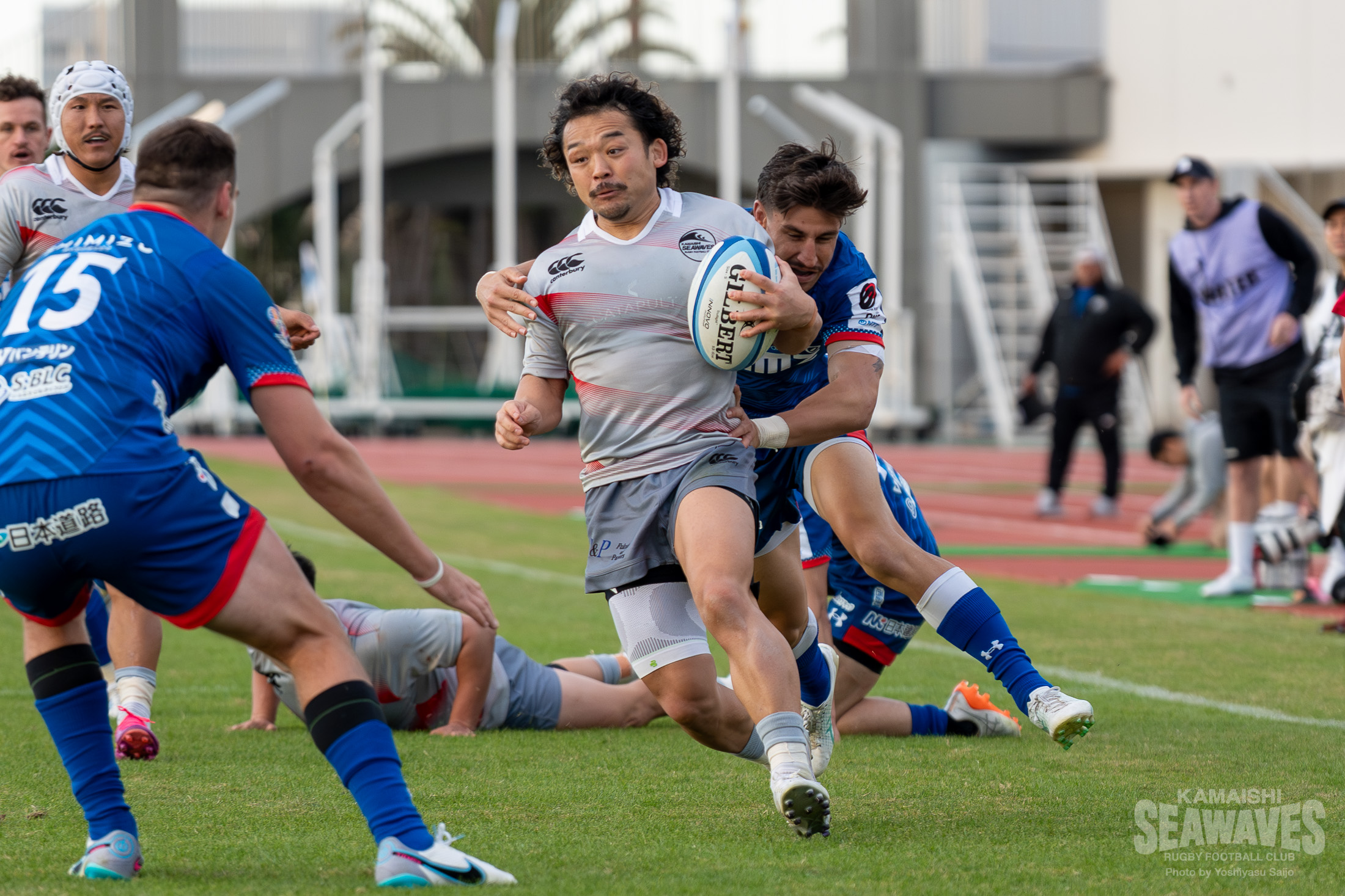 直後には江東BSにスクラムを起点にした展開で一気にトライライン目前までボールを運ばれますが、ここはPR松山青選手がブレイクダウンでの気迫のディフェンス。相手のペナルティを誘い失点を阻止するビッグプレーでチームを救いました。しかし、この一連のプレーでPRトロイ・ハレット選手が負傷し、交代を余儀なくされます。