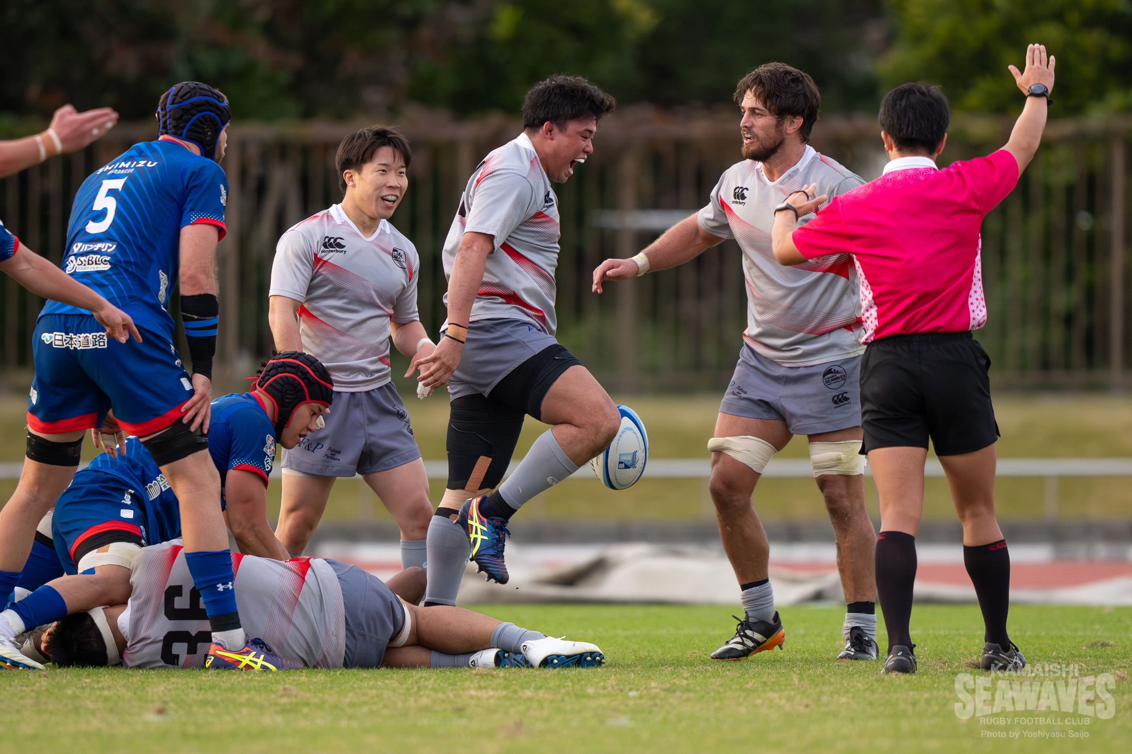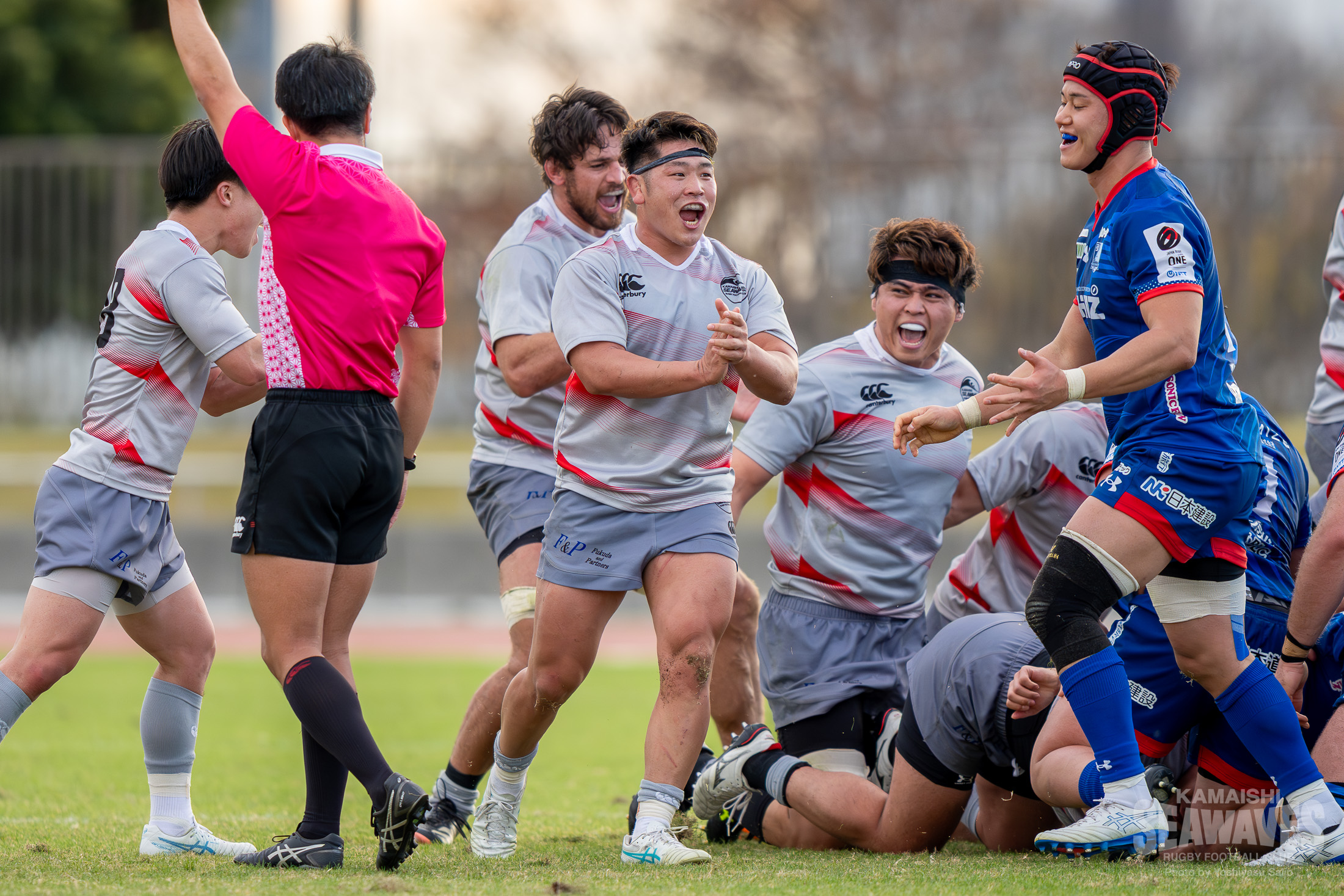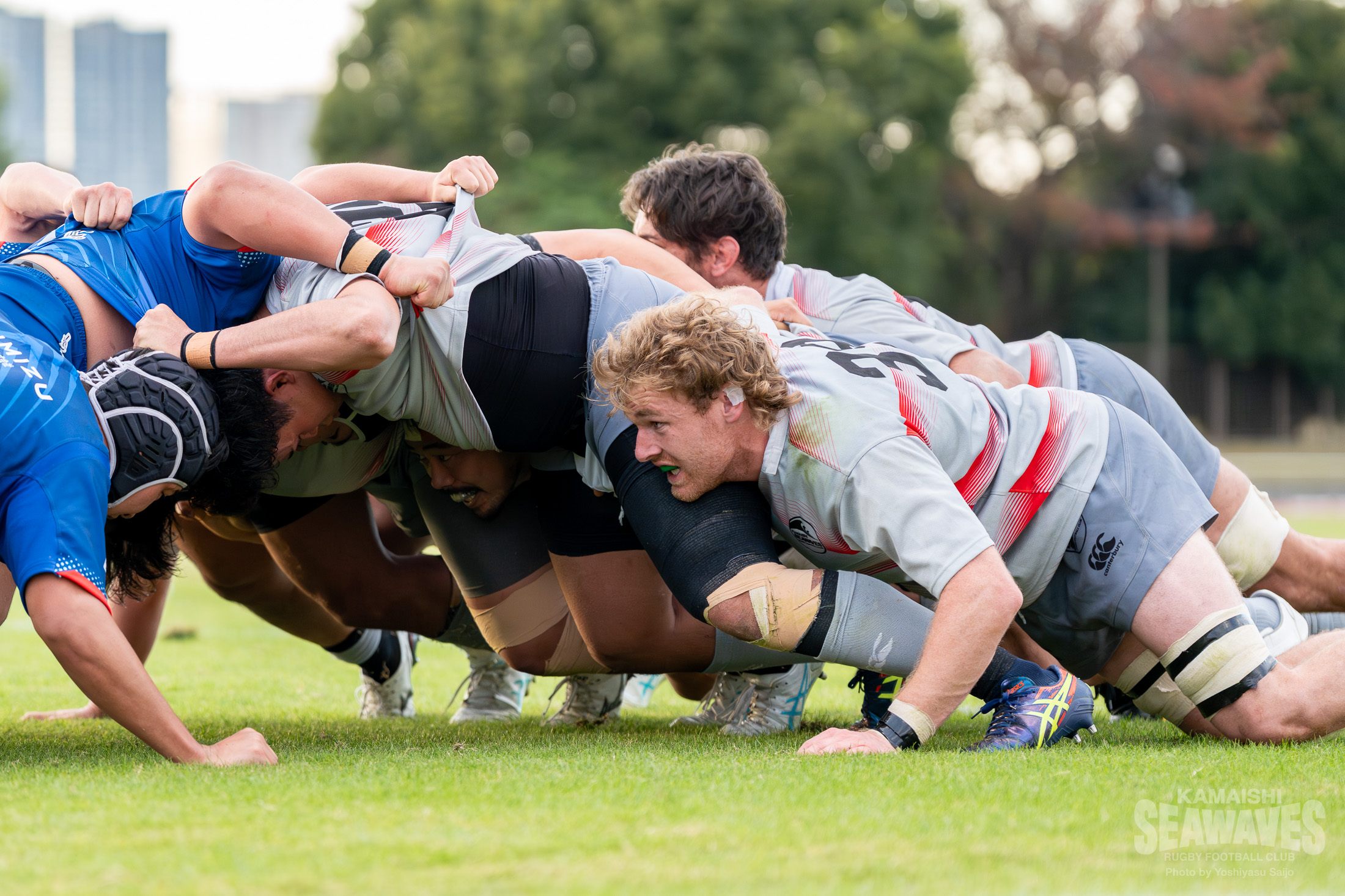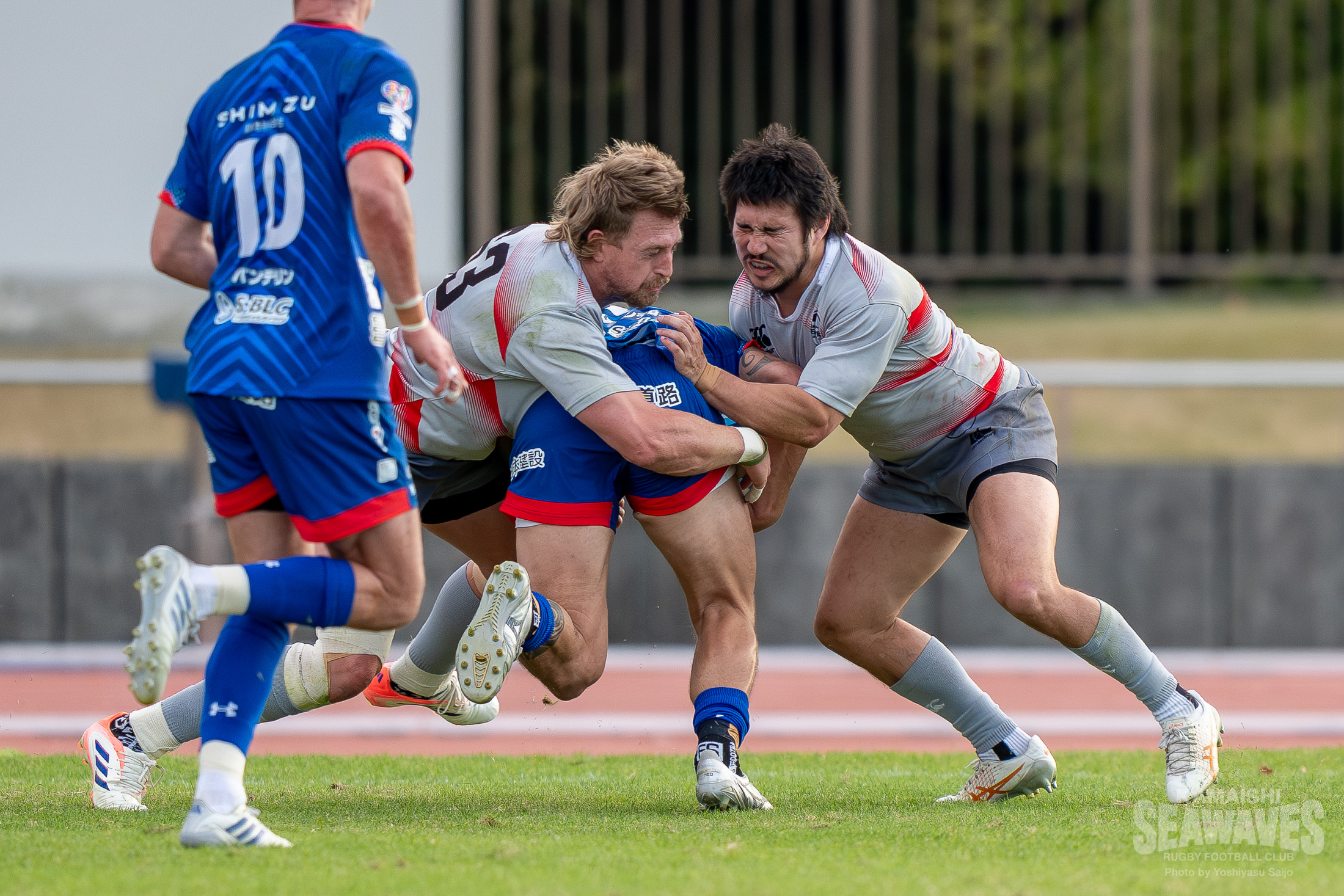 直後には江東BSにスクラムを起点にした展開で一気にトライライン目前までボールを運ばれますが、ここはPR松山青選手がブレイクダウンでの気迫のディフェンス。相手のペナルティを誘い失点を阻止するビッグプレーでチームを救いました。しかし、この一連のプレーでPRトロイ・ハレット選手が負傷し、交代を余儀なくされます。