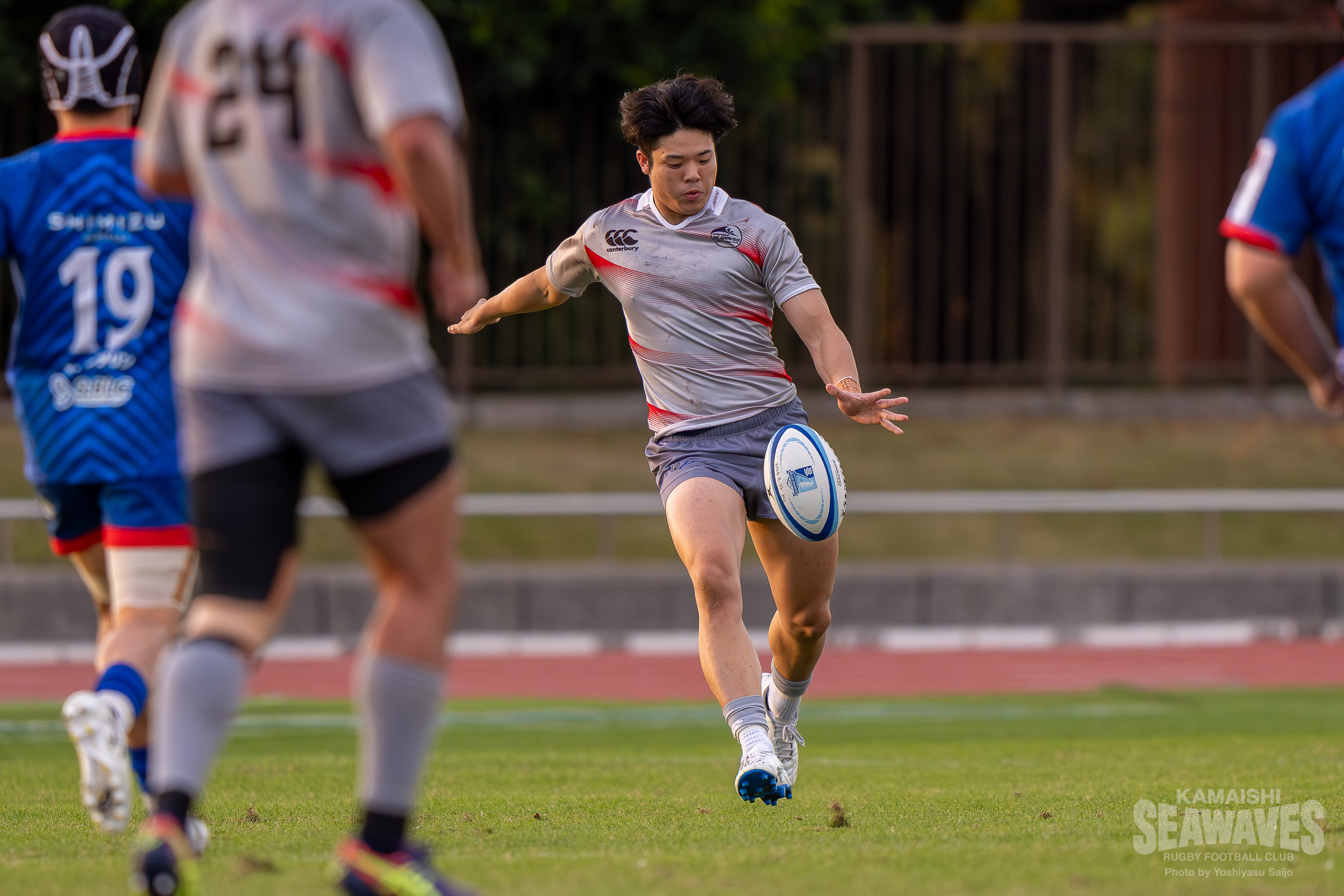 後半も立ち上がりから釜石SWは攻守に集中力を維持し、前に出るディフェンスからテンポのいいアタックを仕掛けます。後半7分には右から中央、左に展開し、WTB小野航大選手がタッチライン際で抜け出しそうになりますが、直前のプレーでスローフォワードを取られて惜しいチャンスを逃します。それでも後半10分には敵陣深くからのラインアウトを獲得。ラインアウトモールは止められますが、鋭く中央へ展開すると、後半から途中出場のCTB畠中豪士選手がポール下にトライ。CTB畠中豪士選手は後半開始直後、自陣でのビッグタックルも成功させており、釜石SWに勢いをもたらすような活躍を見せます。後半も先手を取ったのは釜石SW。スコアは21-12となりました。