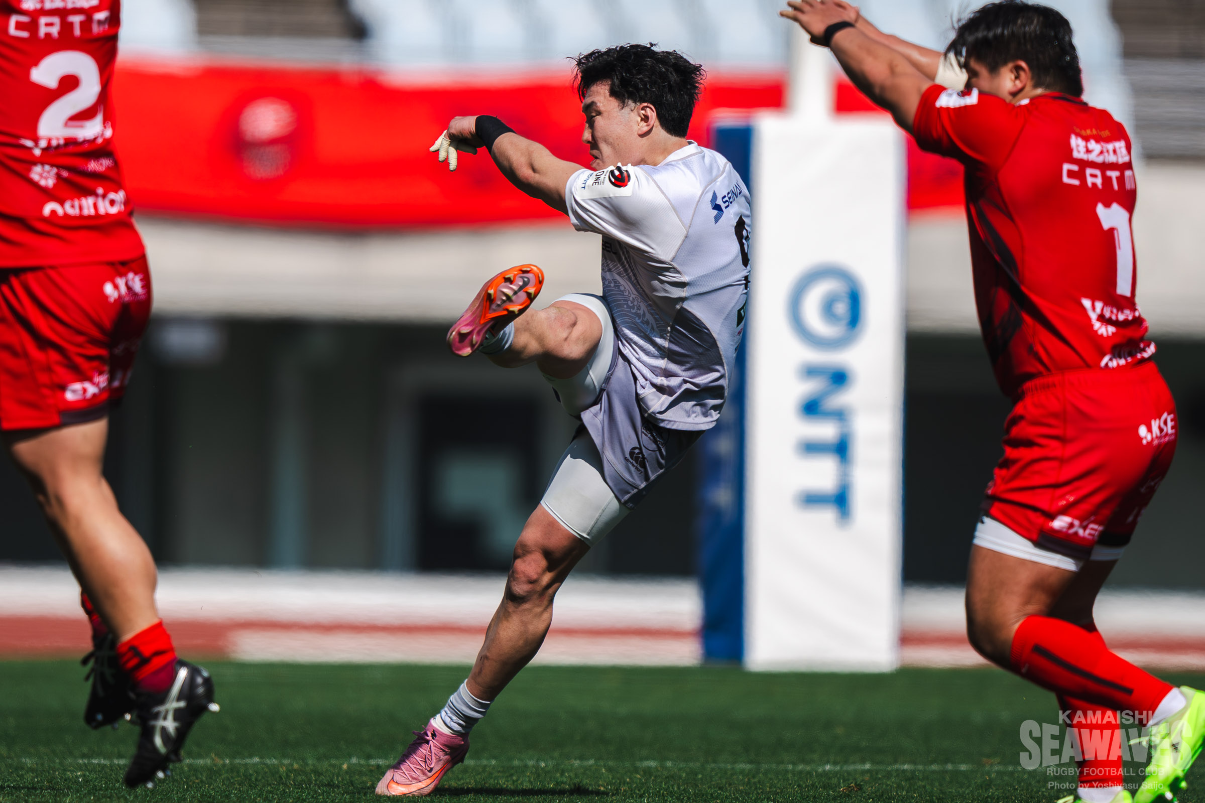 この日の先発メンバーには、スクラムハーフに南篤志選手、ウイングに髙居海晴選手が名を連ねました。いずれも強いキックに特長を持つ選手です。キックでエリアをコントロールしながら、スペースを効果的に使ってアタックを組み立てていく狙いがうかがえる布陣でした。