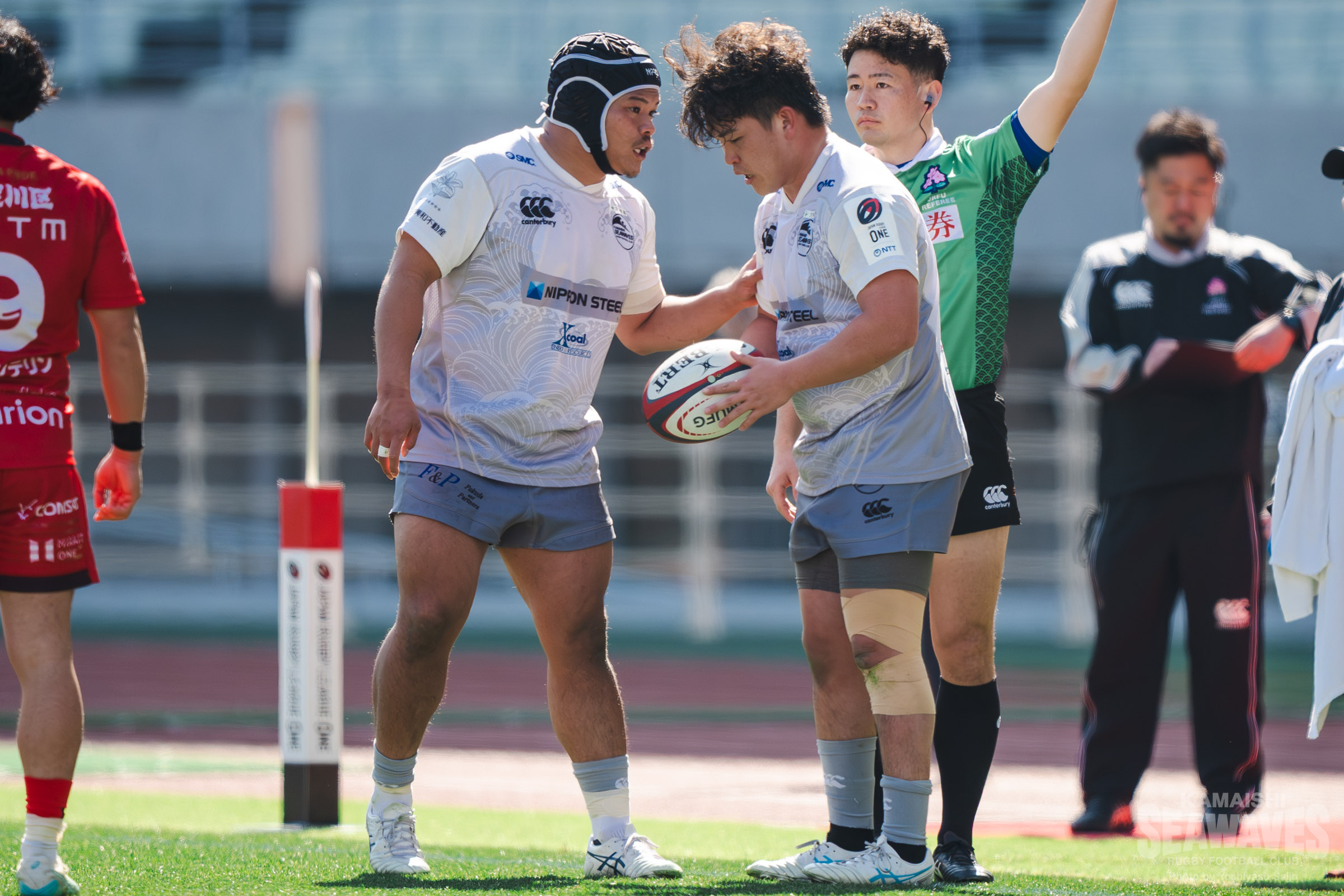 前半16分にファンデルヴォルト選手が復帰し、15人対15人の状況に戻ります。そして、中央のラックの攻防から得たペナルティでラインアウトのチャンスをつかんだ釜石SW。HO西林勇登選手のスローが奥で待つNo.8サム・ヘンウッド選手へつながると、そこからクイックパスで内側に切り返し、勢いよく飛び込んだFLアンガス・フレッチャー選手が前進します。再びサポートに入ったヘンウッド選手がボールをピックアップし、グラウンディング。先制トライかと思われましたが、直前のプレーで釜石SW側にペナルティがあったとしてノートライとなりました。