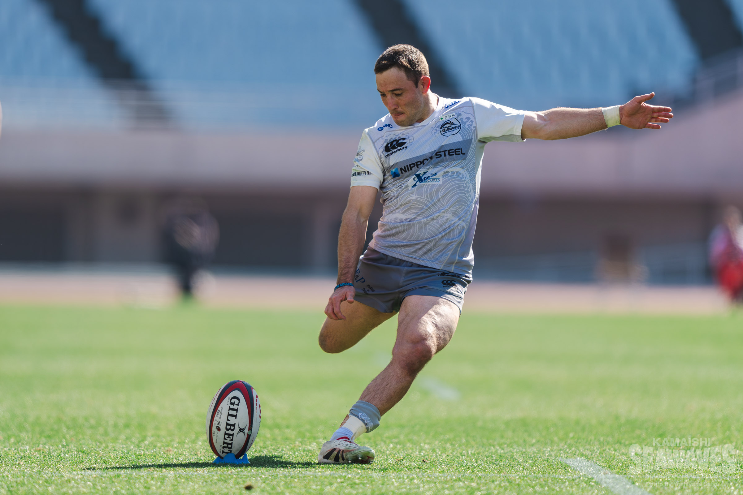 均衡を破ったのは前半20分。中盤でマイボールとした釜石SWは自陣から大きく左へ展開します。WTB髙居海晴選手が得意のキックで相手を背走させ、敵陣でラインアウトを獲得します。このラインアウトを起点に中央から再び左へ展開し、相手ディフェンスのギャップを見逃さなかったFL河野良太選手が突破。そのままトライゾーンまで持ち込み、待望の先制トライを挙げました。難しい角度からのコンバージョンキックもSOミッチェル・ハント選手が成功させ、スコアは7-0となります。