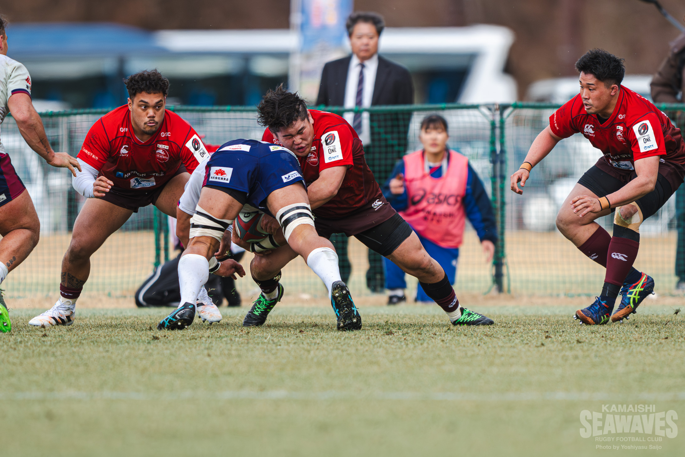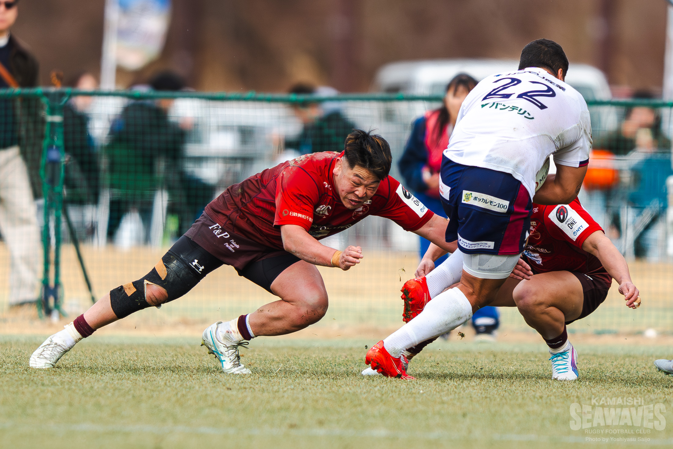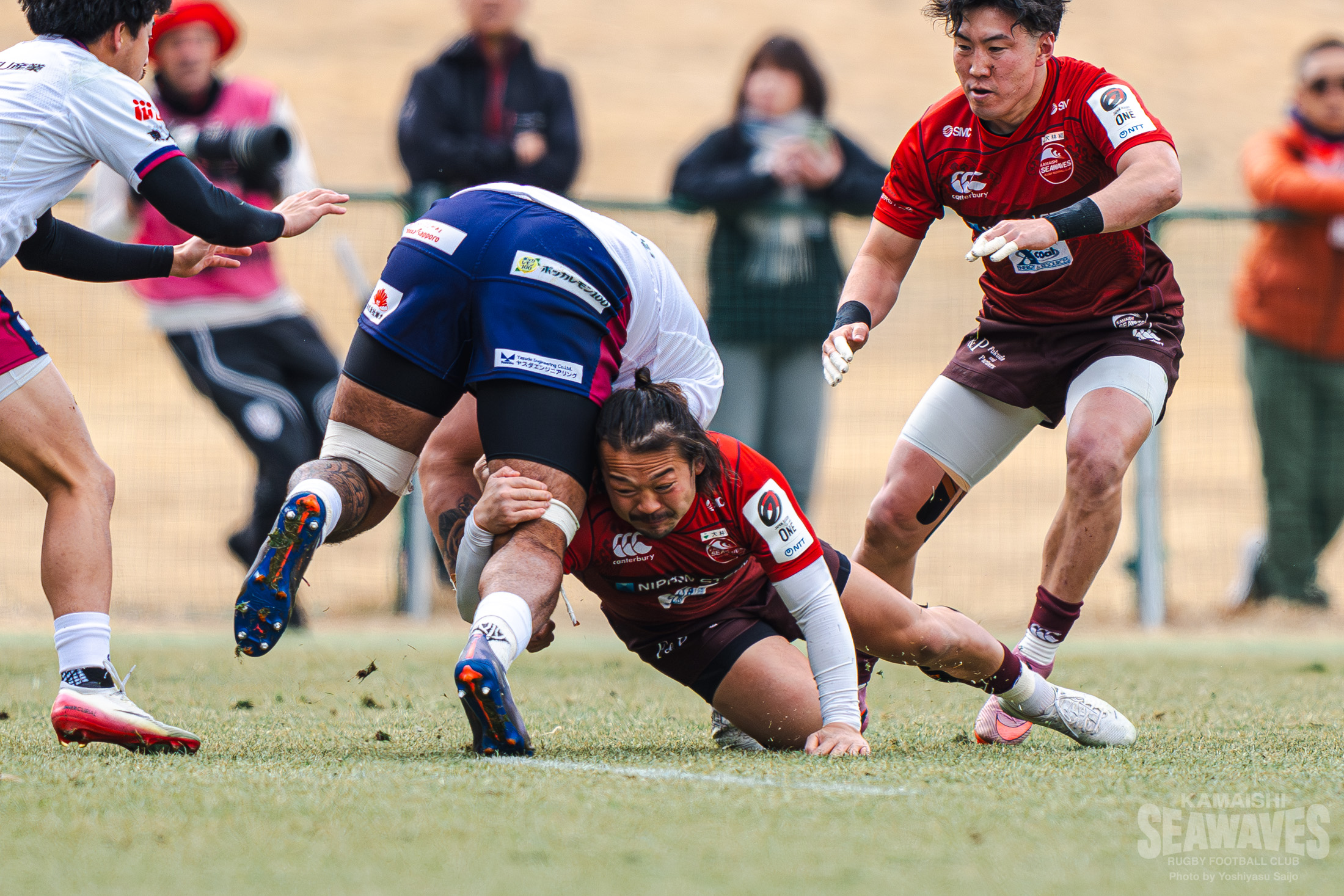 天候は晴れ。しかし、三陸沿岸特有の強い風が吹き、時折小雨やあられも降る難しいコンディションの中で試合が始まりました。花園Lのキックオフでスタートすると、ボールはダイレクトでタッチラインを割り、スクラムで再開となります。最初のスクラムは互いにがっちりと組み合い、釜石SWはキックでエリアを前進。左に展開してゲインラインを突破しますが、ここはターンオーバーを許します。それでも相手陣内でのディフェンスでプレッシャーを掛け、立ち上がりから果敢なディフェンスをみせます。