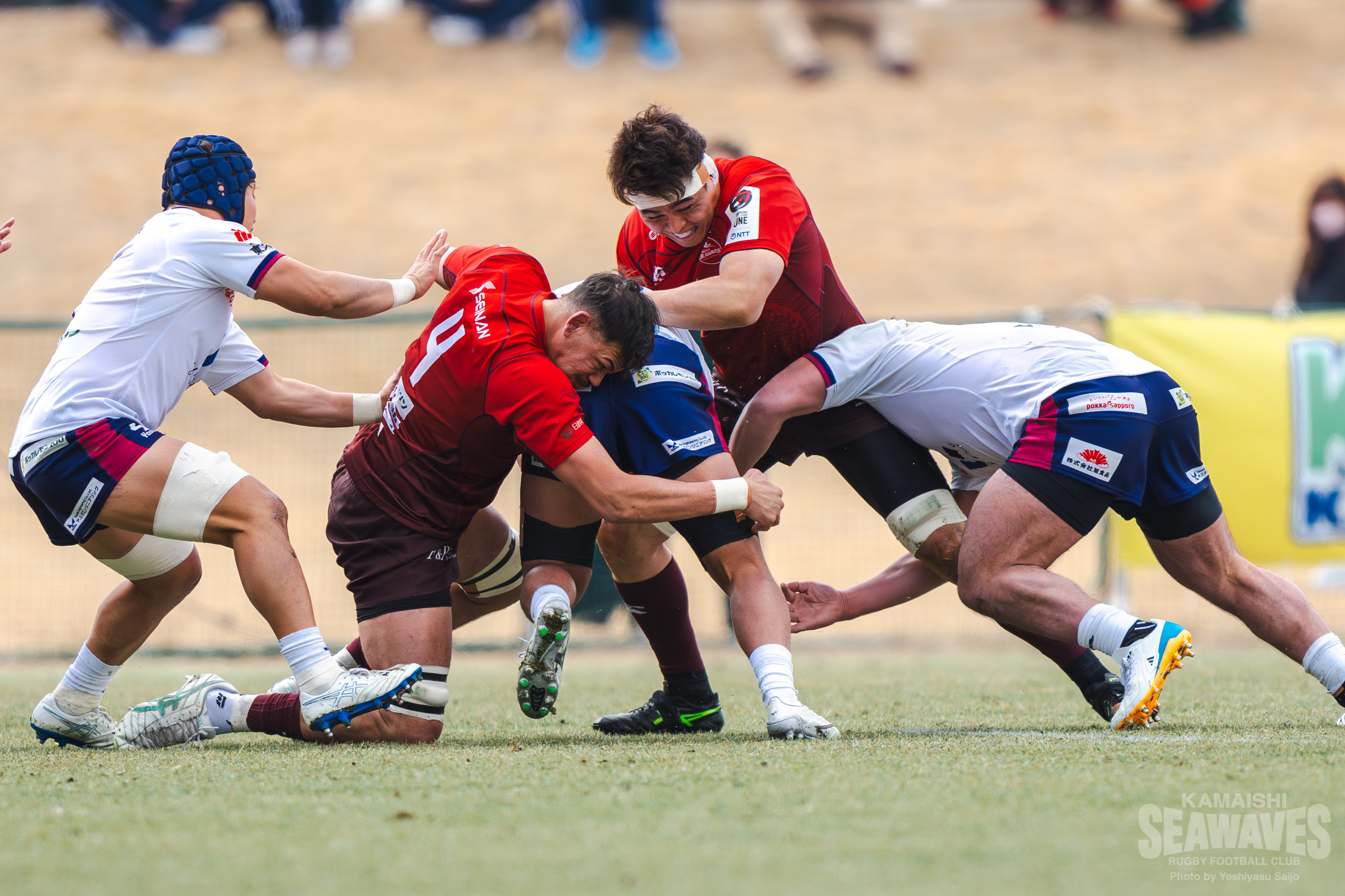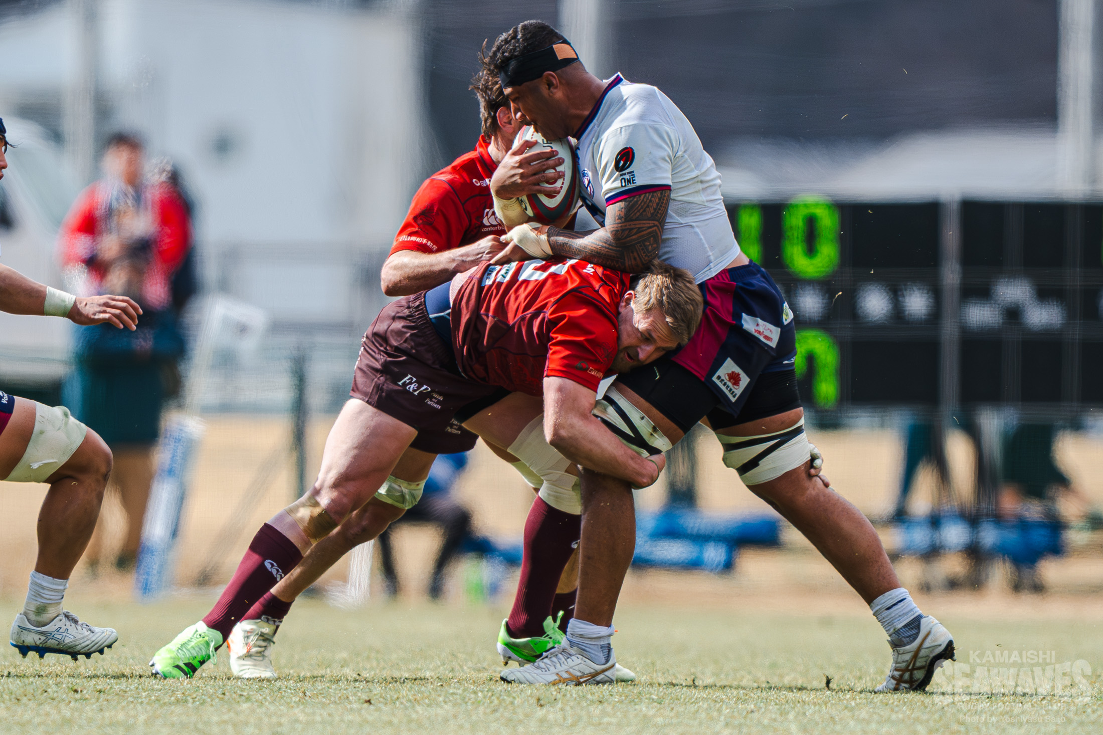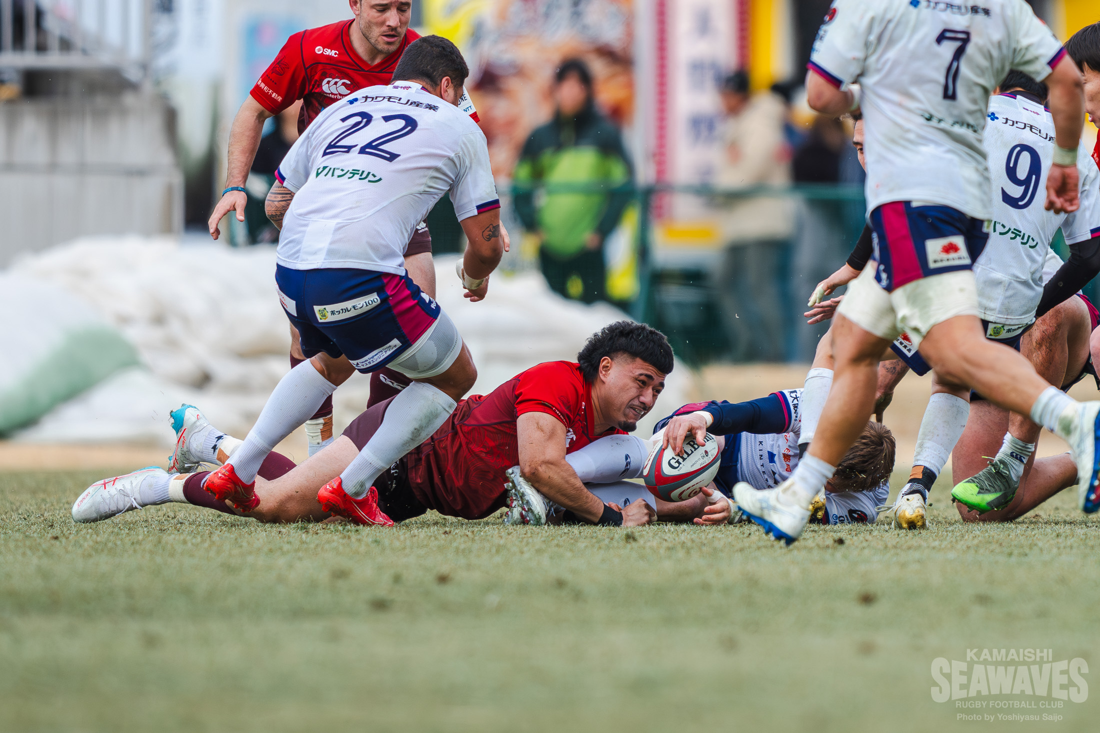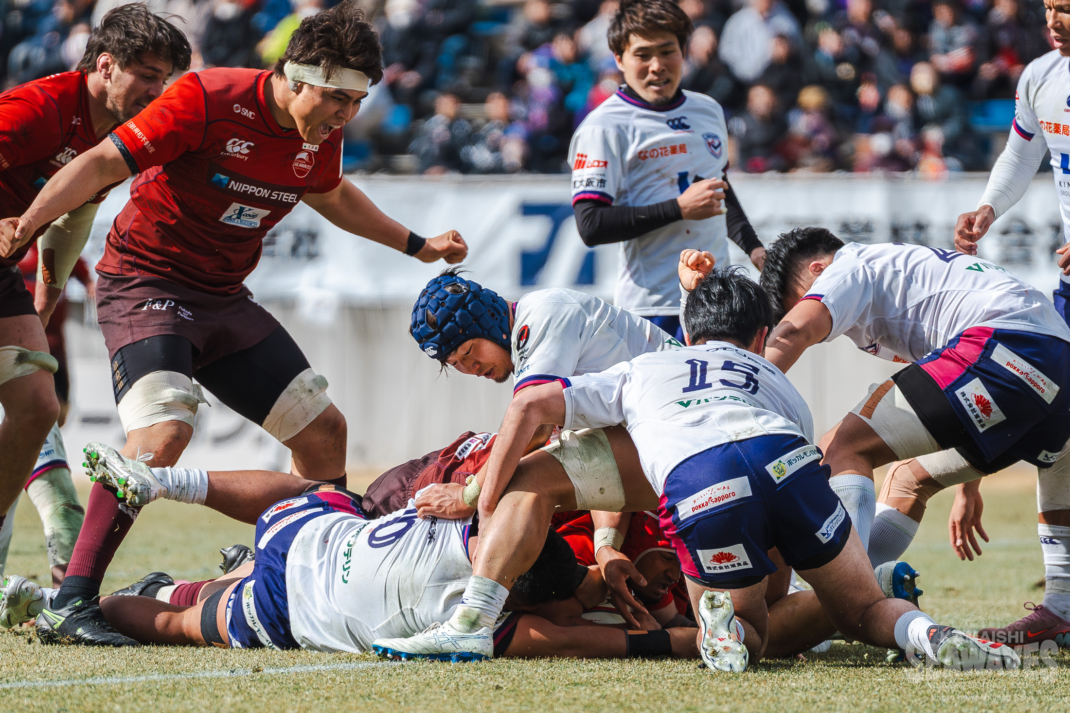 しかし釜石SWも自陣でのプレーが続く中で徐々にペナルティが増え、後半30分にはラインアウトモールを一度止めたものの、その後の攻防でトライを許します。残り10分でスコアは30-22。緊張感ある終盤を迎えます。