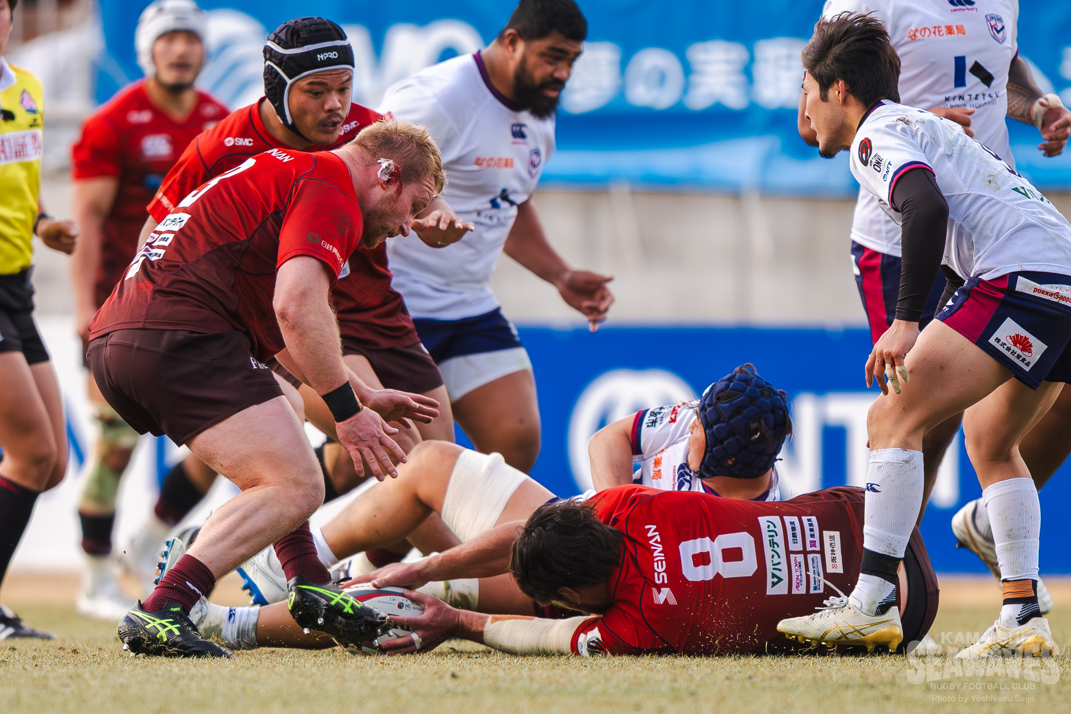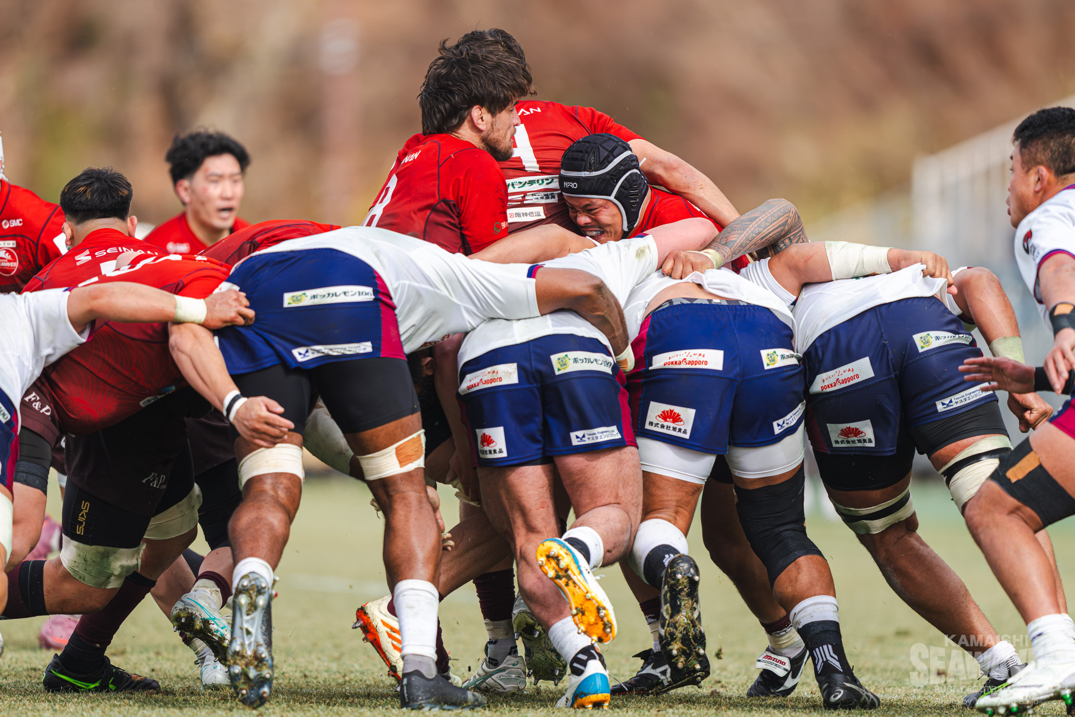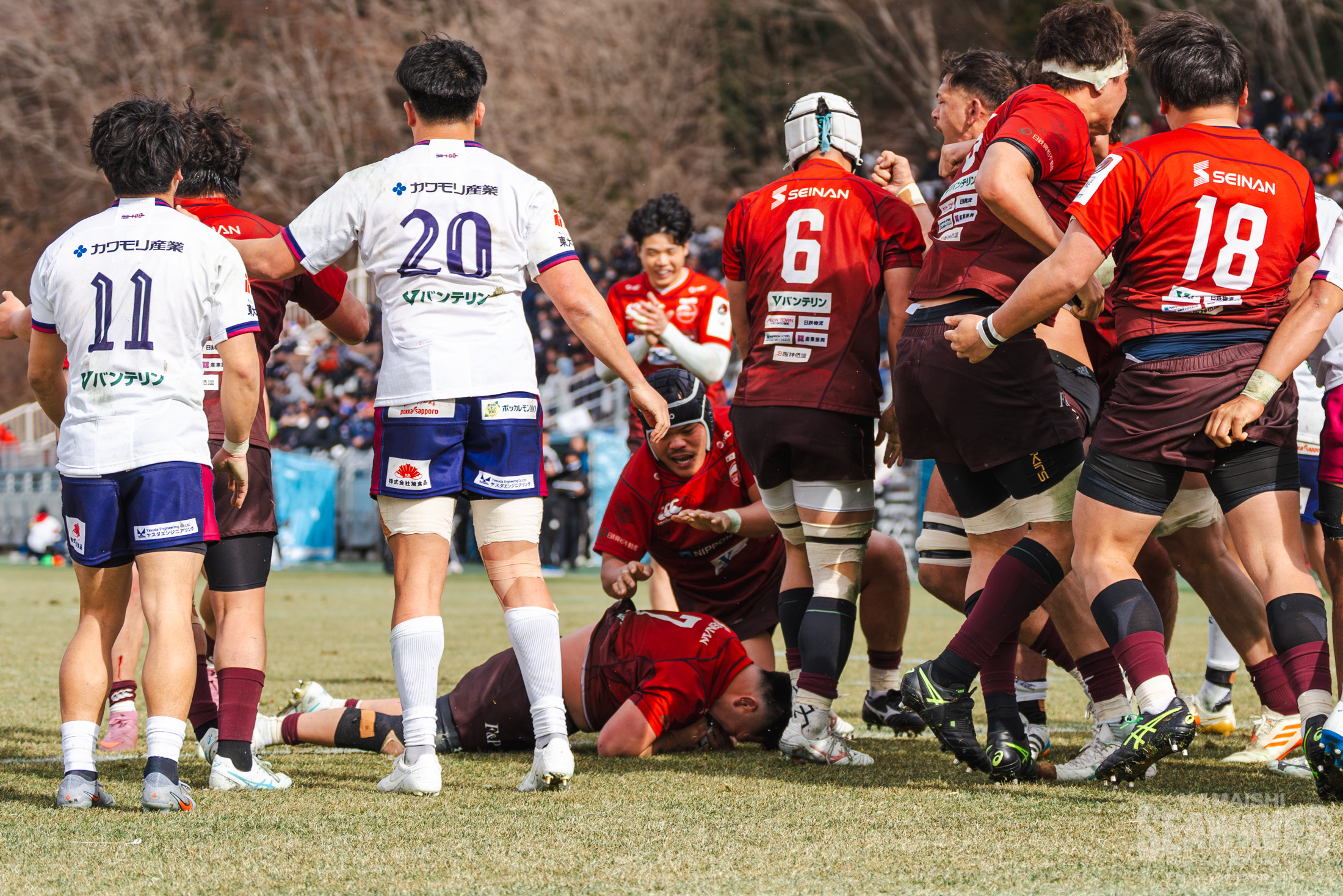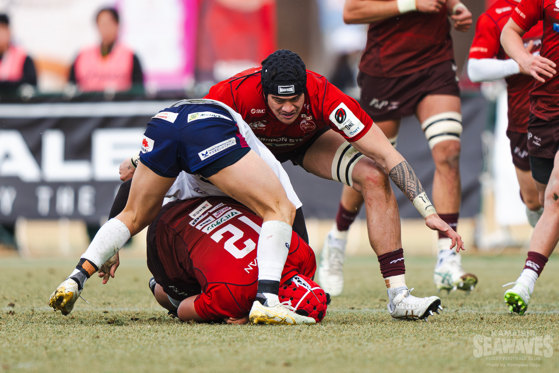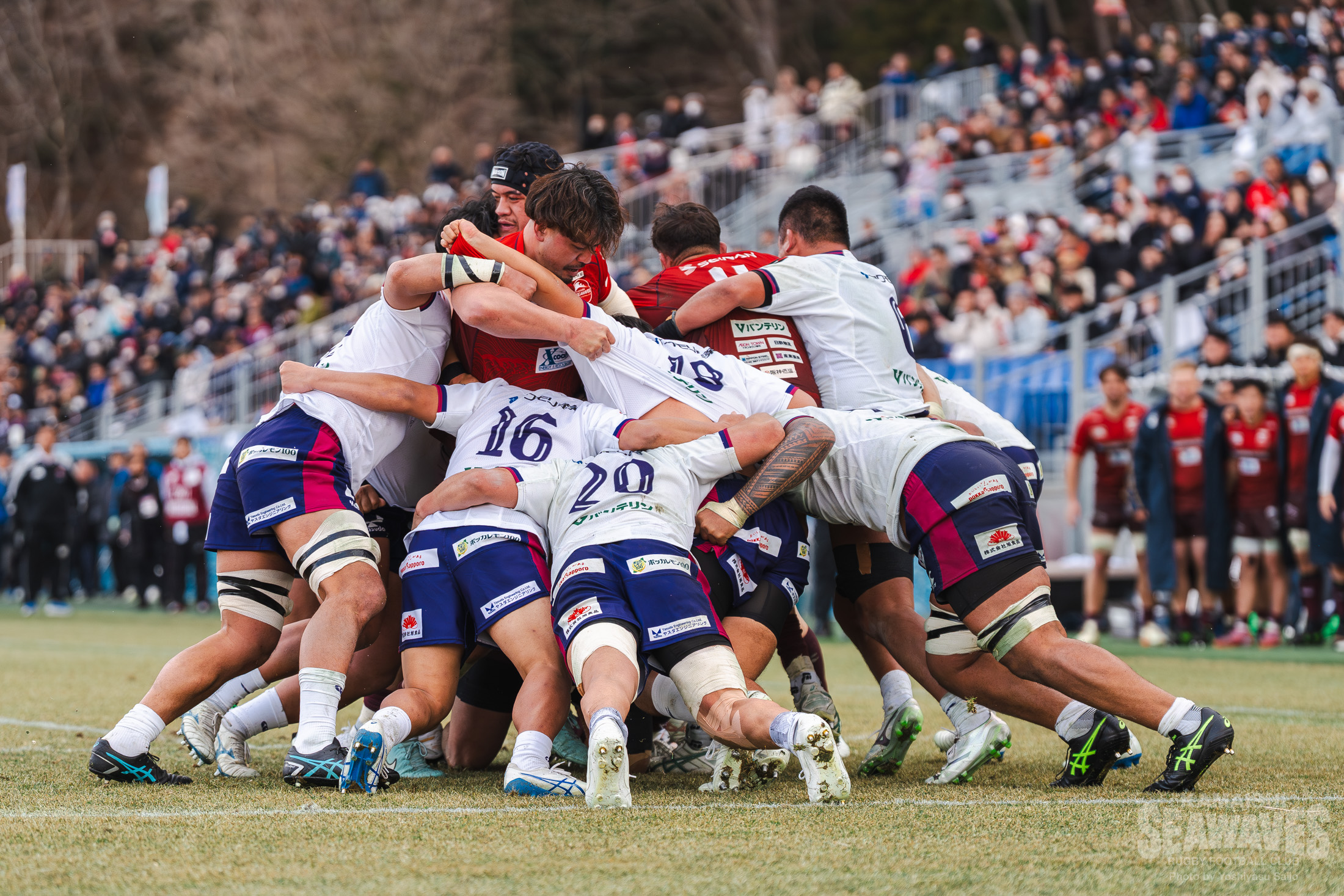 しかし釜石SWも自陣でのプレーが続く中で徐々にペナルティが増え、後半30分にはラインアウトモールを一度止めたものの、その後の攻防でトライを許します。残り10分でスコアは30-22。緊張感ある終盤を迎えます。