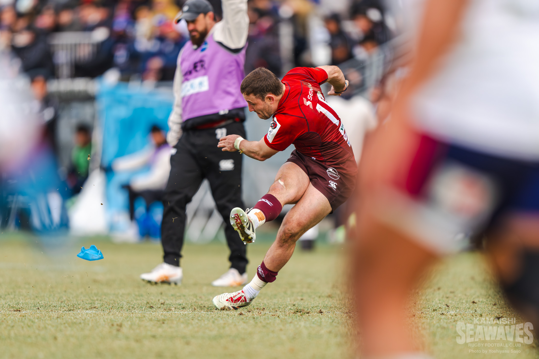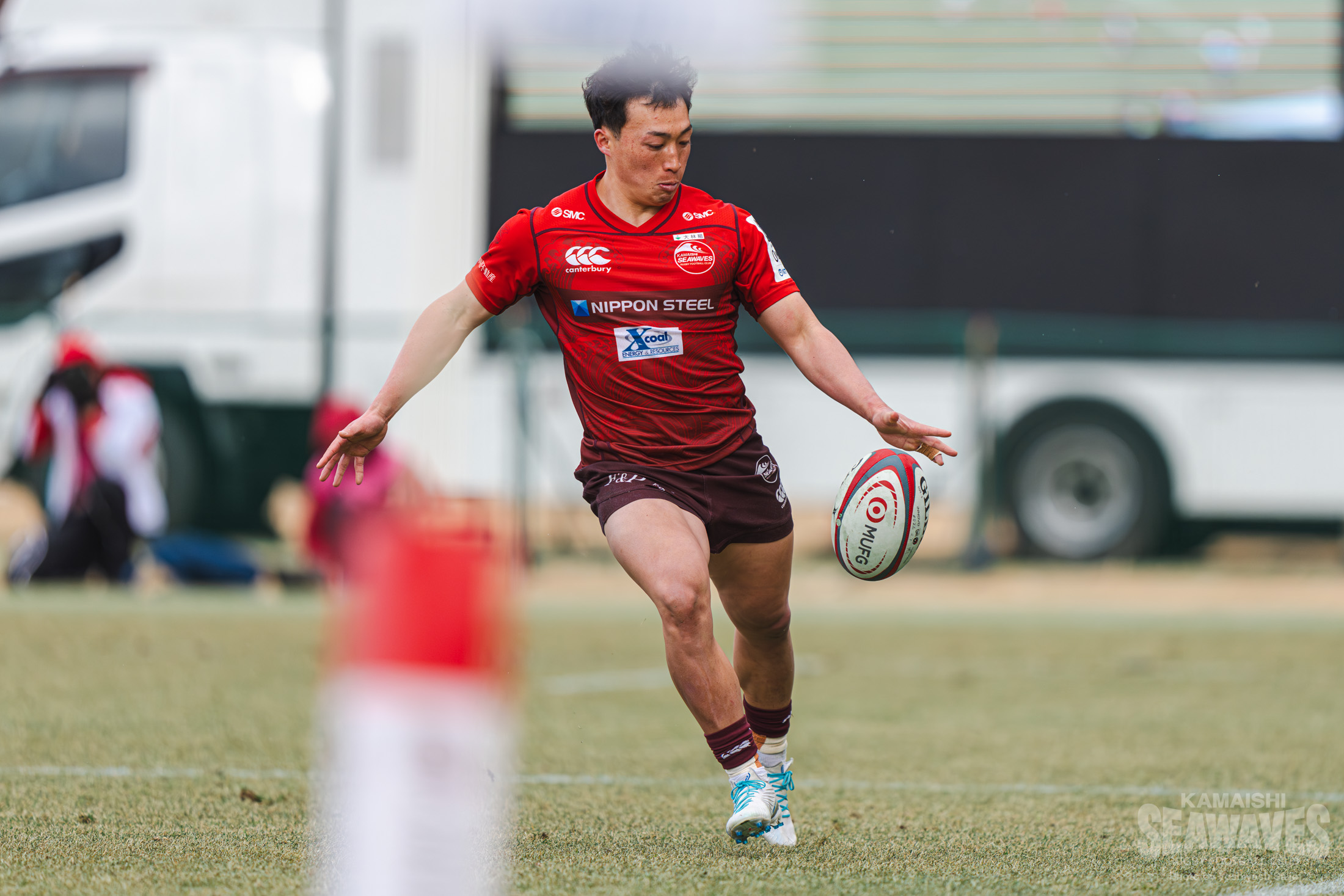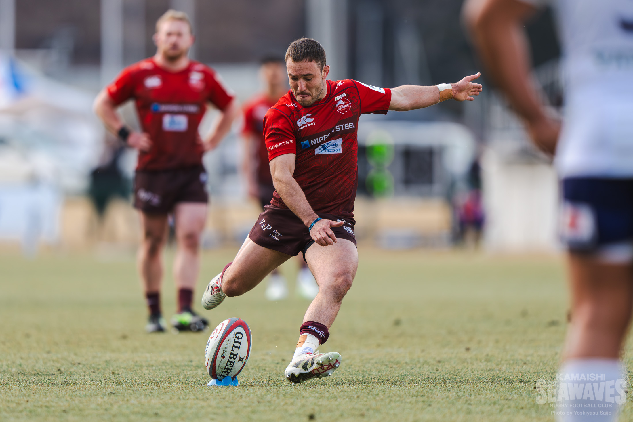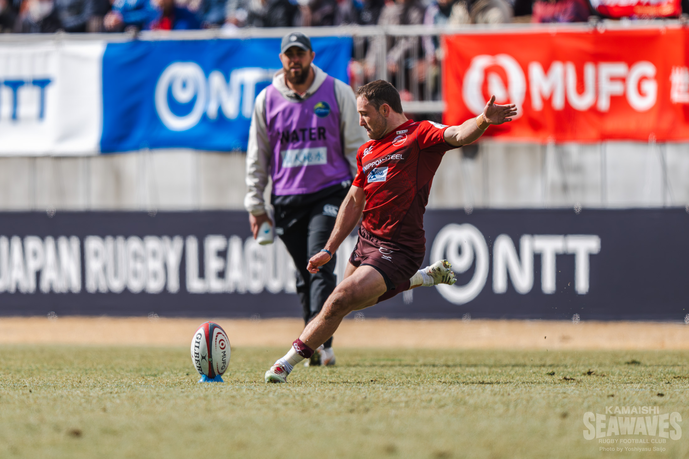 さらに前半終了間際、ゴールポスト正面の位置でペナルティを得た釜石SWはショットを選択します。このキックもハント選手が確実に決め、ラストプレーで3点を追加。20-7とリードを広げて前半を終えました。