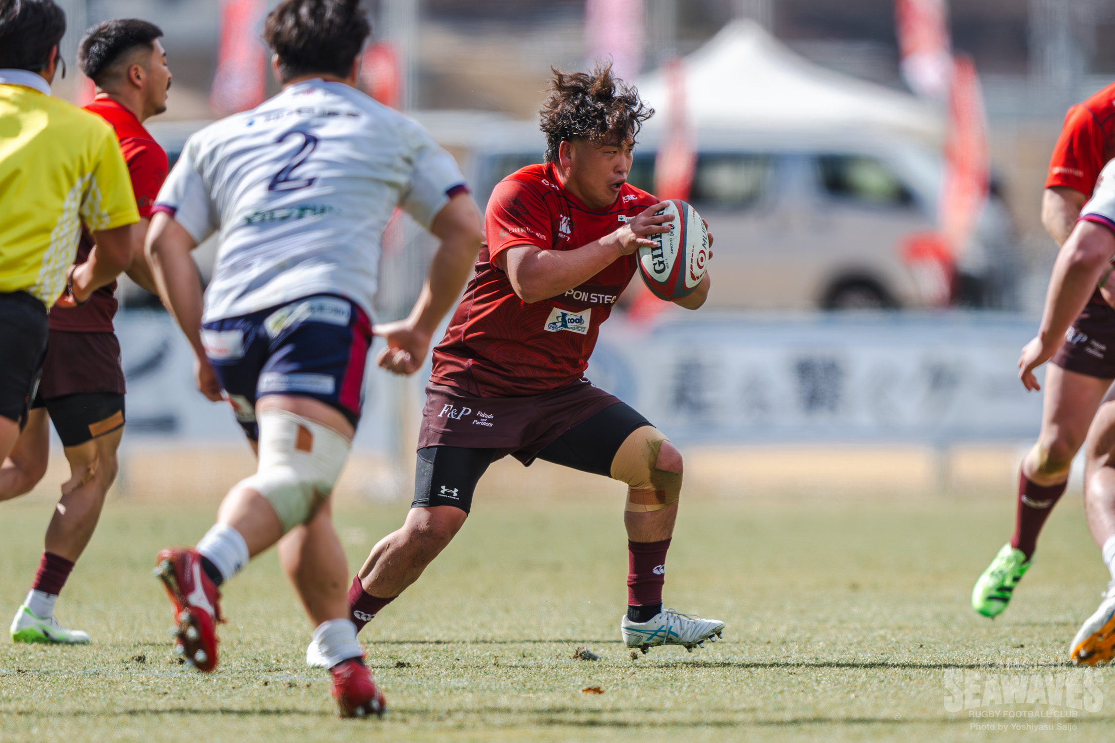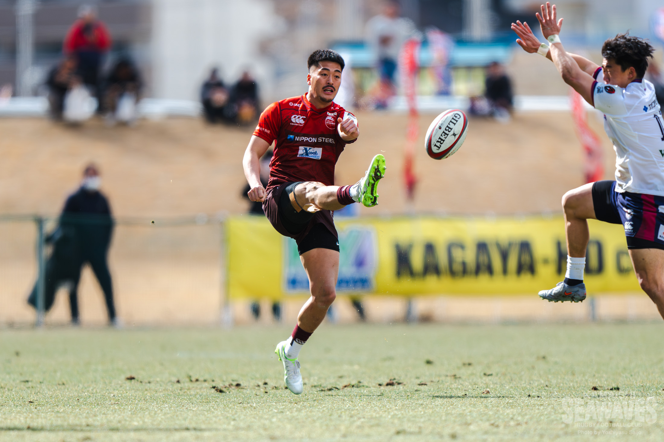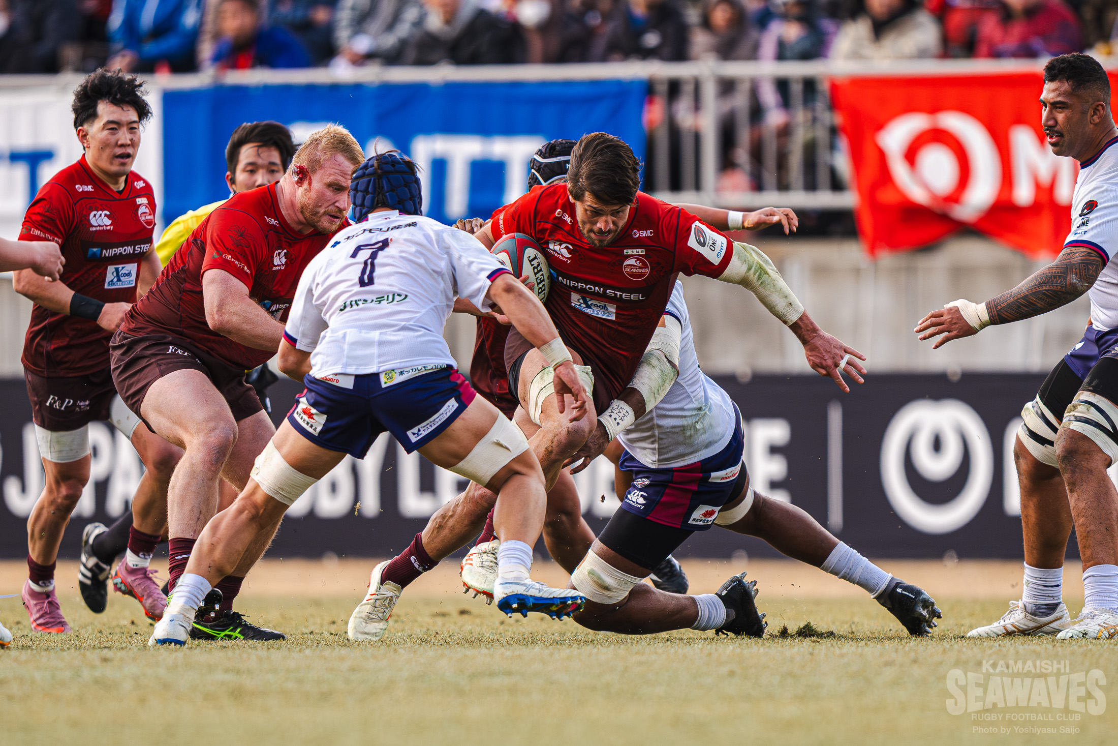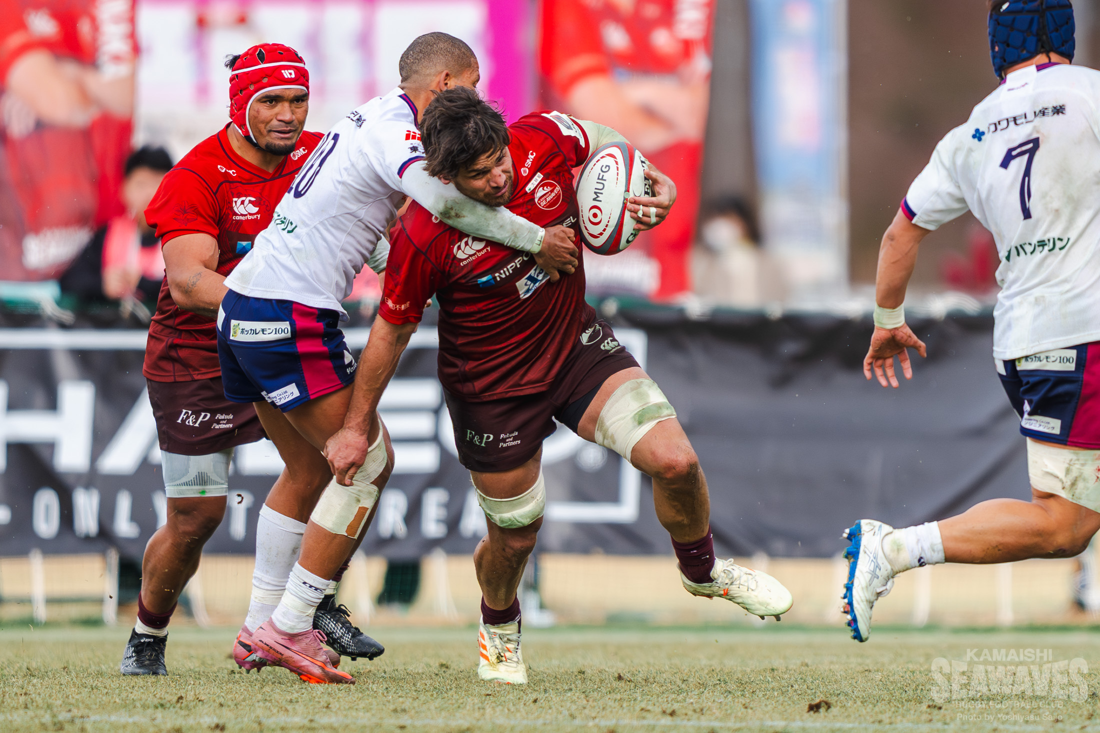 その後、時折花園Lのフィジカルの強さに押されそうになる場面はありましたが、釜石SWは粘り強いタックルで食らいつき、自陣深くへの侵入を許しません。逆に守備からテンポ良くアタックへ切り替え、エリアを大きく前進させると、トライライン目前まで何度も迫ります。敵陣深くの攻防で釜石SWは、壁のように立ちはだかる花園Lのディフェンスラインに果敢に挑んでいきますが、屈強なフィジカルを活かした花園Lのディフェンスをなかなか崩すことができず、攻め込みながらも得点をあげることができない時間が続きます。突破口を見出したのは前半25分。敵陣でのディフェンスでLOベンジャミン・ニーニー選手が相手のパスをインターセプトすると、ボールを広く展開。前がかかりになった相手ディフェンスの裏のスペースをCTBヘルダス・ファンデルヴォルト選手がキックパスで的確に突くと、これのパスに反応したWTB髙居海晴選手が大きく前進!最後はHO西林勇登選手が押し込みトライ!強風が吹き荒れるコンディションの中、ハント選手が難しい角度のコンバージョンキックを決めて10-7と逆転します。