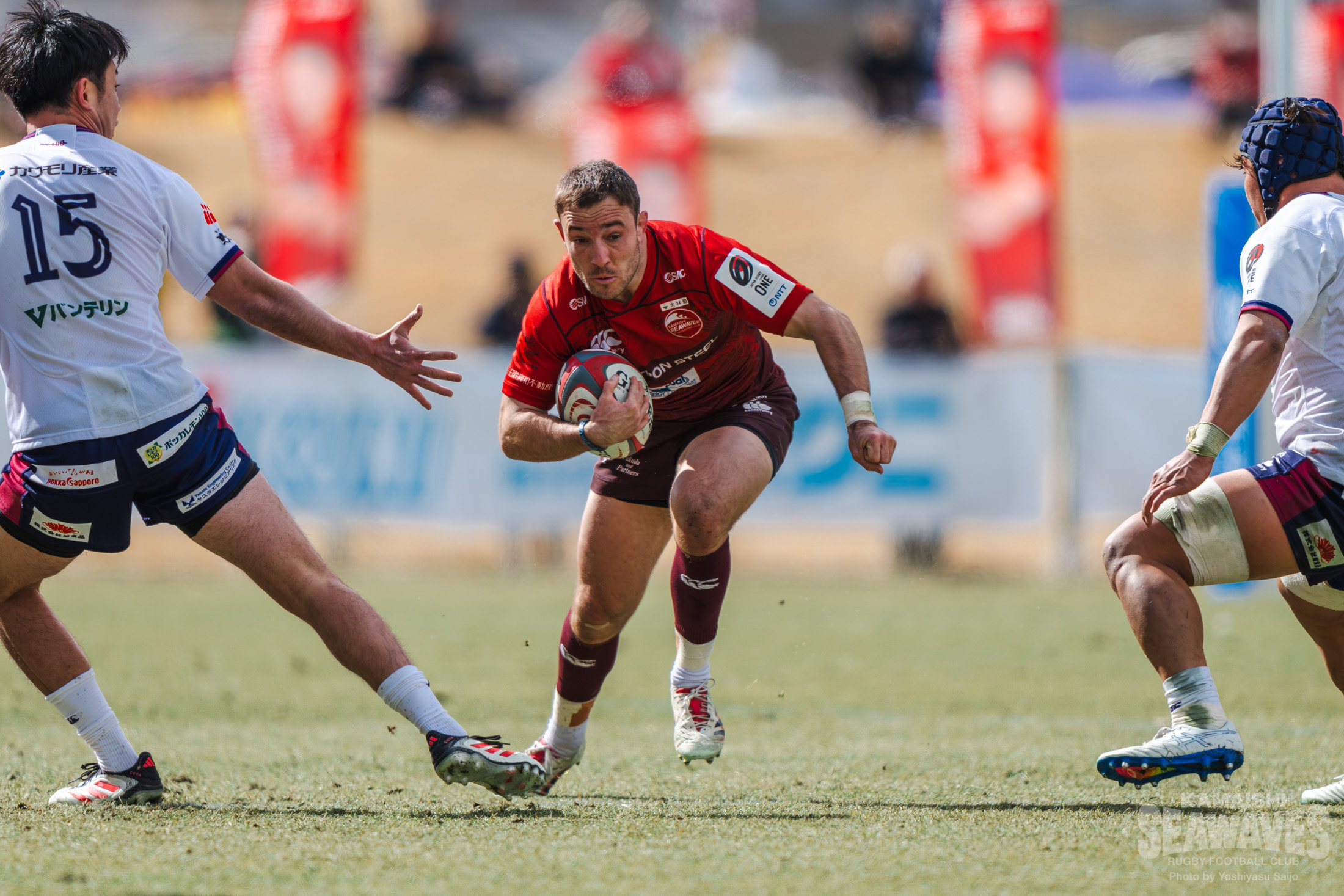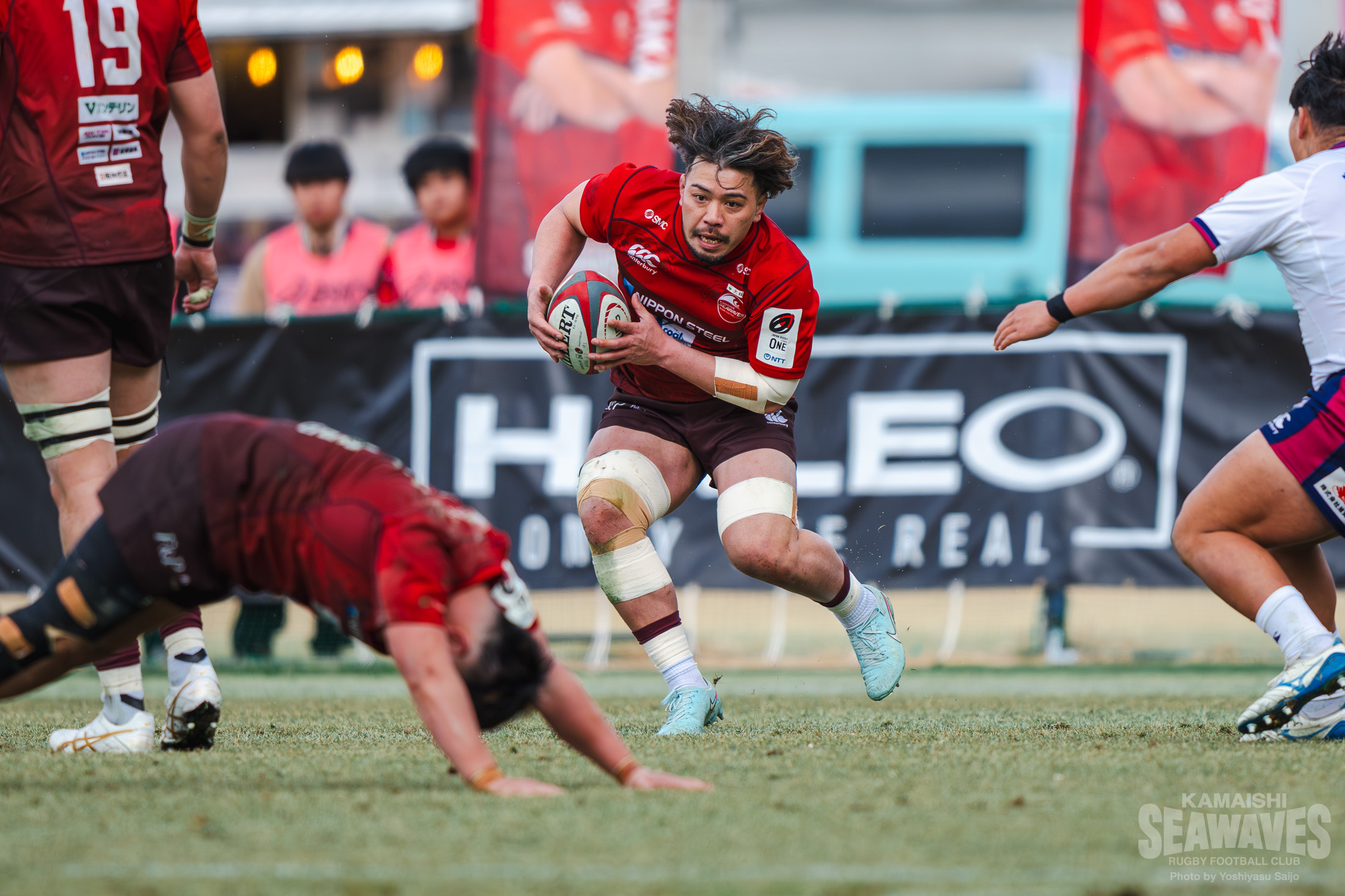 続く前半31分。花園Lに自陣までボールを運ばれますが、ファンデルボルト選手とNo.8サム・ヘンウッド選手が力強いダブルタックルでボールキャリアーを押し倒し、ペナルティを獲得します。このペナルティで得たラインアウトから素早くボールを展開すると、ハント選手のキックパスにCTBトンガ モセセ選手が飛び込み一度はトライの判定を受けます。しかし、TMOの結果相手選手が先にボールを抑えていたことが明らかとなりノートライとなります。