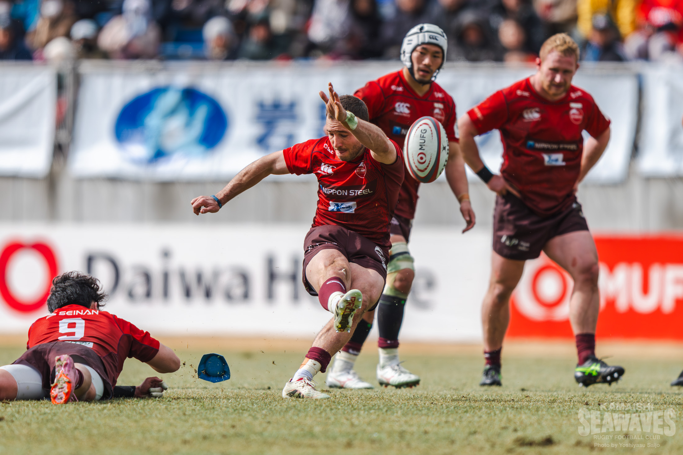 それでも風上に立つ釜石SWはすぐに反撃します。前半11分、相手陣22mライン付近でラインアウトのチャンスを得ると、モールで前進。そこで花園Lにオフサイドの反則を誘うとショットを選択します。SOミッチェル・ハント選手が正面からのキックを正確に決めて3点を返し、スコアを3-7とします。