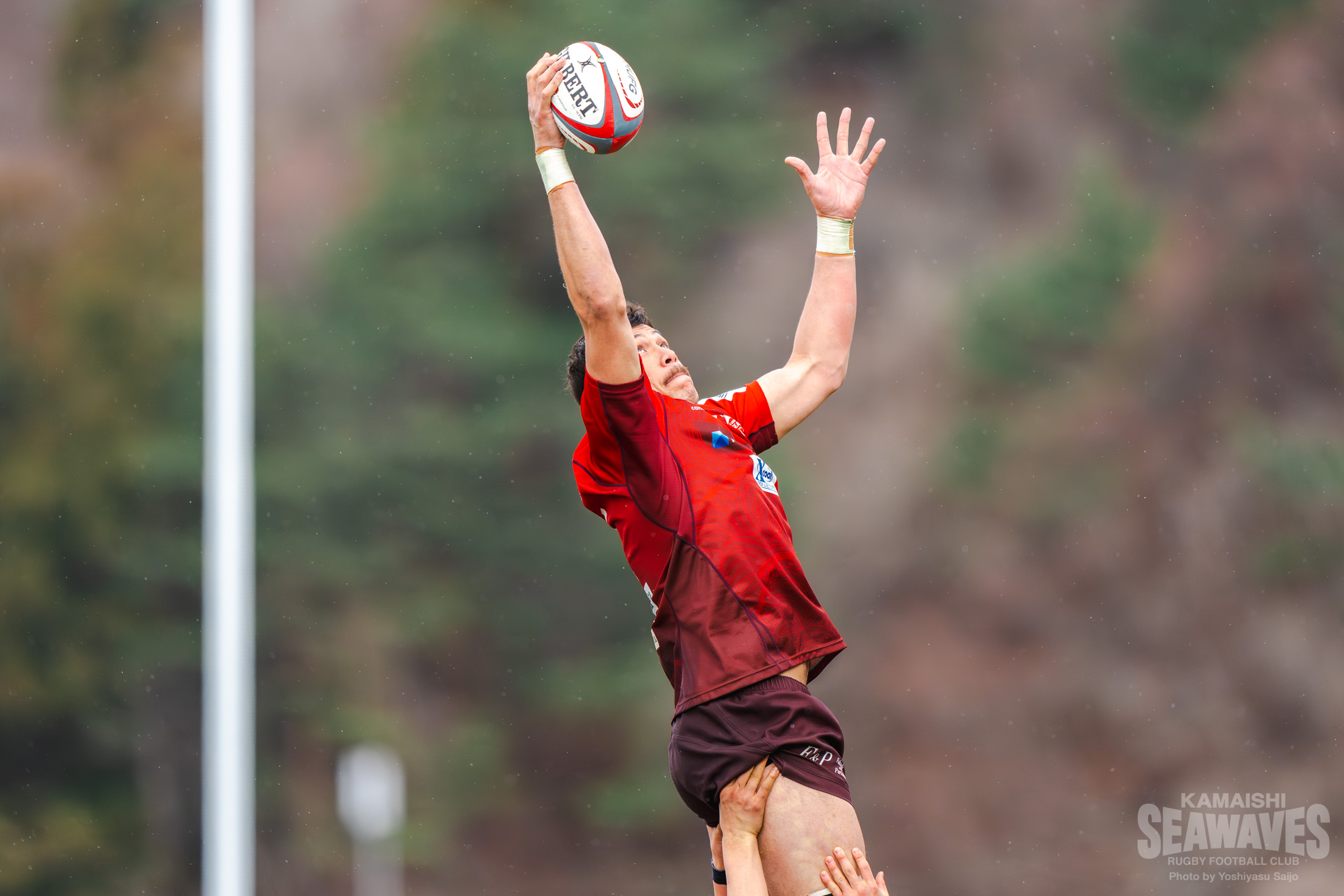 後半は釜石SWのキックオフで再開します。後半開始すぐの時間帯、それまでの風向きとは反対方向の風が吹き始めたこともあってキックの蹴り合いの結果、釜石SWは敵陣でラインアウトを得ます。このラインアウトからモールを形成し前進すると、SH南篤志選手の仕掛けから髙居選手、西林選手、ヘンウッド選手と前進しながらボールを繋ぎ、最後はFL髙橋泰地選手が押し込みトライ!これで釜石SWは3連続トライとなり、スコアを25-7とします。