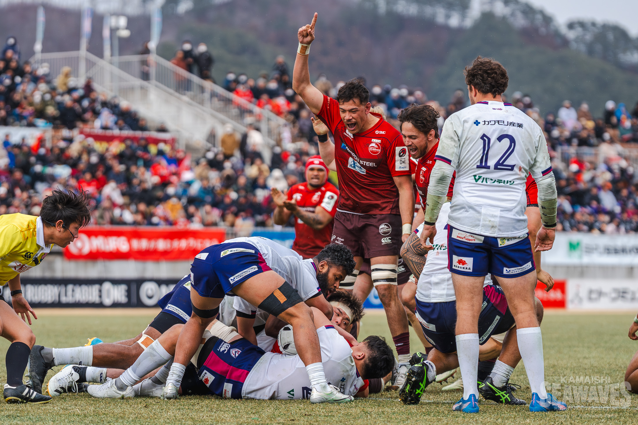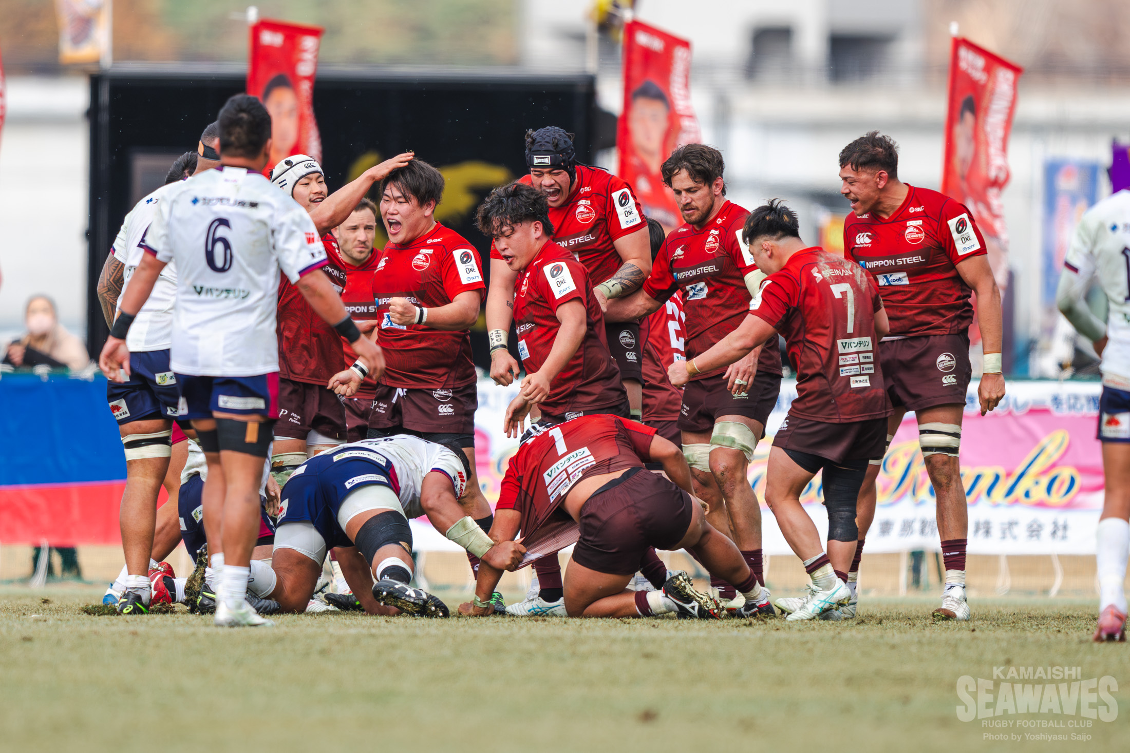 それでも後半14分、釜石SWは敵陣で途中出場のPR高橋璃玖選手が見事なスティールに成功!敵陣左サイドでのラインアウトからの展開で西林選手、ヘンウッド選手が力強いボールキャリーを見せると、花園Lはたまらずペナルティ。このペナルティは故意に反則を犯したと判断されて花園Lの選手にイエローカードが提示されます。敵陣深くでラインアウトのチャンスを得た釜石SWは、クリーンキャッチから形成したモールを一気にプッシュ!そして、この試合でリーグワン50試合目の出場となったFL河野良太選手がボールを持ち込みトライ!30-17と再び点差を広げ、イヤな流れを断ち切ります。