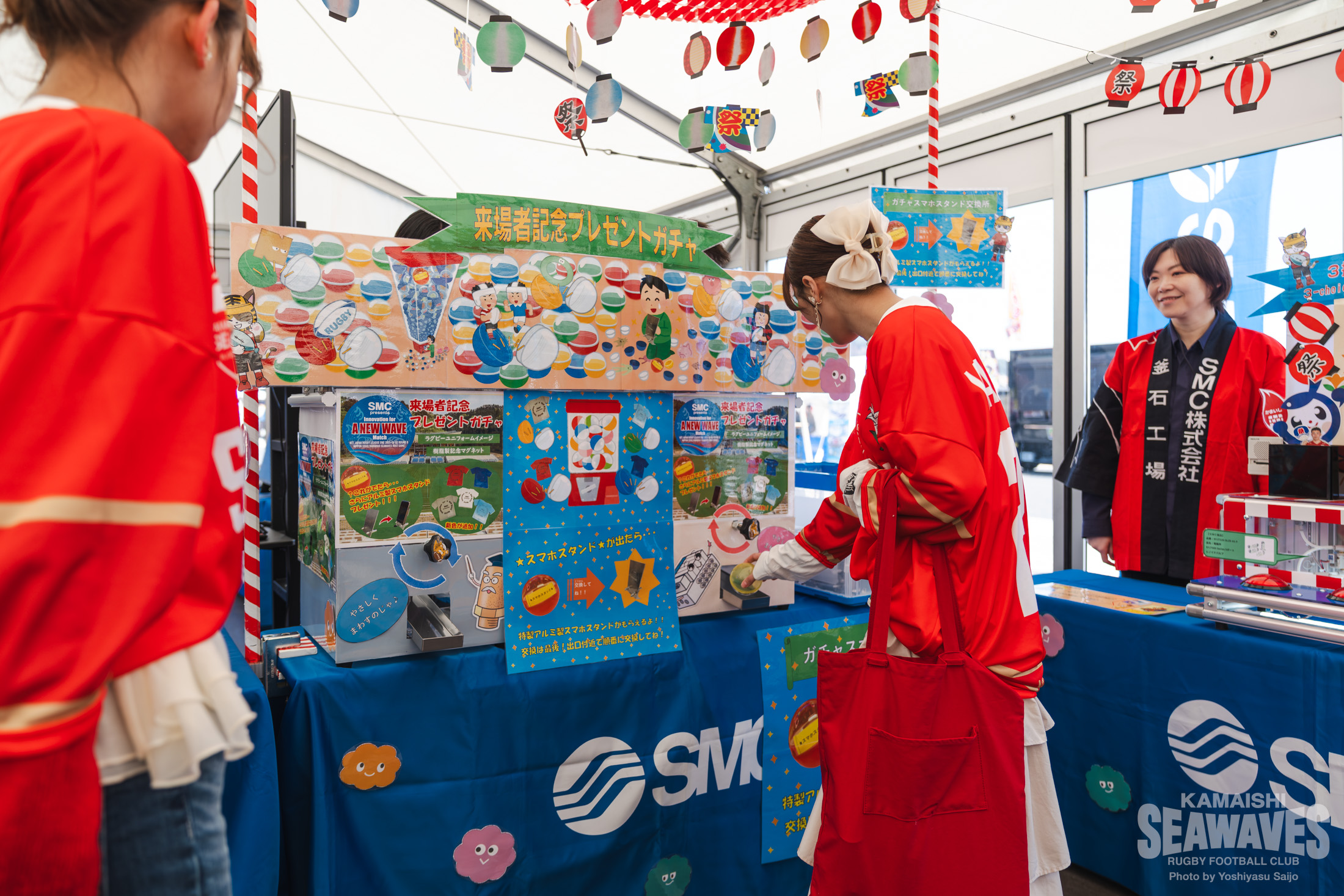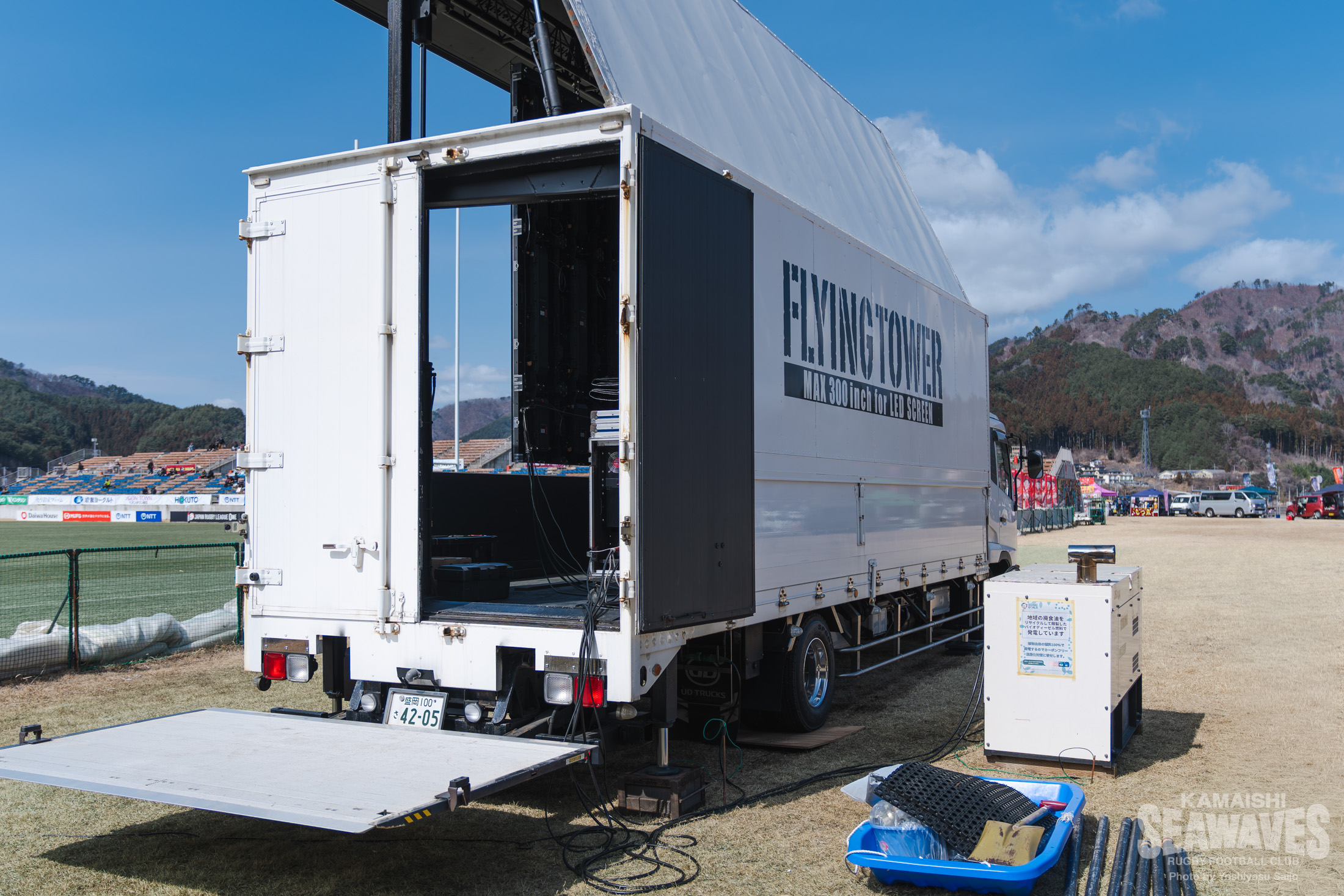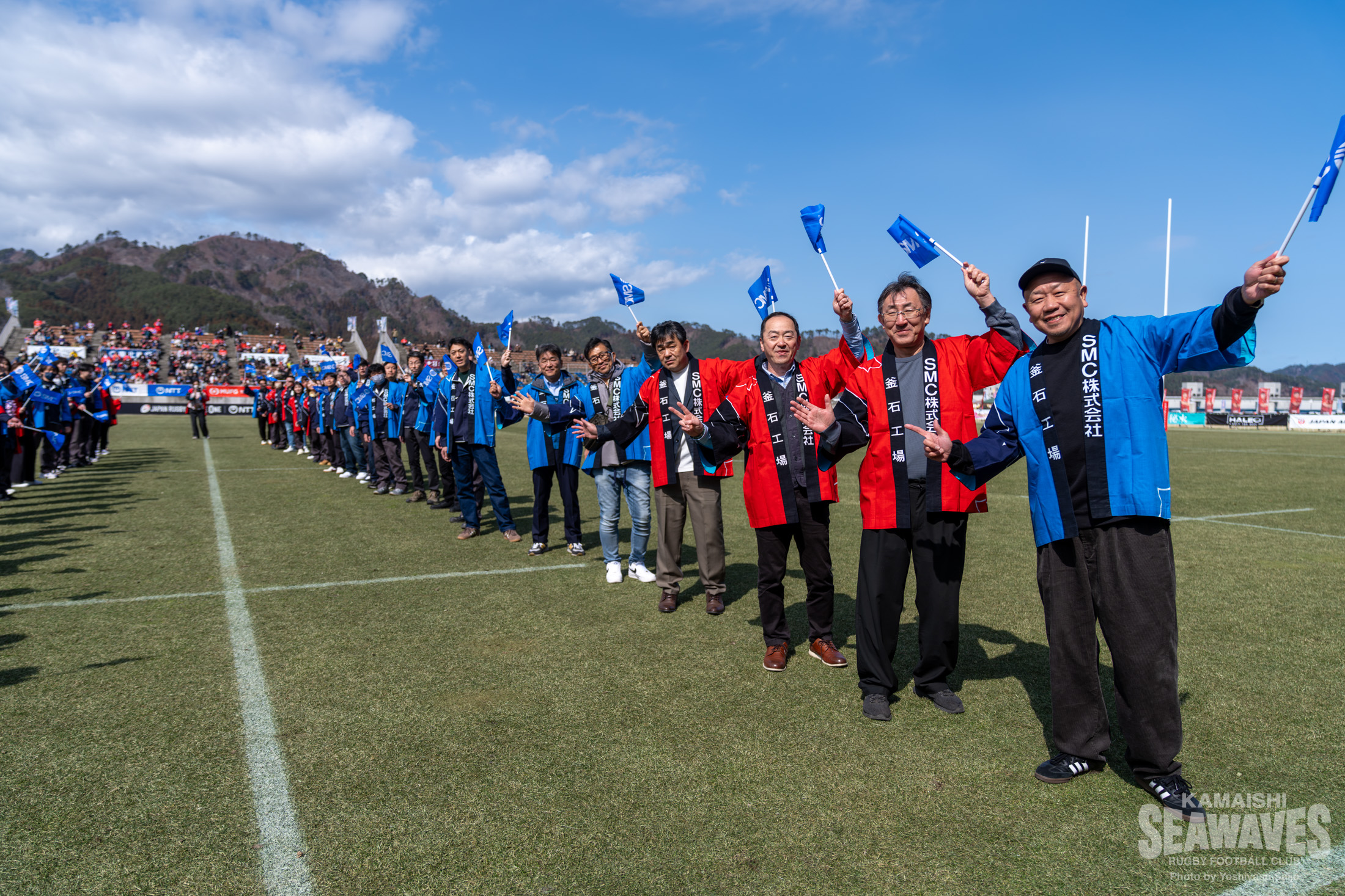 「SMC presents Innovation for A NEW WAVE Match」というマッチデータイトルがつけられた今節には、1,914人のファンの方に来場いただきました。やや風はあるものの晴天に恵まれたコンディションの中で試合が始まりました。釜石SWは風下に立ち、海側から山側へ攻め込みます。