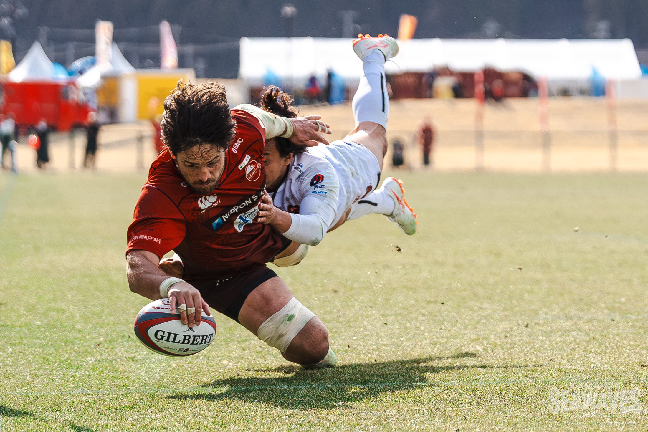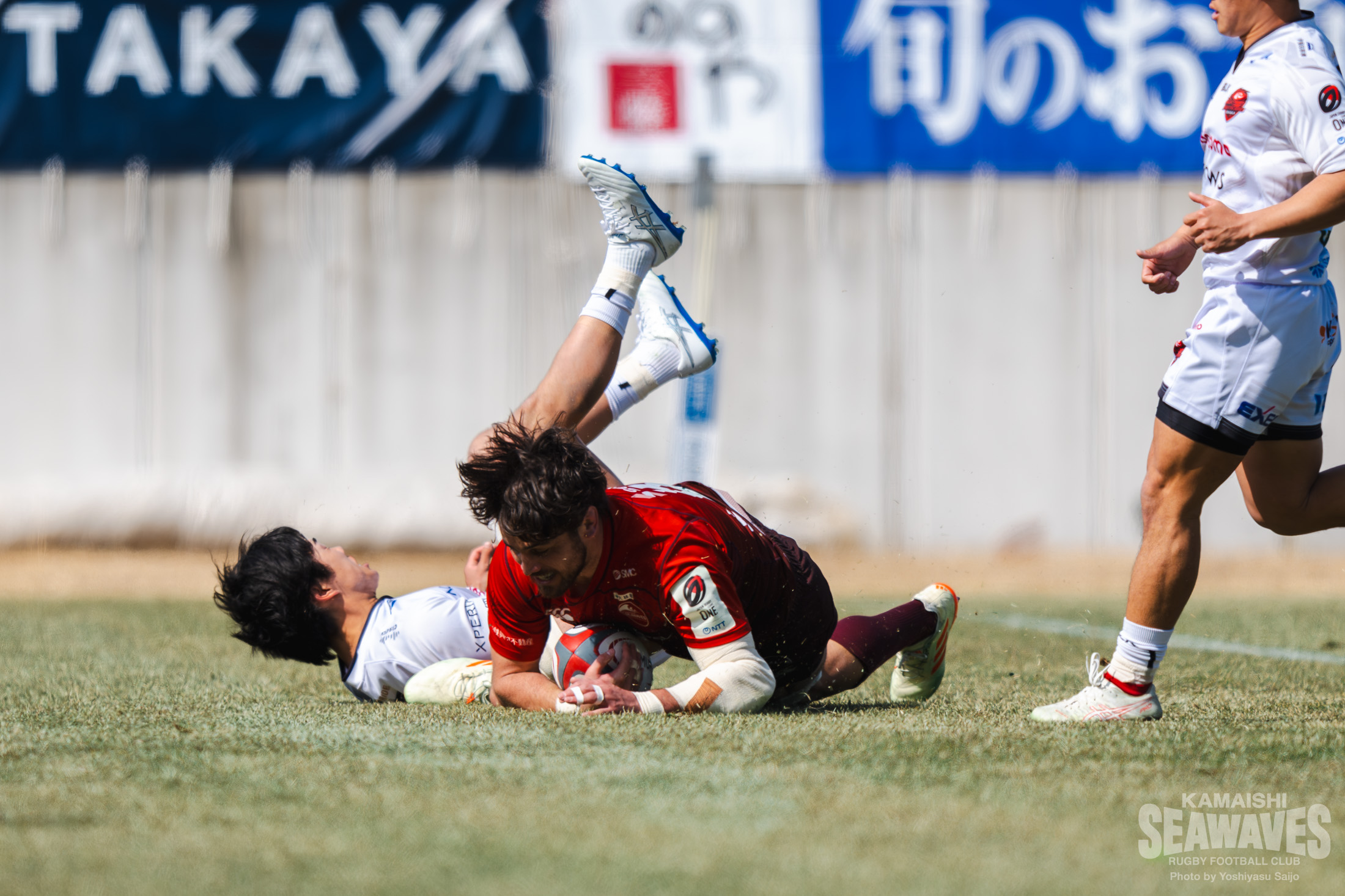 それでも釜石SWは直後のプレーで流れを引き戻します。WTB髙居海晴選手のキックが相手に当たってこぼれたボールをFB落和史選手が拾うと、そこから一気に鋭く前進。CTBトンガ モセセ選手へつなぎ、さらにサポートに入ったNo.8サム・ヘンウッド選手がパスを受けてトライ!スコアを14―5とし、再びリードを広げます。