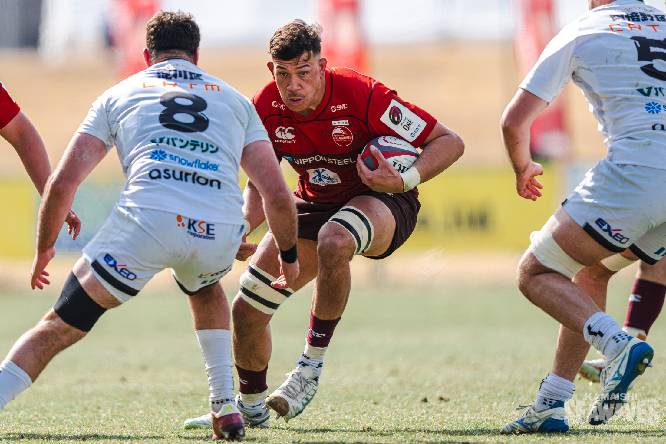 後半は両チームともメンバー交代なしでスタート。序盤はキックの蹴り合いとなる中、SOミッチェル・ハント選手がライン際へ絶妙なキックを蹴り込み、敵陣でマイボールラインアウトを獲得します。ここからSH南篤志選手が中央へ落とすキックを見せ、トライを狙いますが、グラウンディングには至らずゴールラインドロップアウトとなります。
