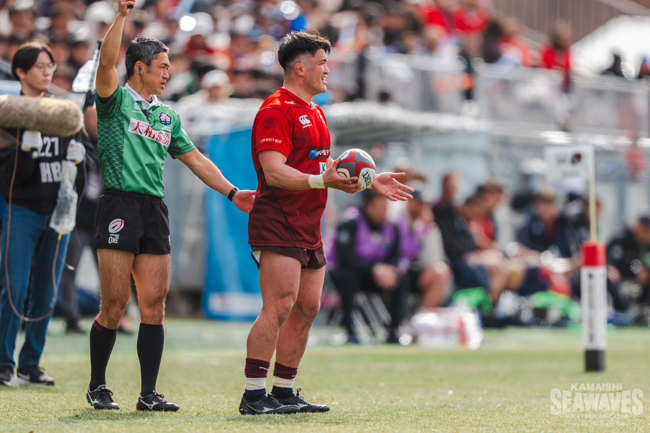 釜石SWもすぐに反撃を試み、相手の反則を誘って相手陣でラインアウトを獲得。左サイドへ展開してチャンスを作りかけますが、スローフォワードの判定を受けて攻撃が途切れました。
