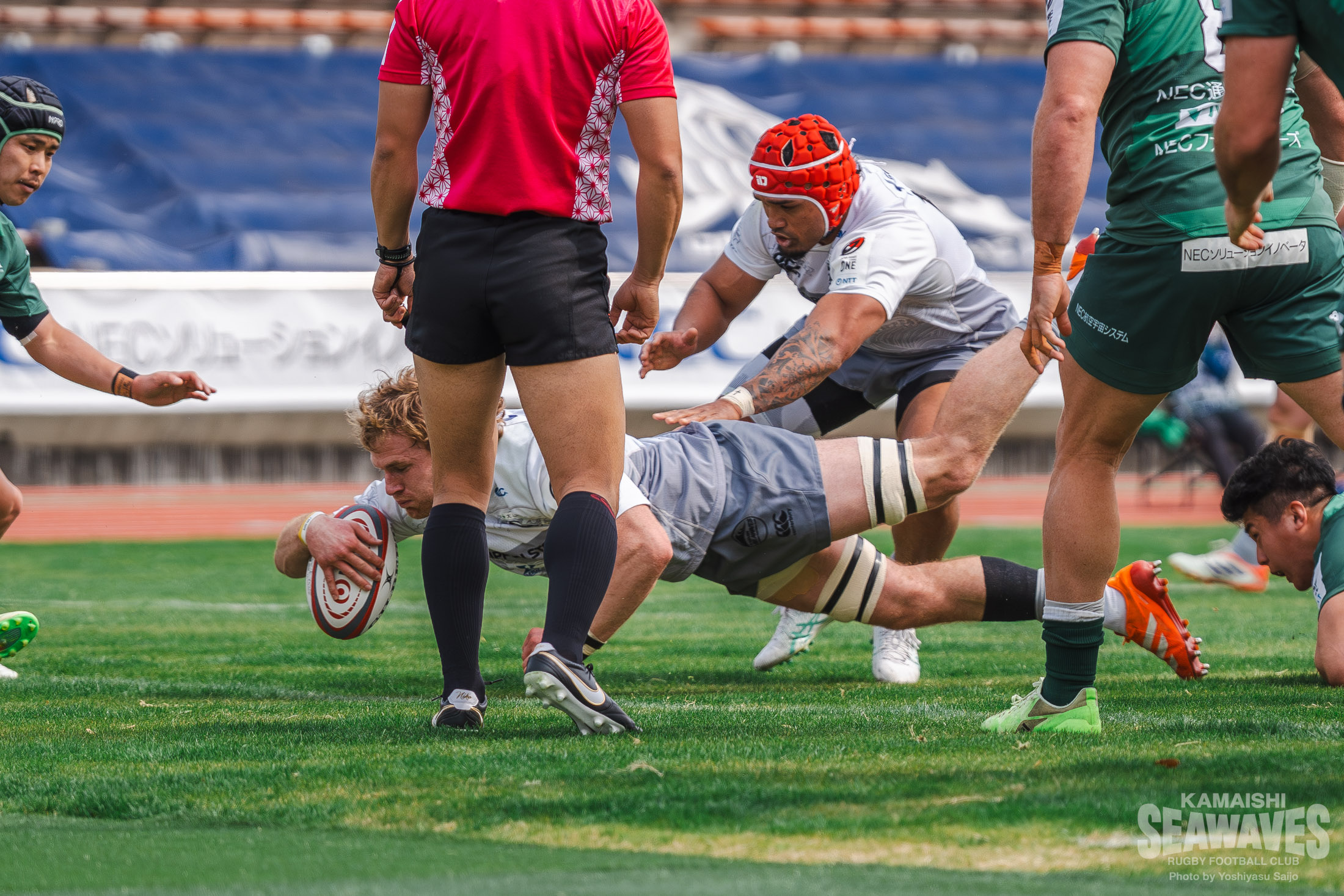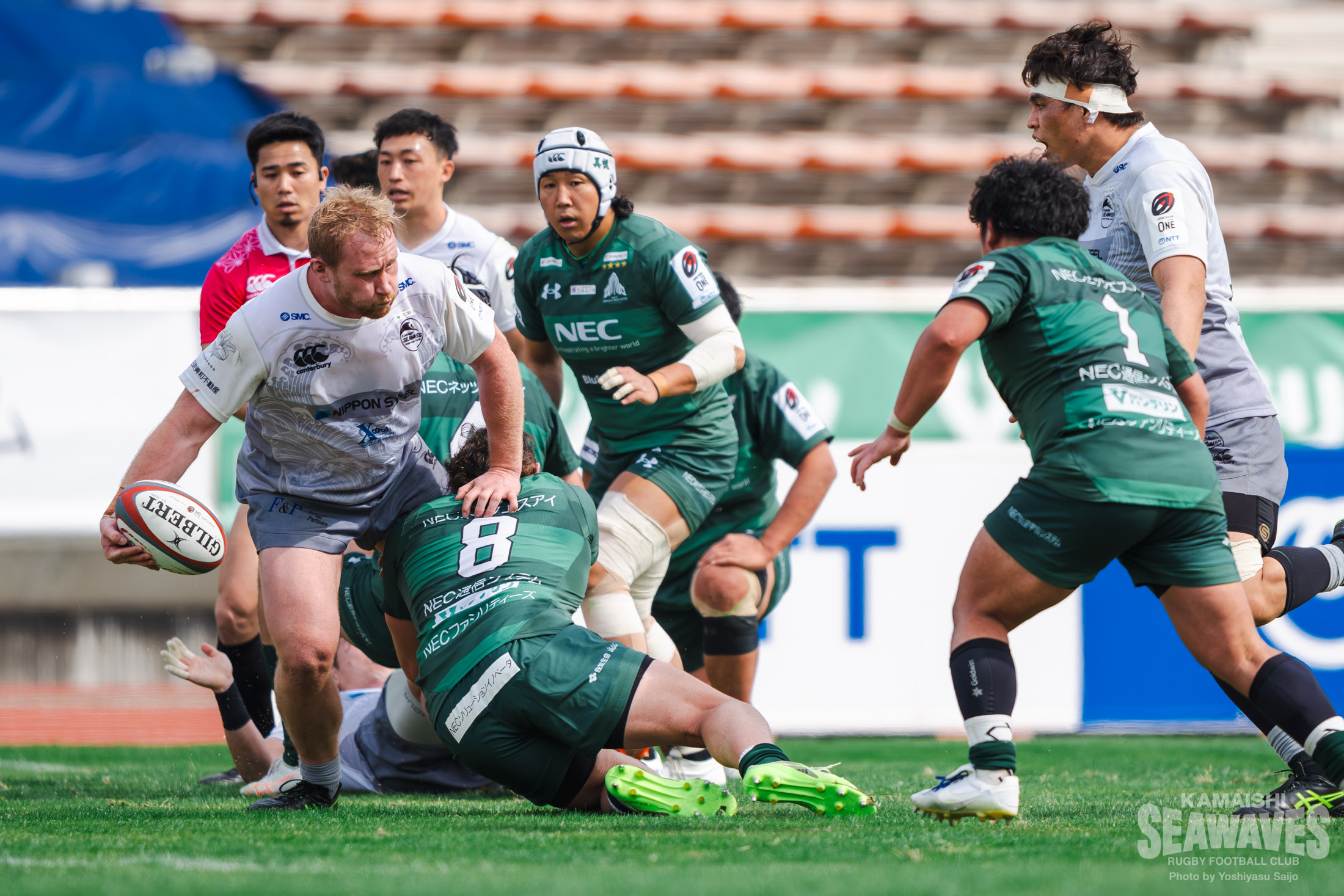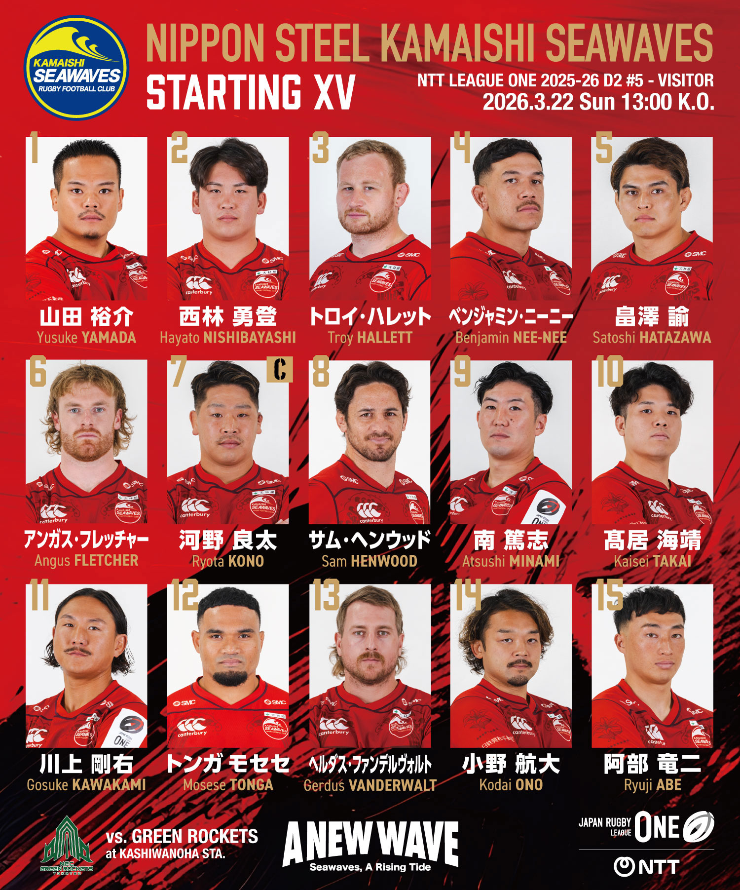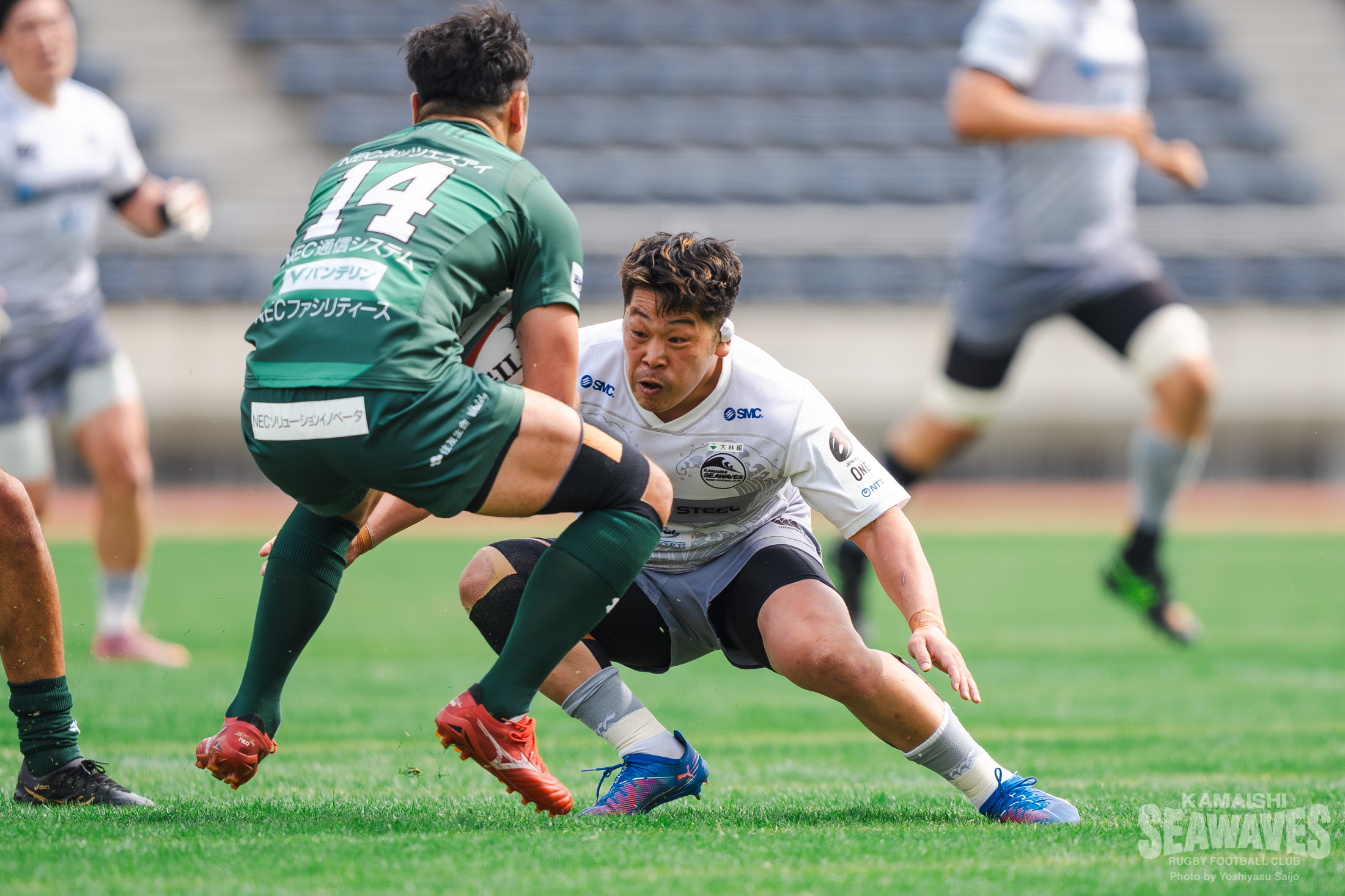 ジャパンラグビーリーグワン2025-26ディビジョン2第5節が3月22日(日)、柏の葉公園総合競技場で行われ、日本製鉄釜石シーウェイブス(以下、釜石SW)はNECグリーンロケッツ東葛(以下、GR東葛)と対戦しました。延期となっていた一戦は約1カ月半の時間を経て実現しましたが、釜石SWは14―54で敗れました。