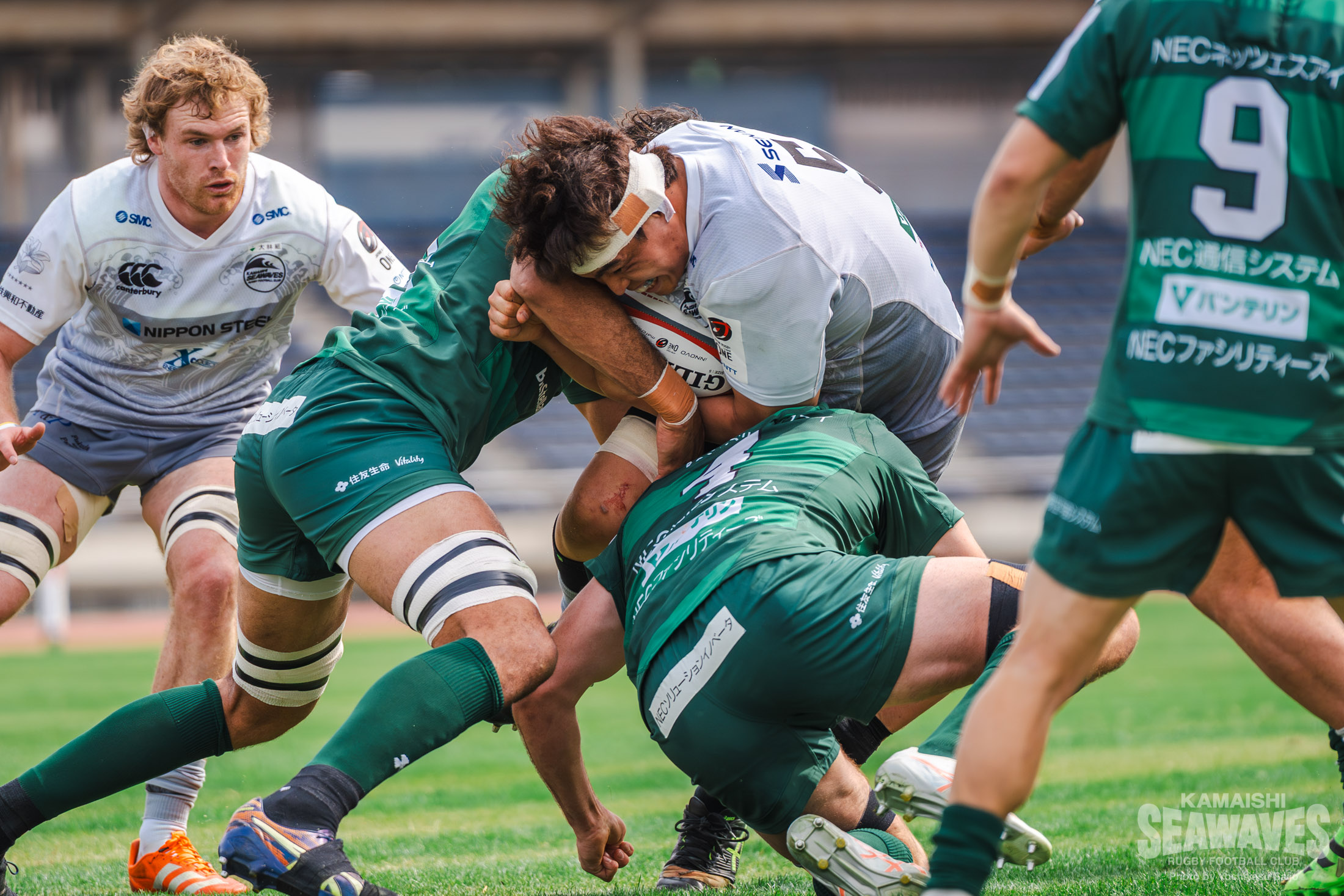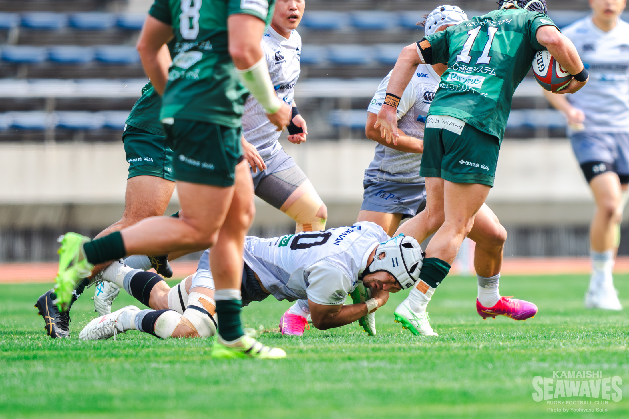 さらに前半22分、釜石SWはミドルゾーンでのアタック中にパスミスからボールを失い、自陣でターンオーバーを許すと、これを起点に攻め込まれトライを献上。7―14と逆転されます。