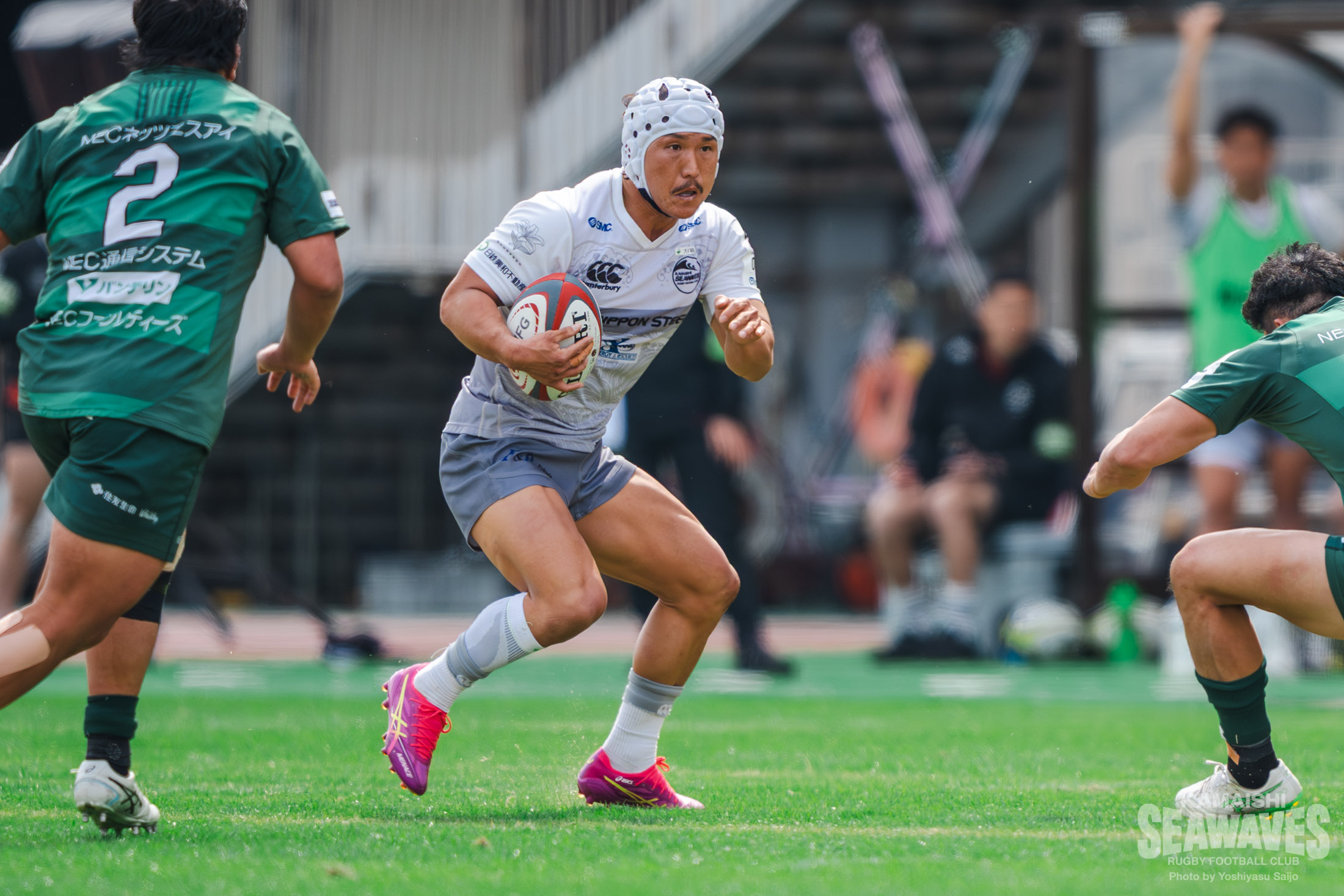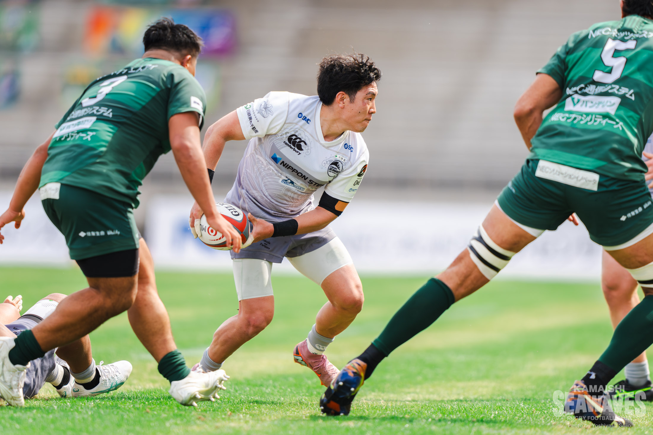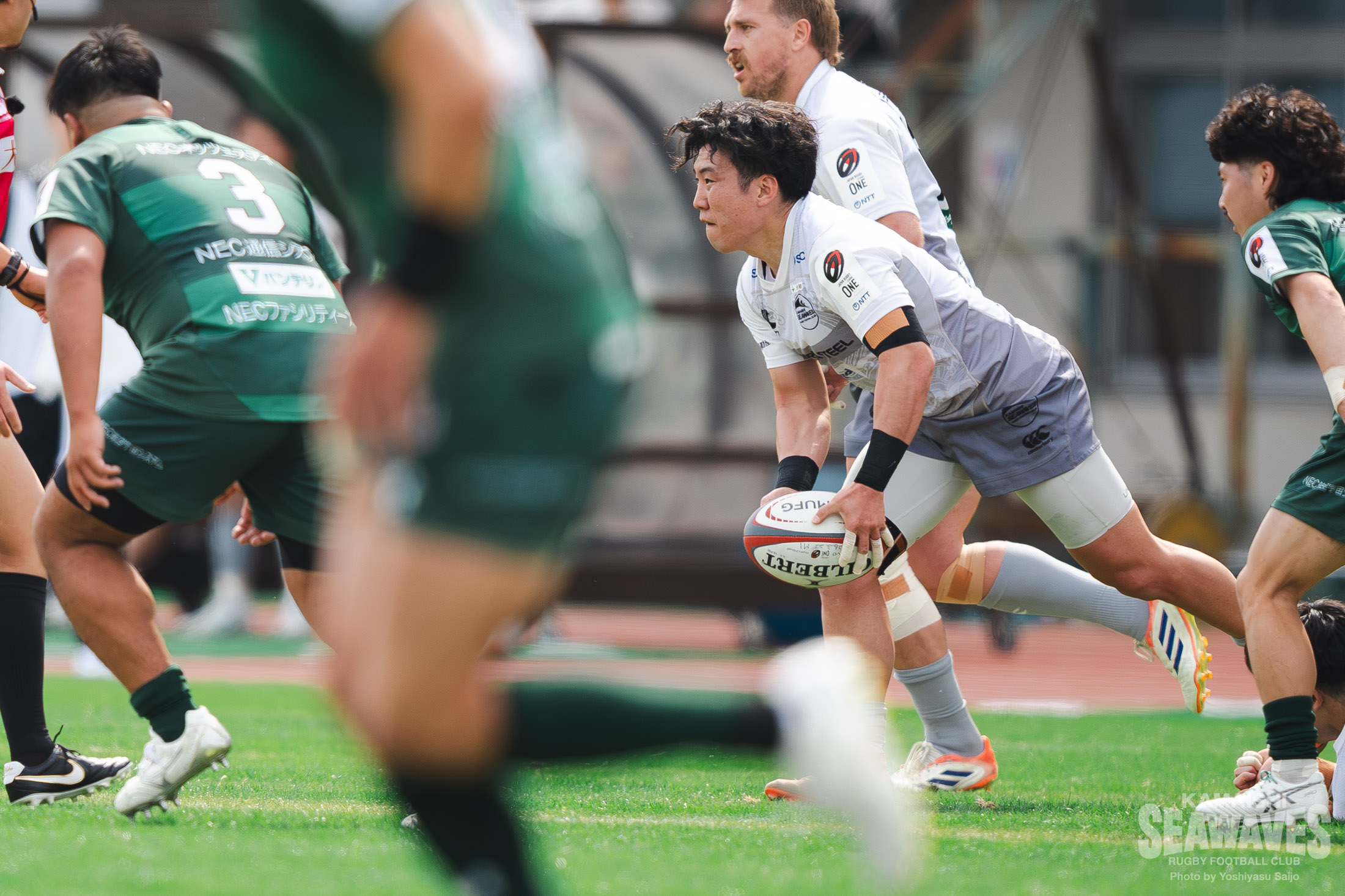 この試合の序盤、FBで起用された阿部竜二選手と髙居選手がキックゲームで存在感を発揮します。正確なキャッチとキックで相手に主導権を握らせず、徐々にエリアを押し上げていきます。そして前半5分には髙居選手のキックを起点に敵陣22mライン内側へ侵入しますが、ここはGR東葛の粘り強いディフェンスに阻まれ、得点には至りません。