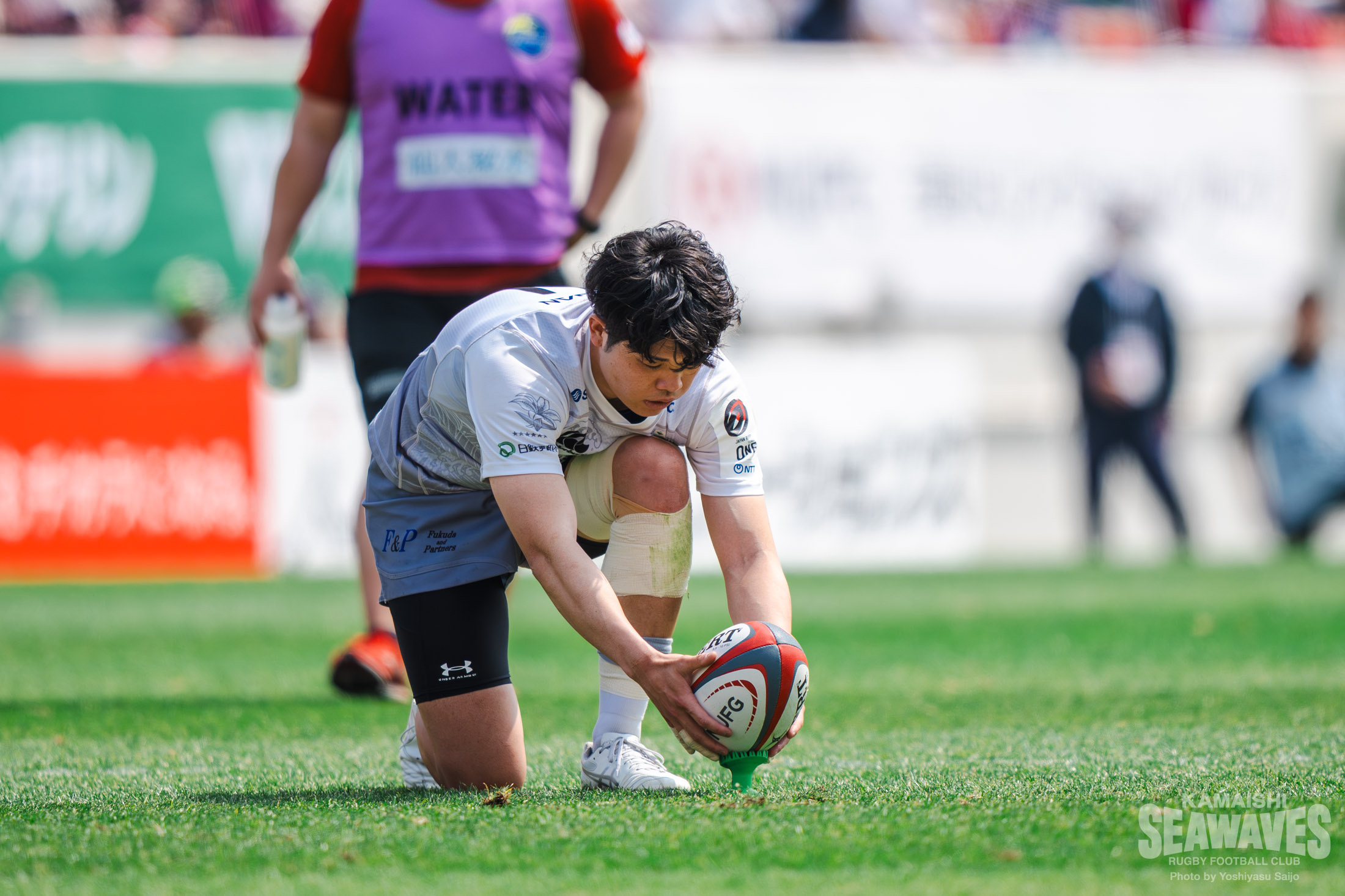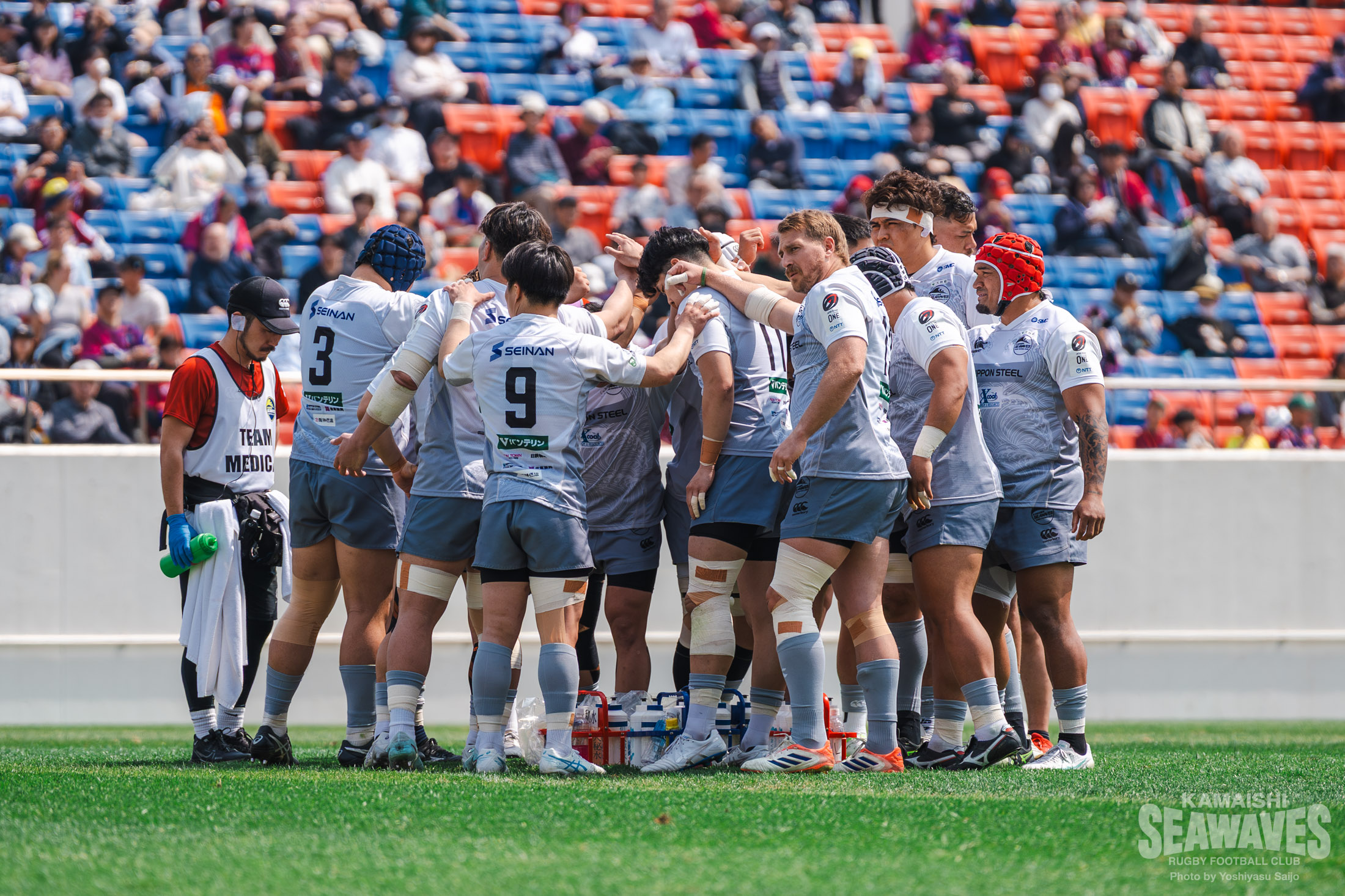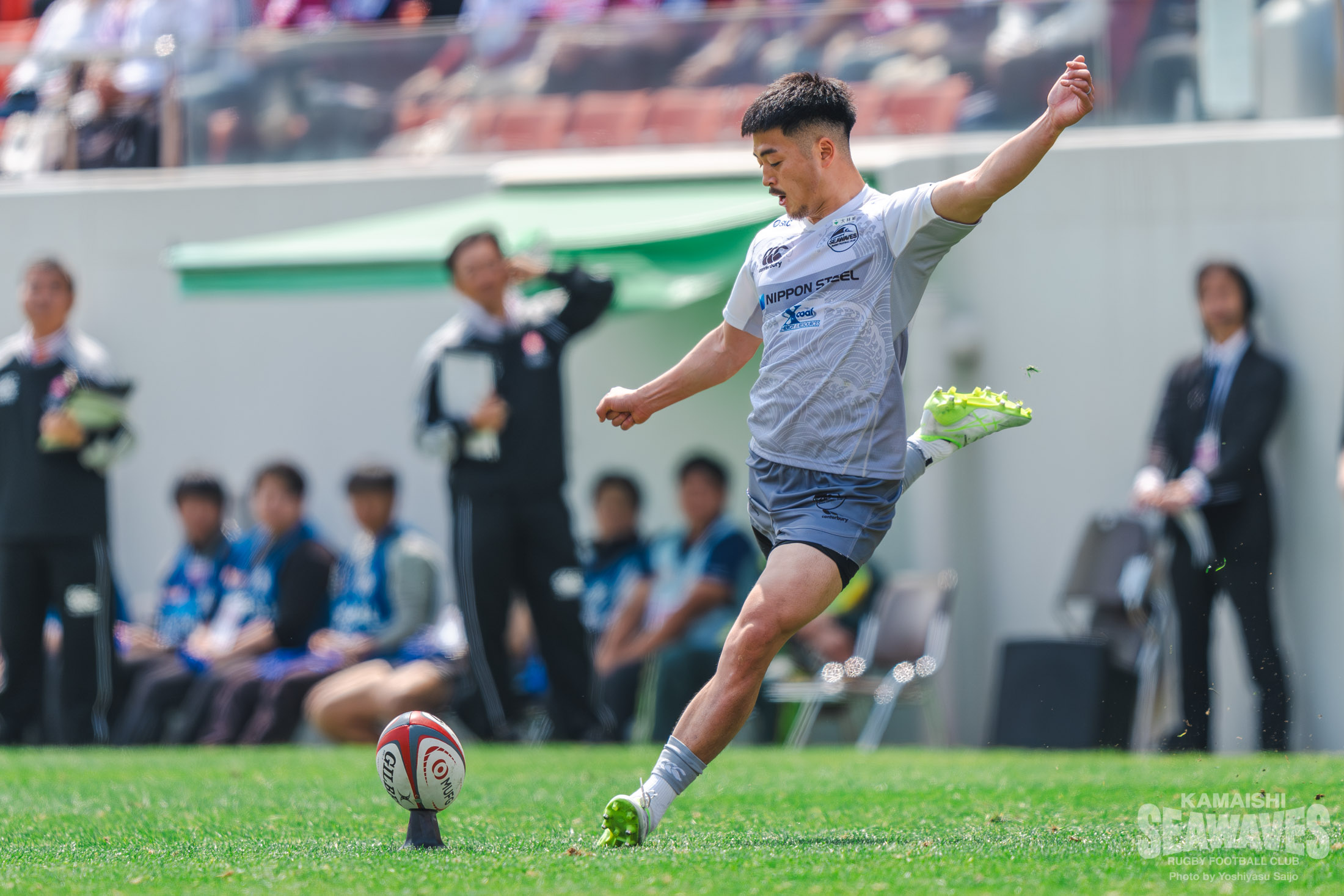 釜石SWは前節に続き、ミッチェル・ハント選手がメンバー外となり、SOには落和史選手が入りました。FBには阿部竜二選手が入り、さらに前節SOで出場した髙居海晴選手がウイングに回るなど、バックスラインに変化を加えて試合に臨みました。