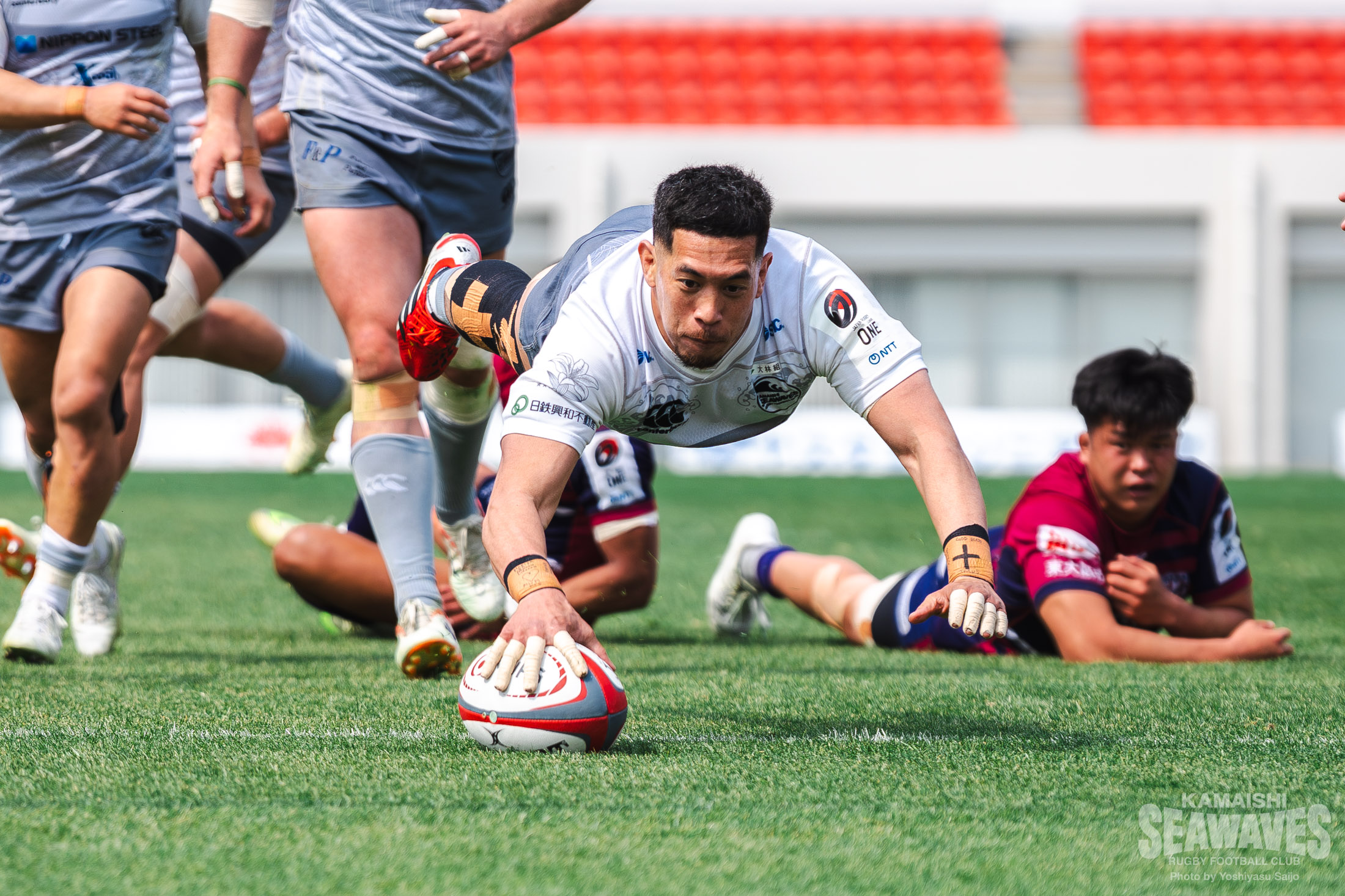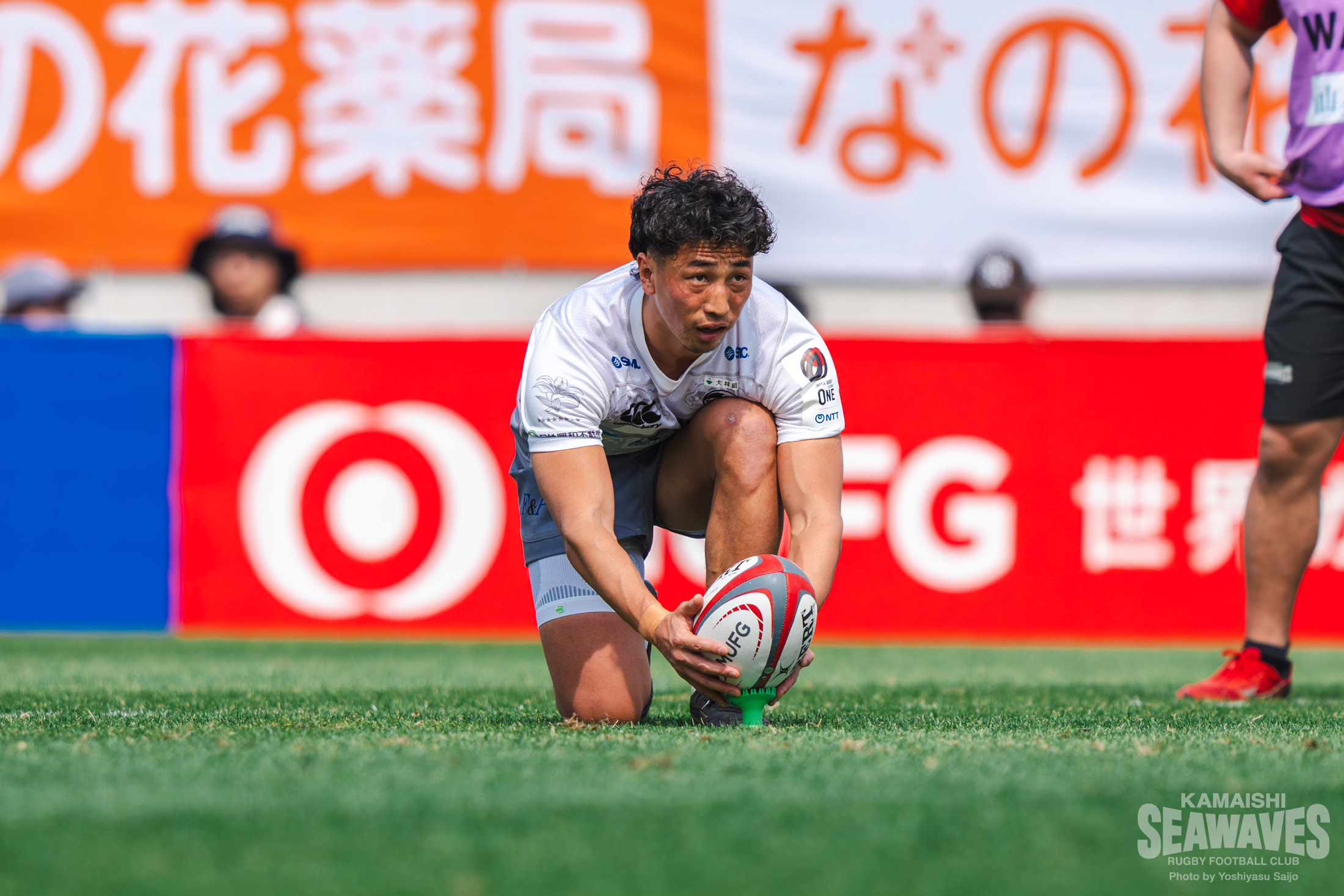 それでも前半ラストプレーでフェーズを重ねたアタックをみせると、CTBトンガ モセセ選手が右サイドでゲイン。ここから得たラインアウトを起点にテンポよくボールを動かし、最後は河野選手がこの試合2本目のトライを挙げます。12-33と点差を縮め、反撃の気配を残して前半を終えました。