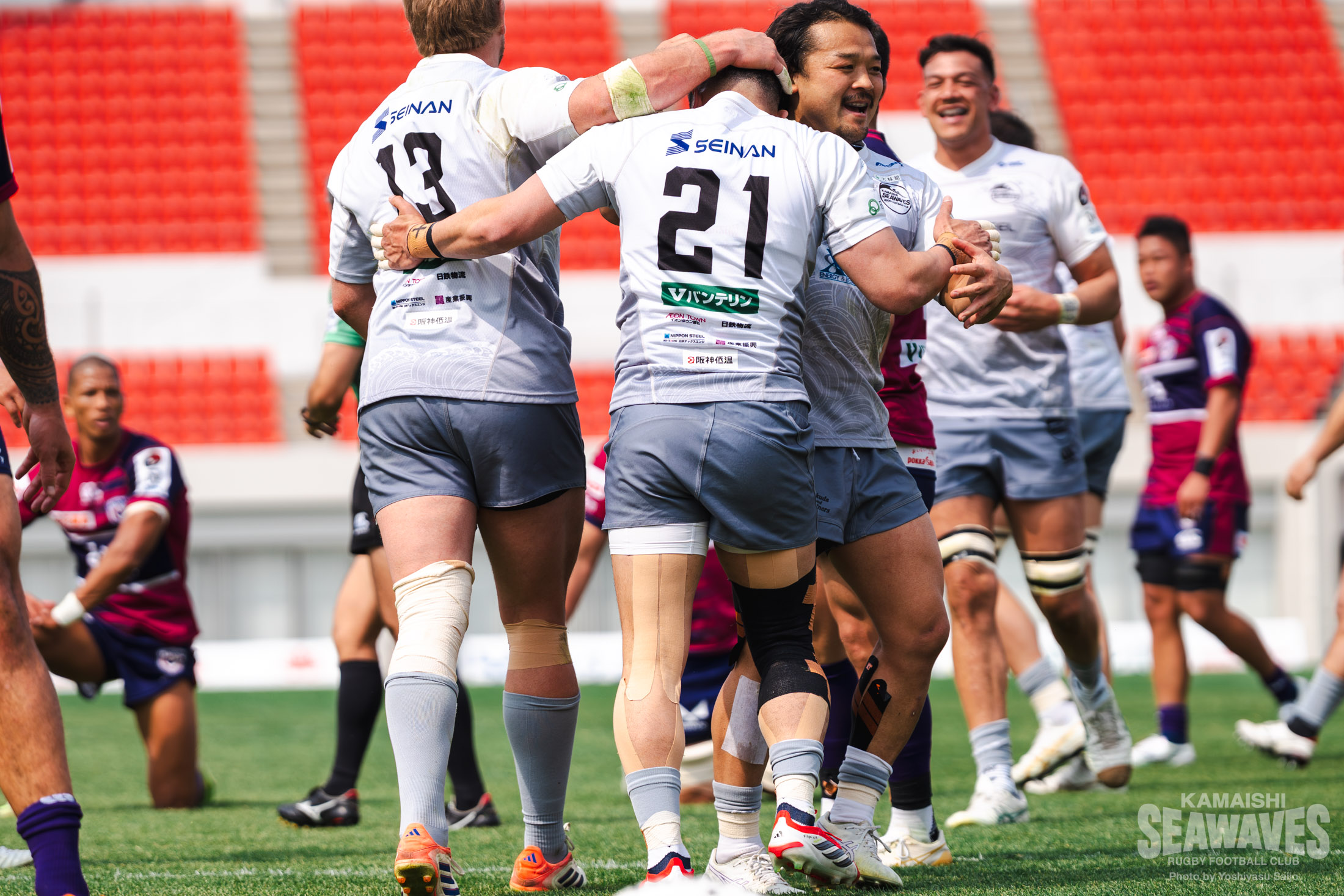 さらに後半30分、相手陣内深くでのスクラムからSH岡新之助タフォキタウ選手が鋭いランでディフェンスを突破し、そのままトライ!続く後半32分には、自陣からのカウンターで落選手がブレイクし、ファンデルヴォルト選手へつなぎ連続トライ。スコアを31-52として粘り強さを見せました。