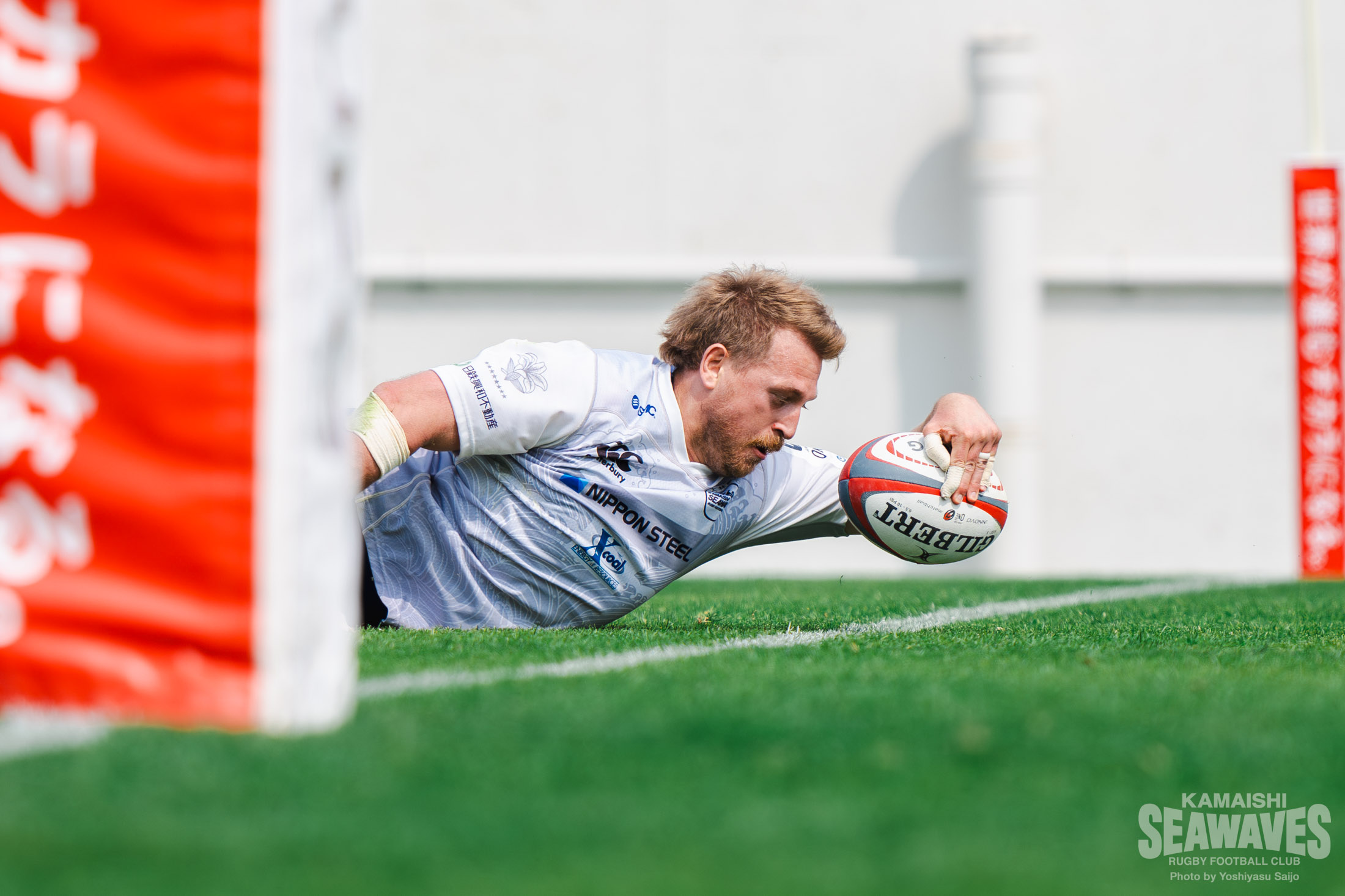 それでも釜石SWは崩れません。前半15分、相手のノックフォワードから得たスクラムを起点に反撃を試みると、この日はスクラムで優位性を発揮。前半19分にはハーフウェイライン上でのスクラムでコラプシングを誘い、ペナルティを獲得します。PR野口大貴選手を中心に安定したセットピースを軸に敵陣へ侵入すると、ラインアウトからモールで前進。中央へ展開しながら粘り強くフェーズを重ね、前半22分、最後はFL河野良太選手がトライを決め、5-21と反撃します。