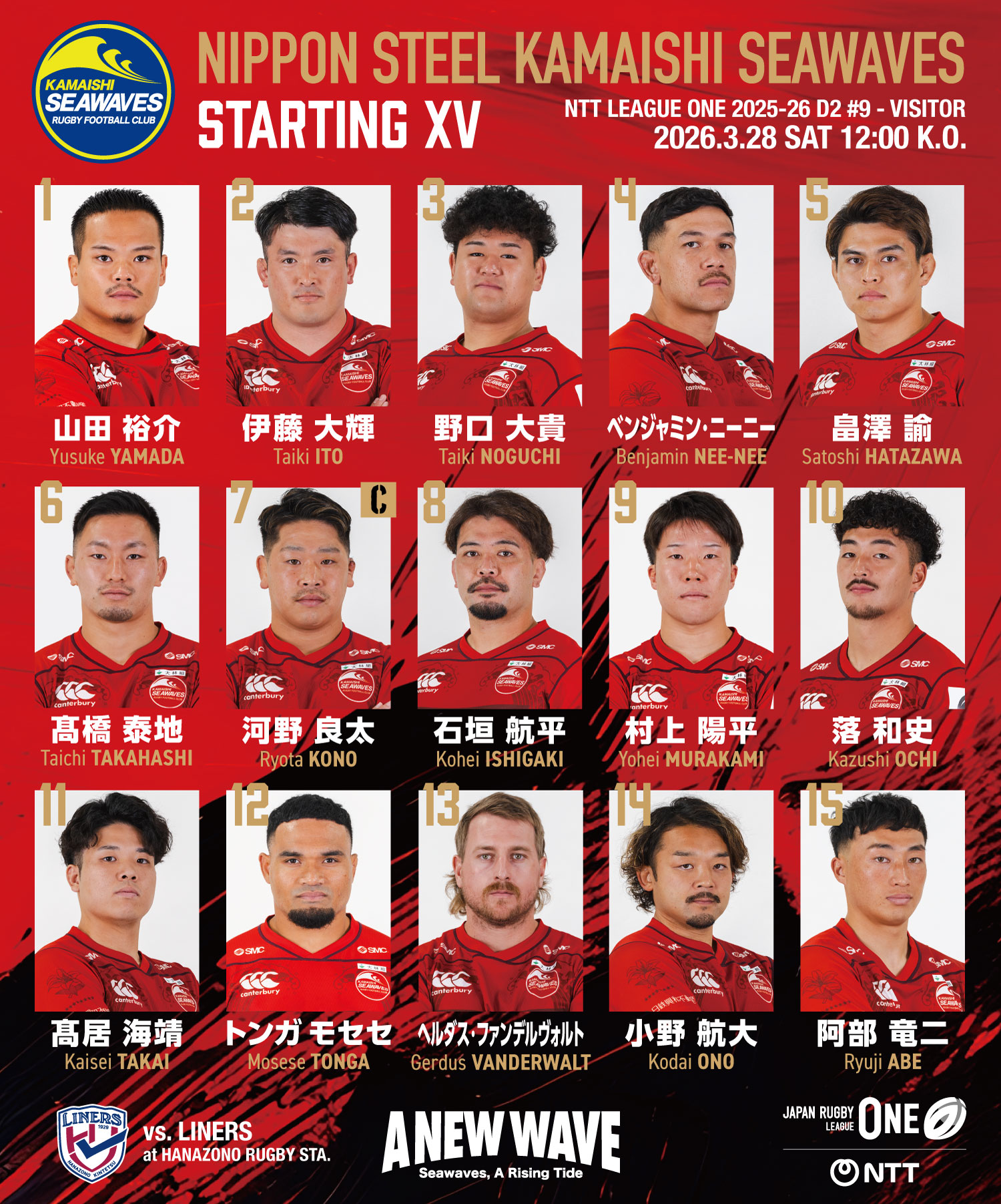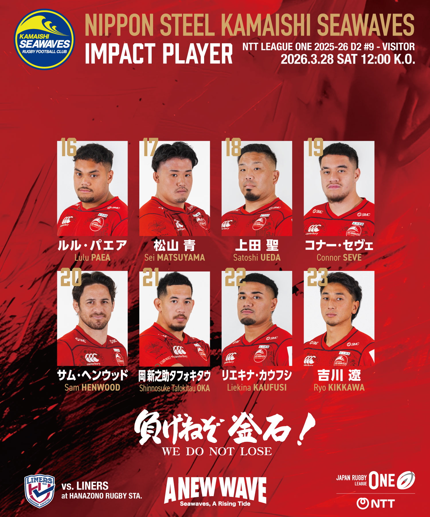 ジャパンラグビーリーグワン2025-26ディビジョン2第9節が、3月28日(土)、東大阪市花園ラグビー場で行われ、日本製鉄釜石シーウェイブス(以下、釜石SW)は花園近鉄ライナーズ(以下、花園L)と対戦し、31-59で敗戦を喫しました。