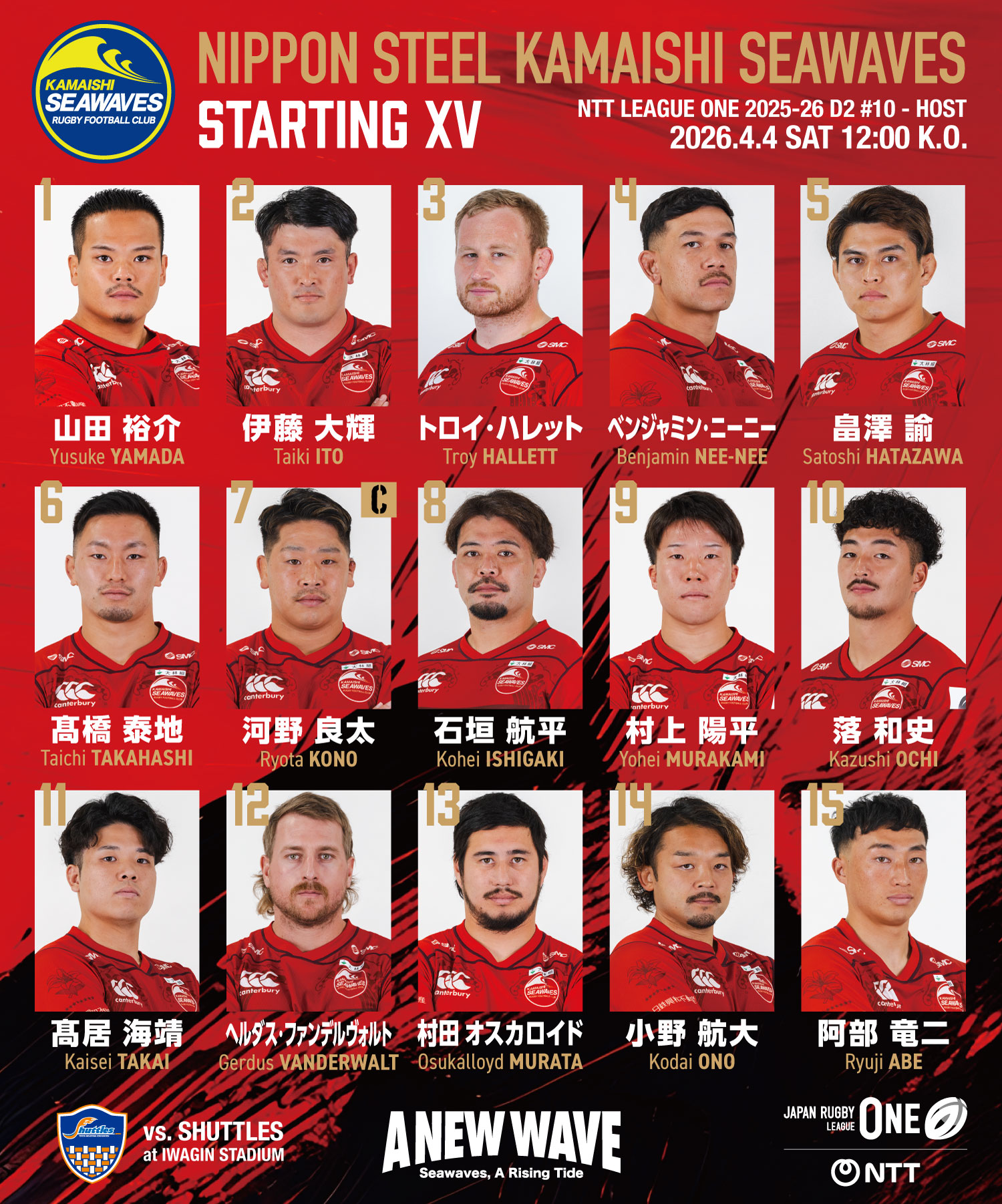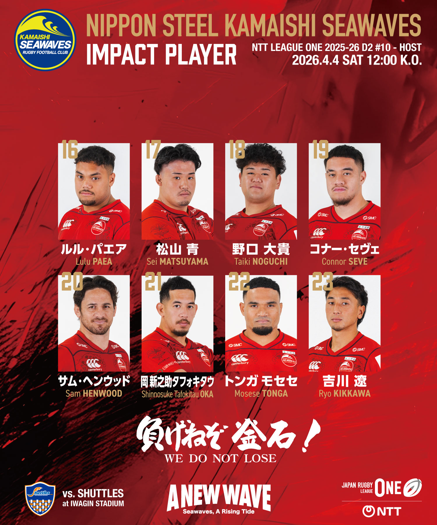 ジャパンラグビーリーグワン2025-26ディビジョン2第10節が、4月4日(土)、いわぎんスタジアムで行われ、日本製鉄釜石シーウェイブス(以下、釜石SW)は豊田自動織機シャトルズ愛知(以下、愛知S)と対戦し、27-52で敗れました。