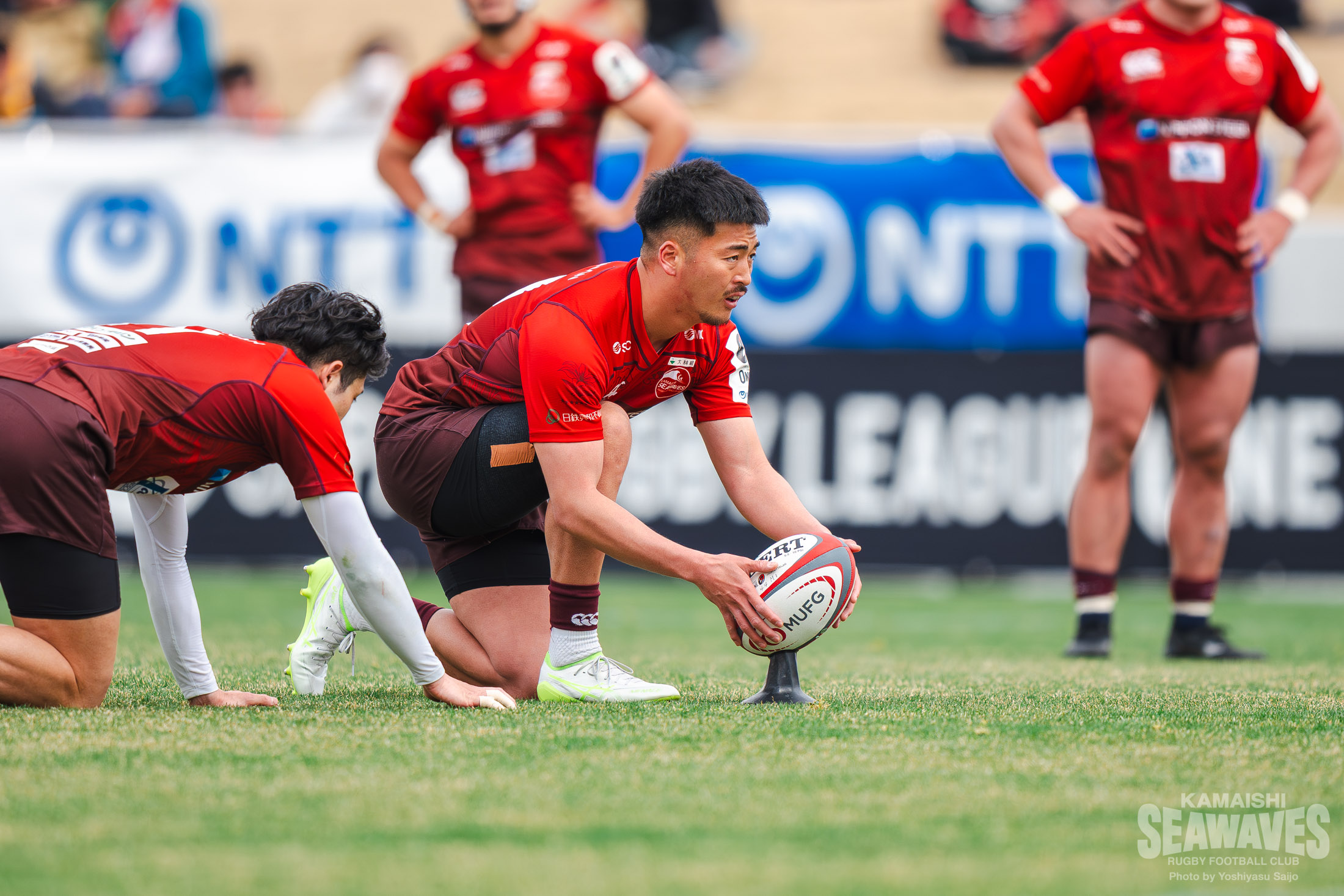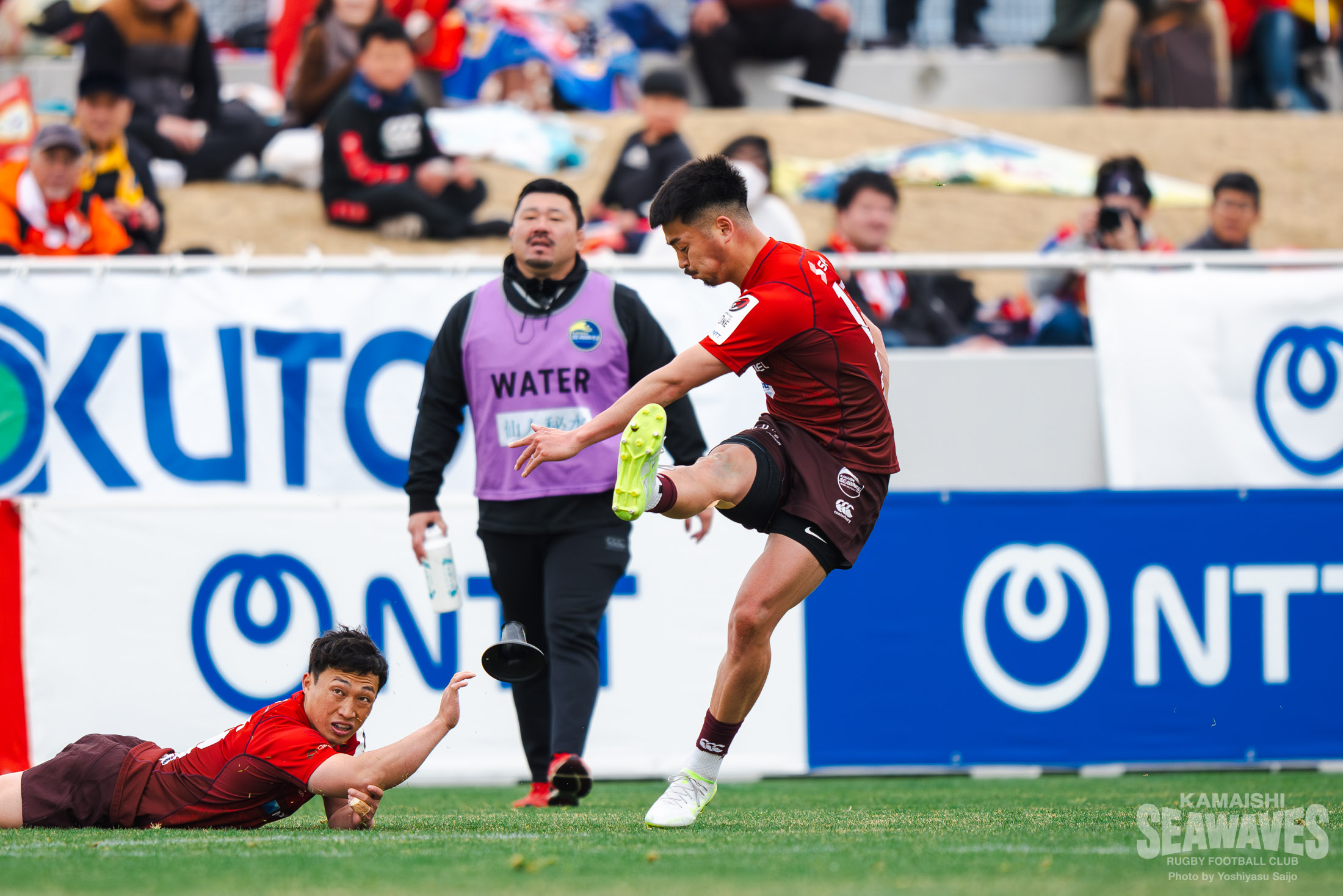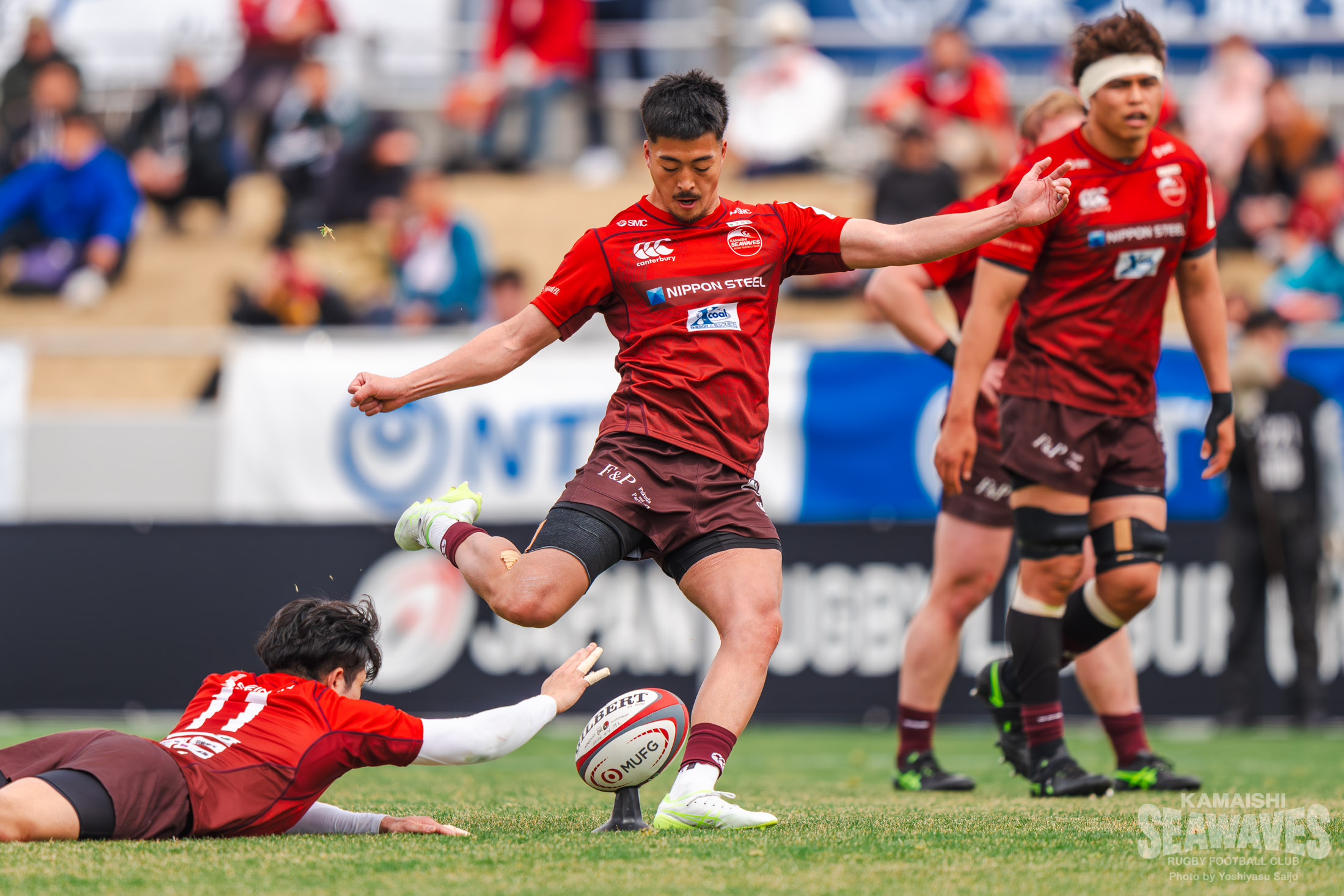強烈な個人技を見せられた釜石SWですが、前半25分、相手のキックがデッドボールラインを割ったことで得た敵陣スクラムでペナルティを獲得。正面からのショットをSO落和史選手が冷静に沈め、3-5と点差を縮めます。