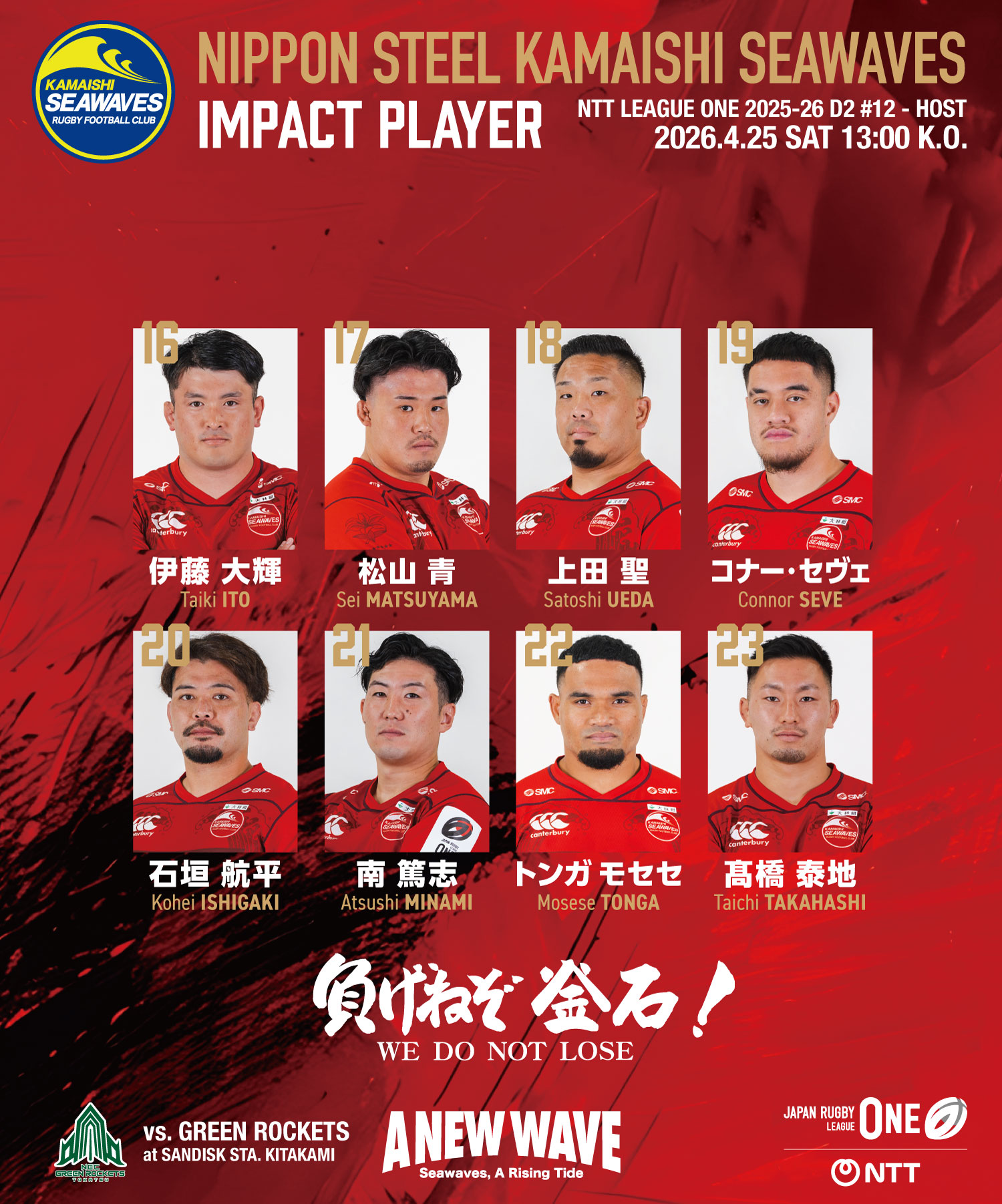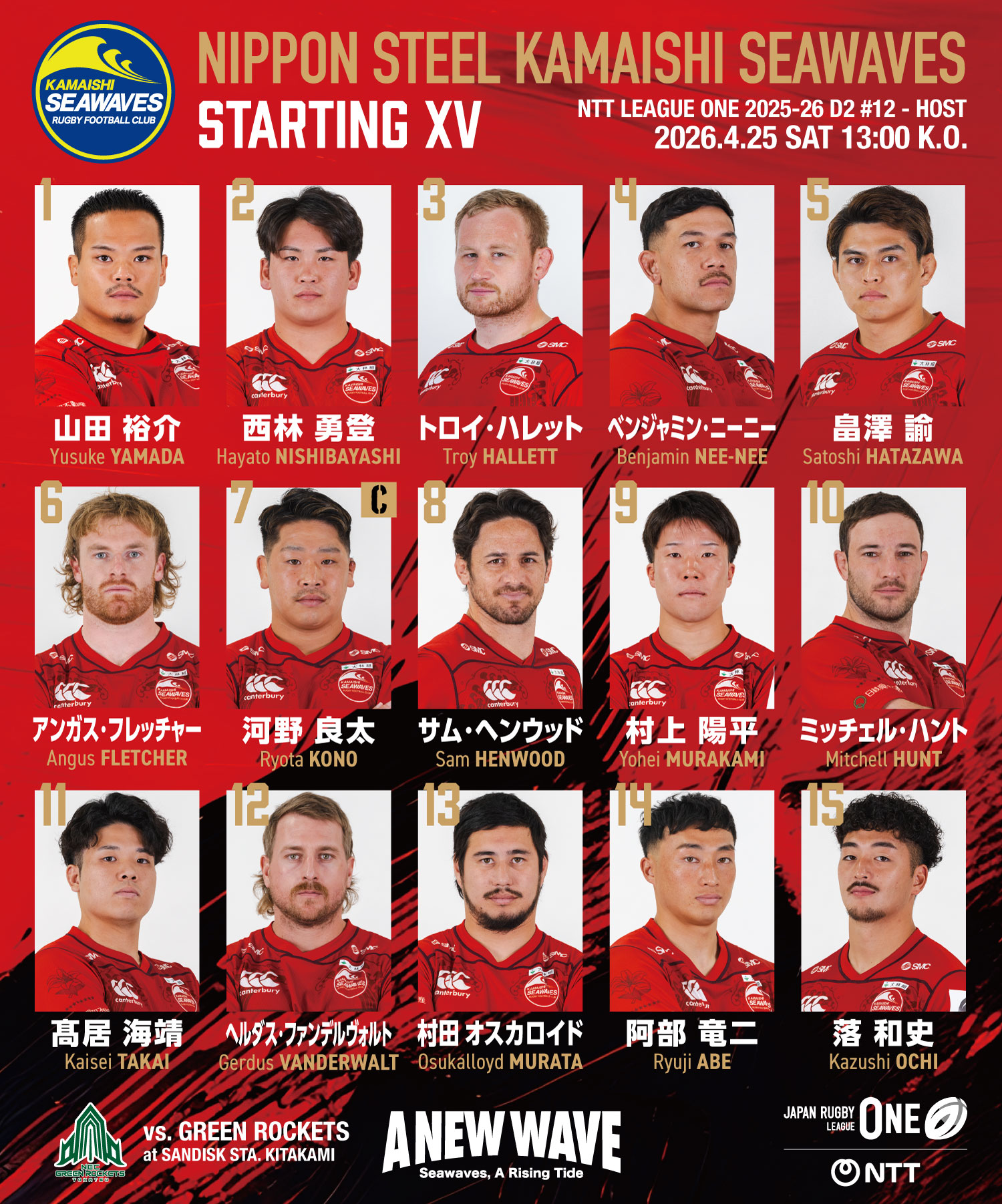 ジャパンラグビーリーグワン2025-26ディビジョン2第12節、日本製鉄釜石シーウェイブス(以下、釜石SW)は4月25日(土)、サンディスクスタジアムきたかみでNECグリーンロケッツ東葛(以下、GR東葛)とのホストゲームに臨みました。