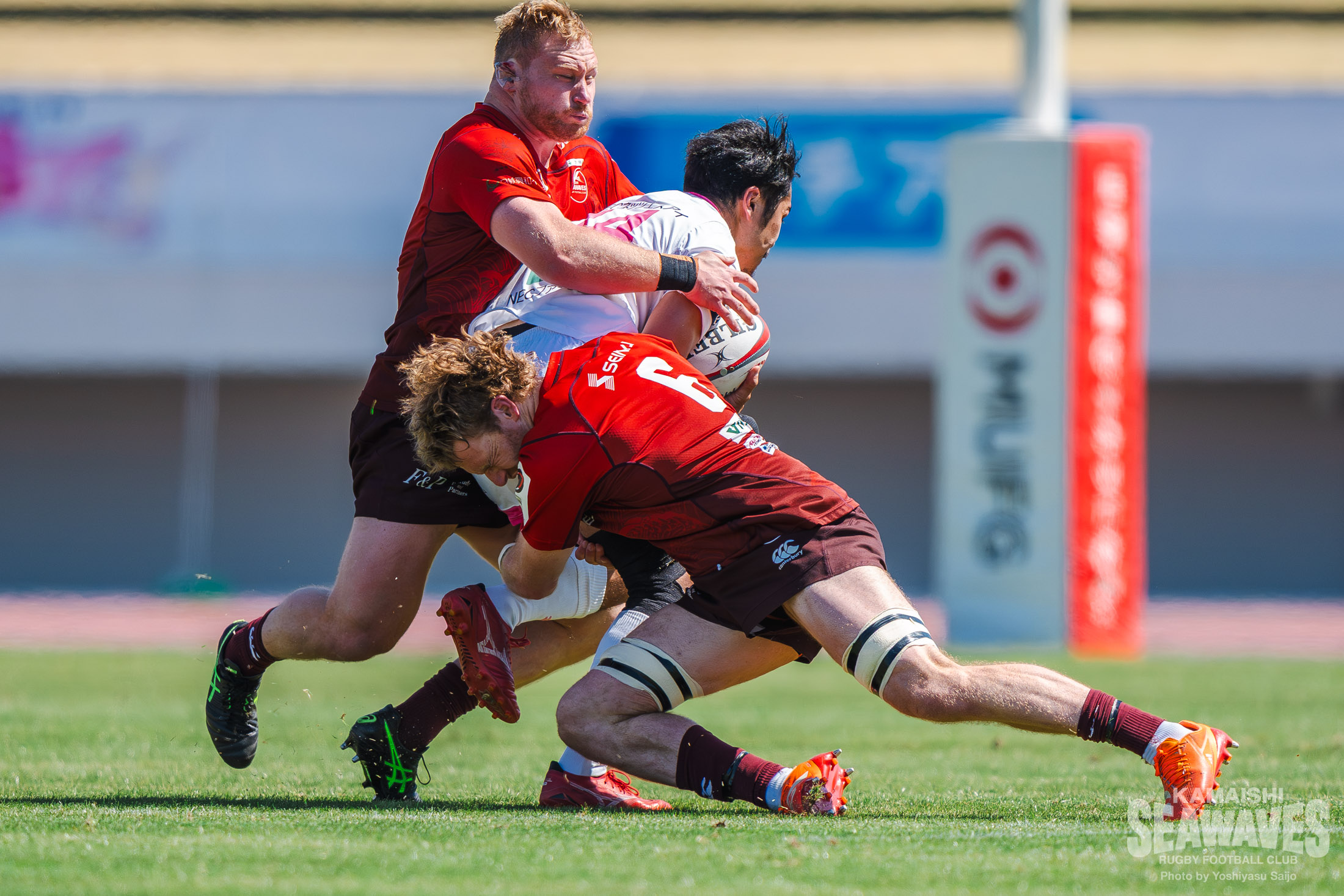 攻め続けながらも得点できない中、後半31分に久々に自陣22mへの進入を許すと、スクラムでコラプシング。GR東葛にペナルティショットを決められて24-34と点差を広げられます。さらに後半39分にも自陣でペナルティを与えてしまい、3点を追加されて24-37でノーサイドとなりました。