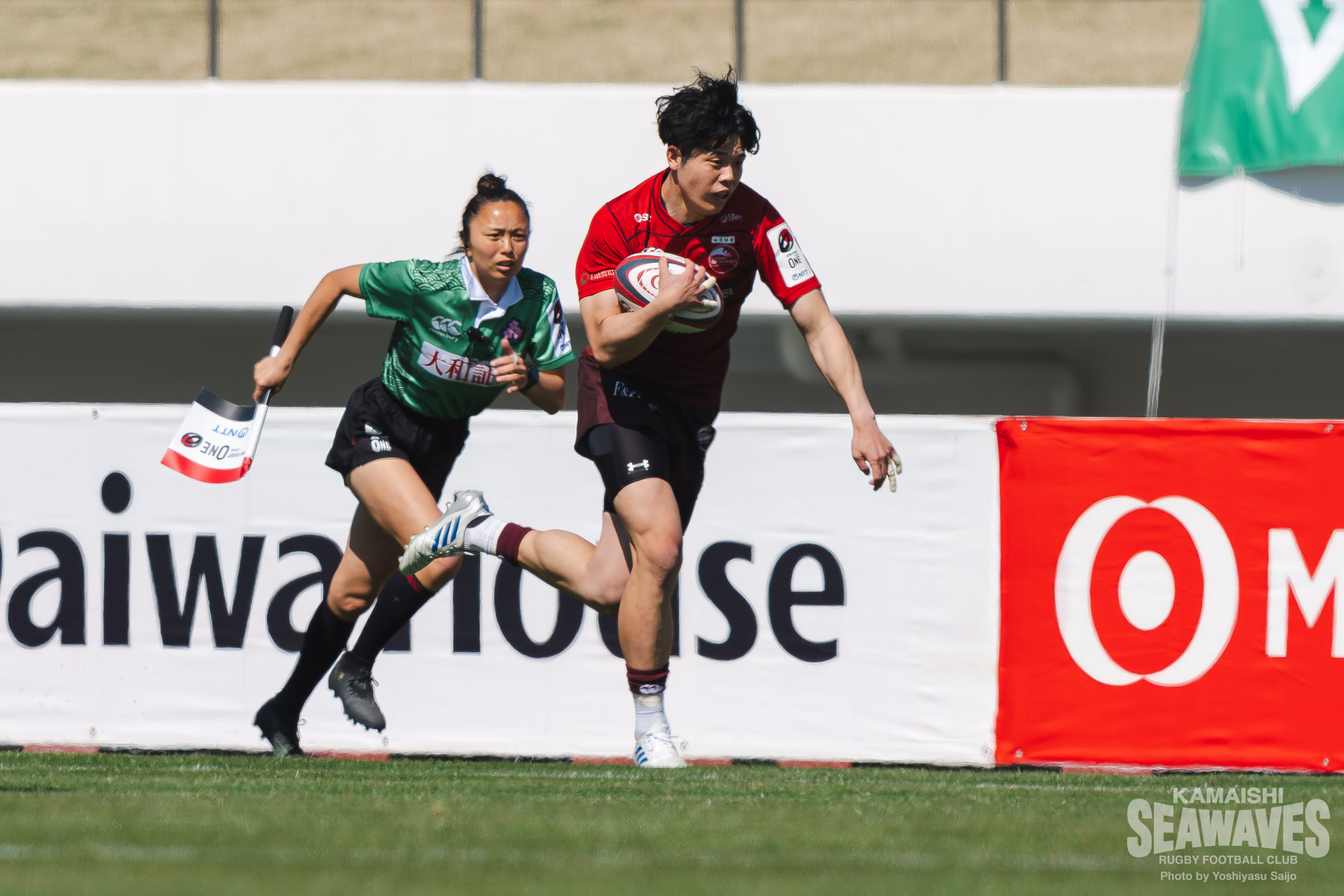 「前半はディフェンスの時間が長く、NECグリーンロケッツ東葛(以下、GR東葛)さんのアタックの圧力を受けてしまって、ペナルティもあり、自分たちがアタックする時間が短かったと思います。逆に後半は自分たちがボールを持ってアタックする時間が長くなりましたし、ワイドに攻めていこうということを実行できた。それがスコアにつながったのかなと思います」