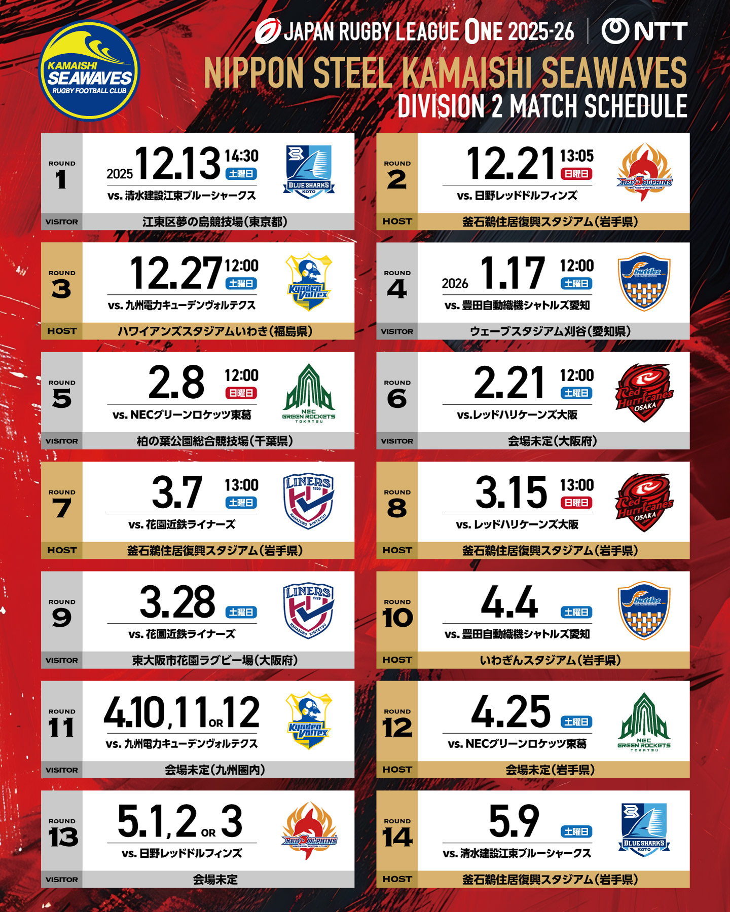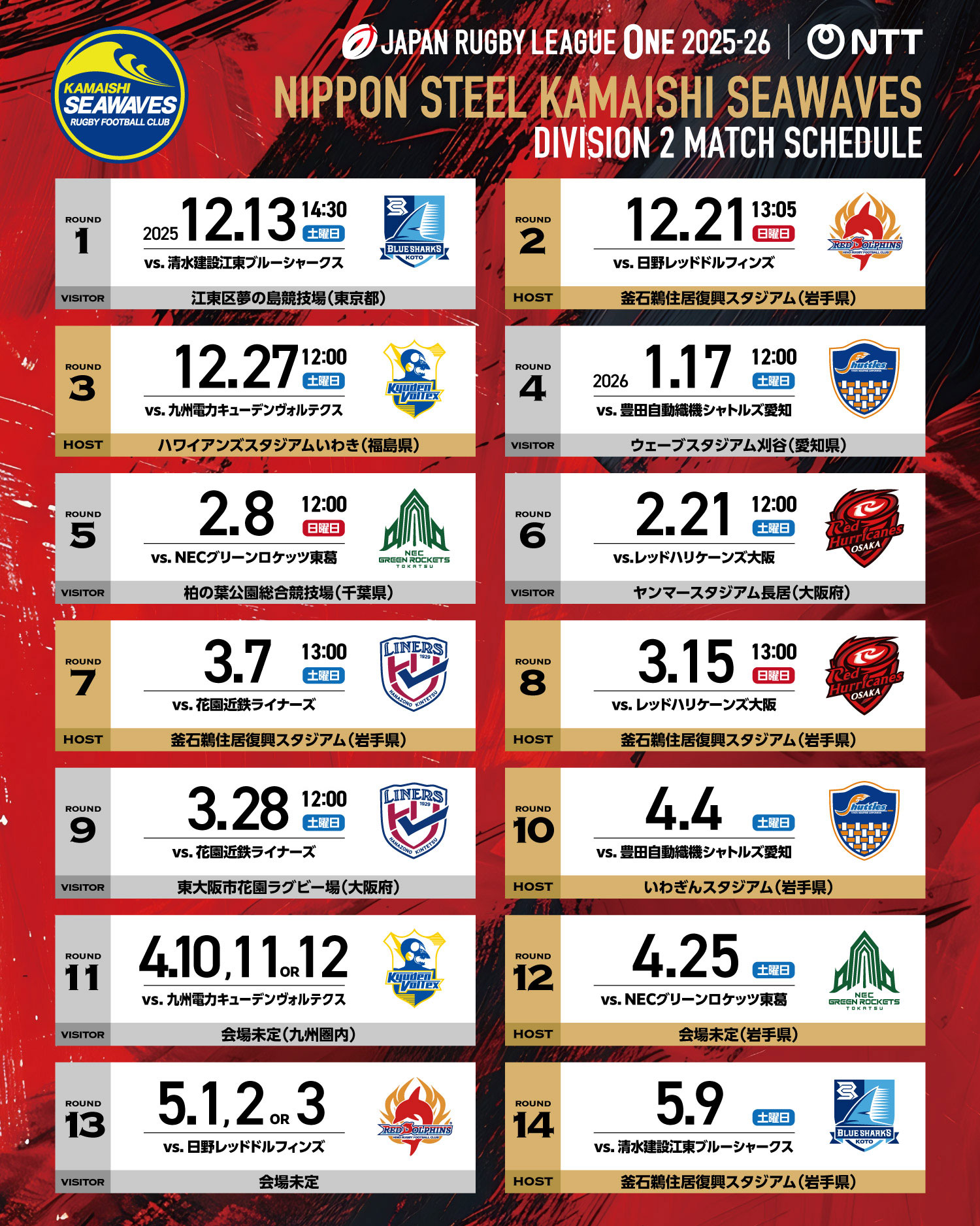 各試合の未定の情報、キックオフ時間、放送予定の詳細等は決定次第リーグワン公式ウェブサイトやシーウェイブス公式ウェブサイトなどで随時お知らせいたします。チケット販売情報については、ホストチームの公式ウェブサイト、およびチケットラグビー等をご確認ください。