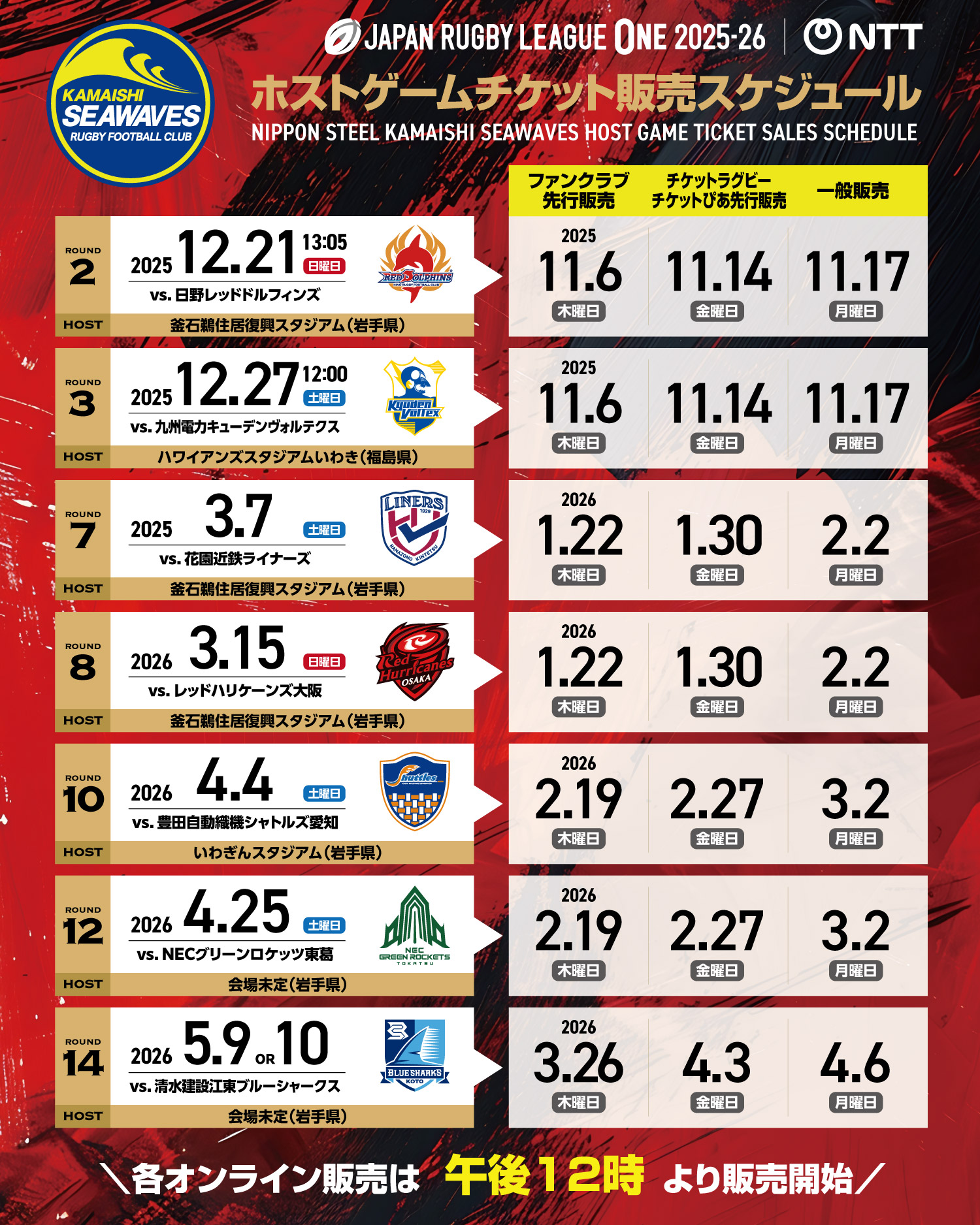 NTTジャパンラグビー リーグワン2025-26 ディビジョン2 日本製鉄釜石シーウェイブスホストゲームのチケット販売情報を公開しました。ホスト開幕節(12月21日)のチケットは、11月6日(木)よりファンクラブ先行販売がスタートします。