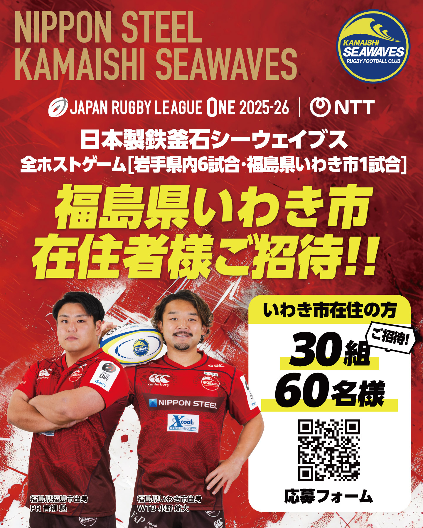 12月に開幕するNTTジャパンラグビー リーグワン2025-26 ディビジョン2 日本製鉄釜石シーウェイブスの全ホストゲームを対象に、岩手県内33市町村および福島県いわき市の各自治体ご在住の方30組60名(合計1,000組2,000名様程度)をご招待する企画を実施する運びとなりました。