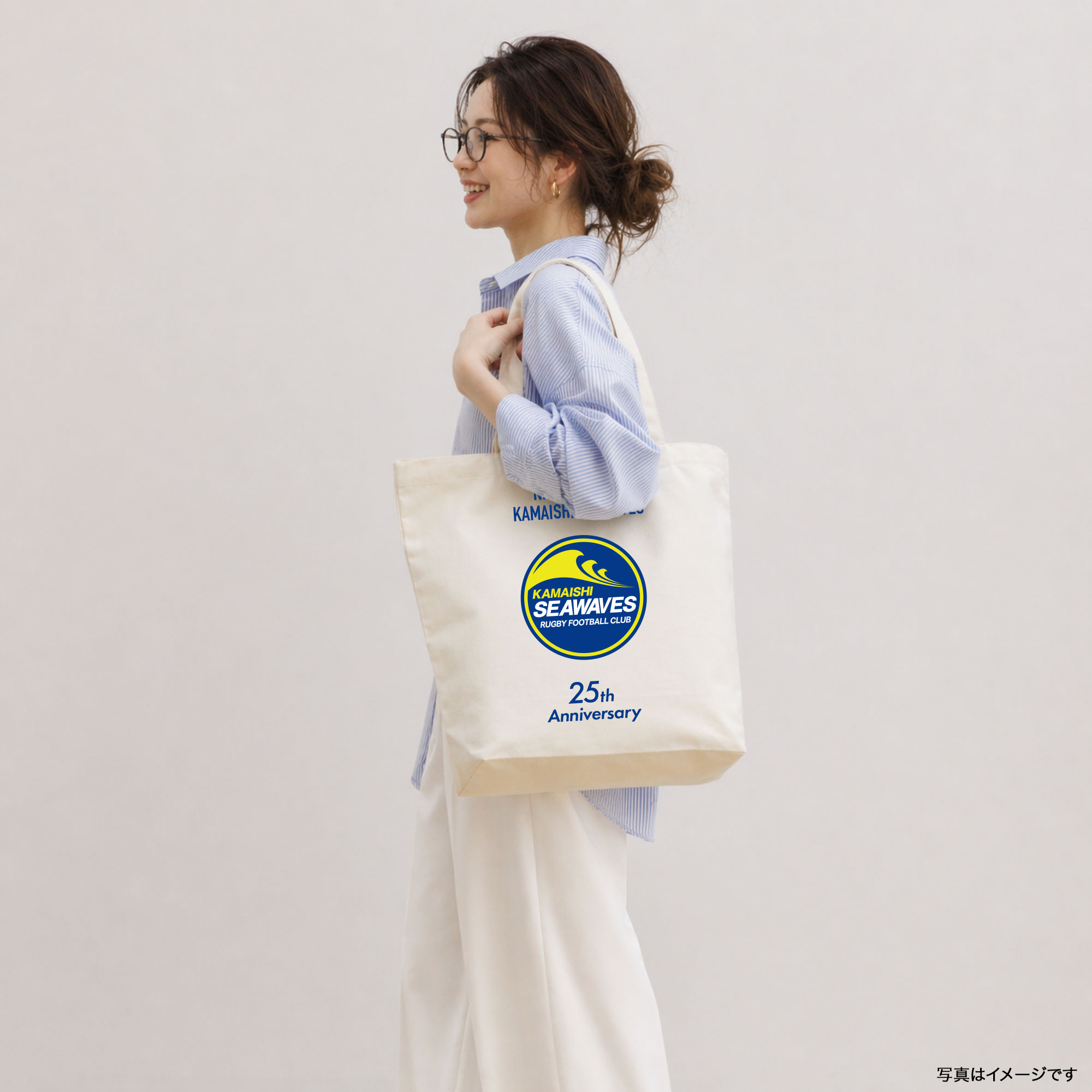 クラブエンブレムと25周年記念ロゴが入った厚手キャンバス生地のトートバッグ。B4サイズがゆったり入るので、メインバッグとしてはもちろん、ショッピング用のエコバッグにも最適です。持ち手が長く男性でも肩掛けできます。