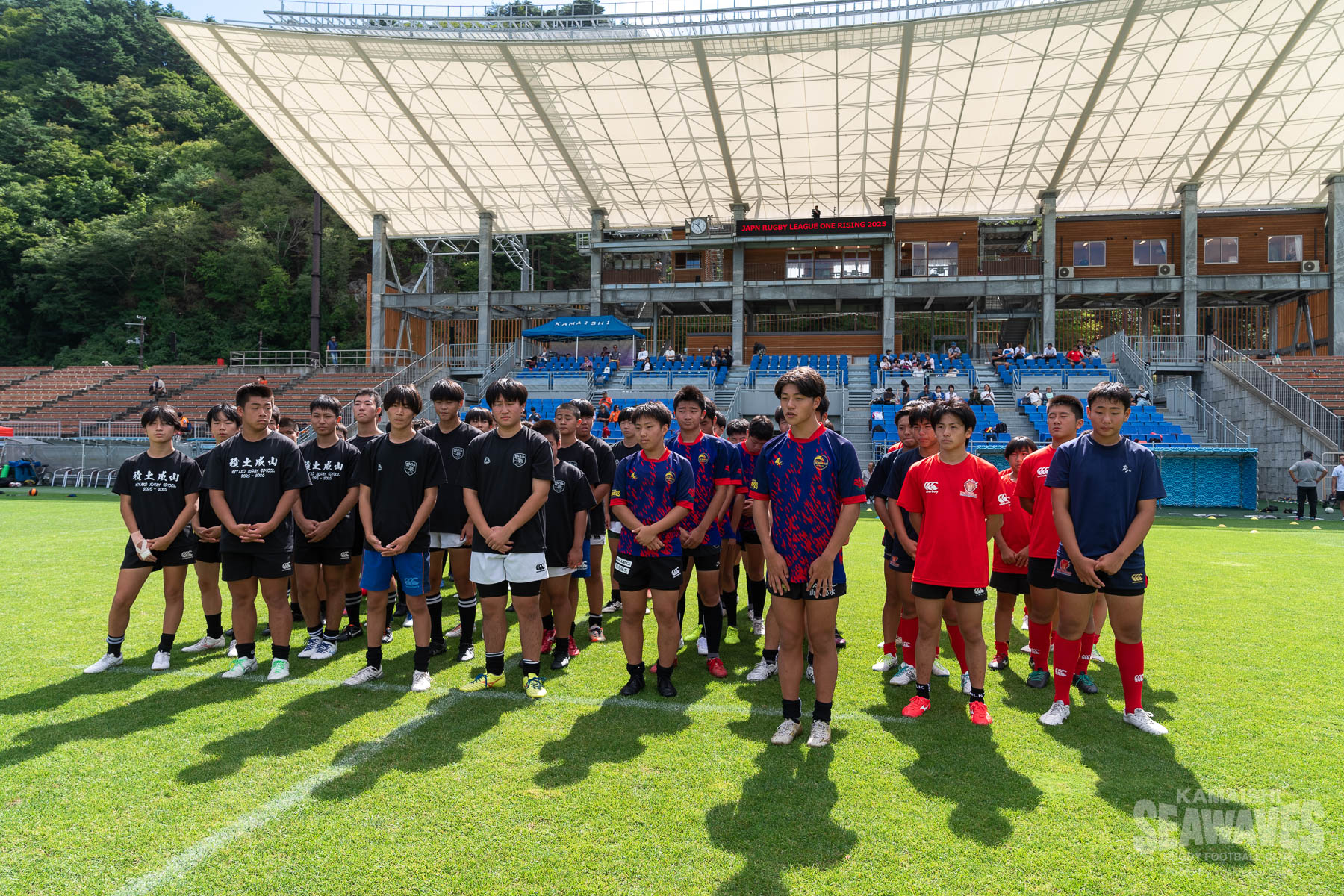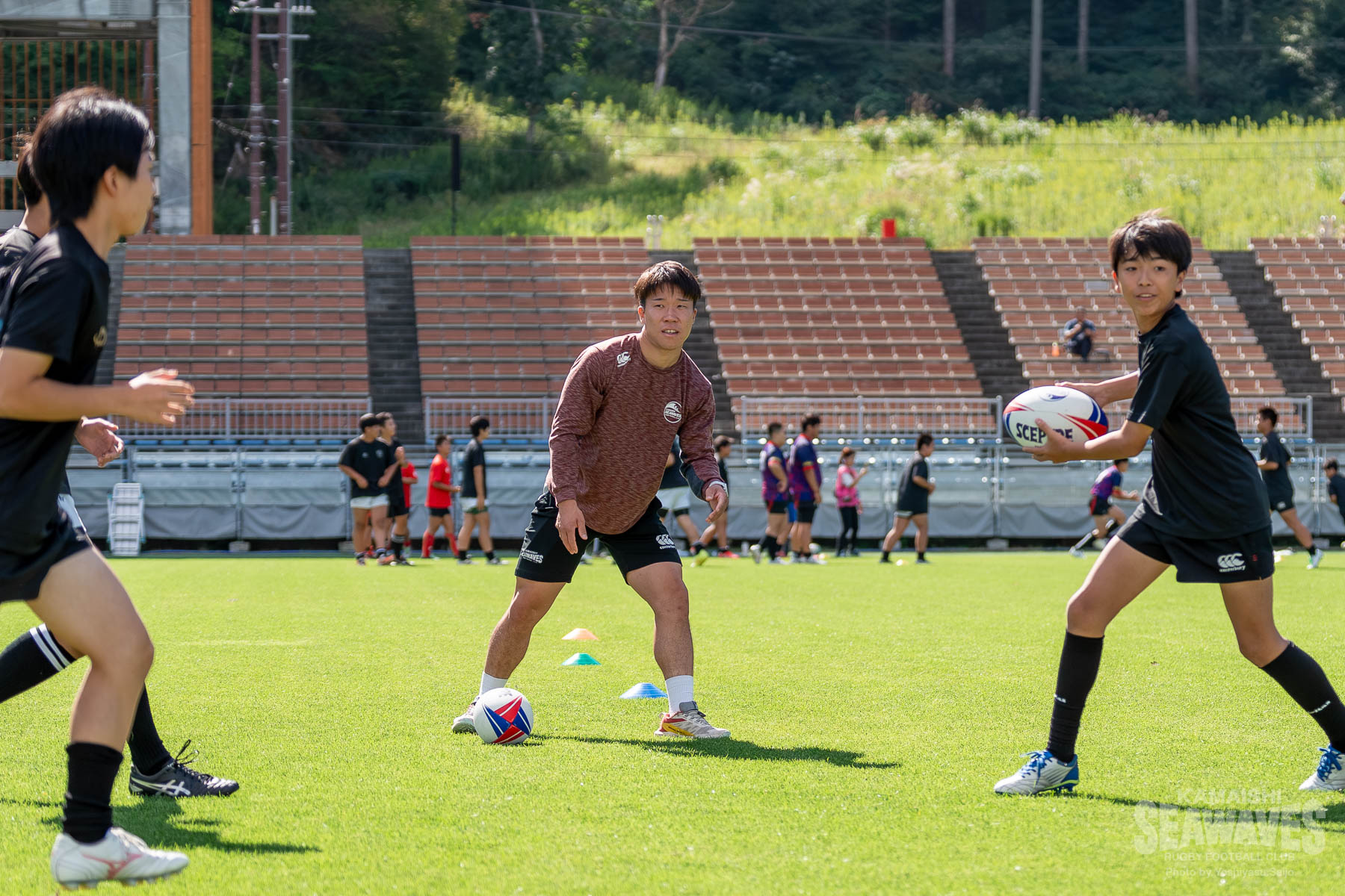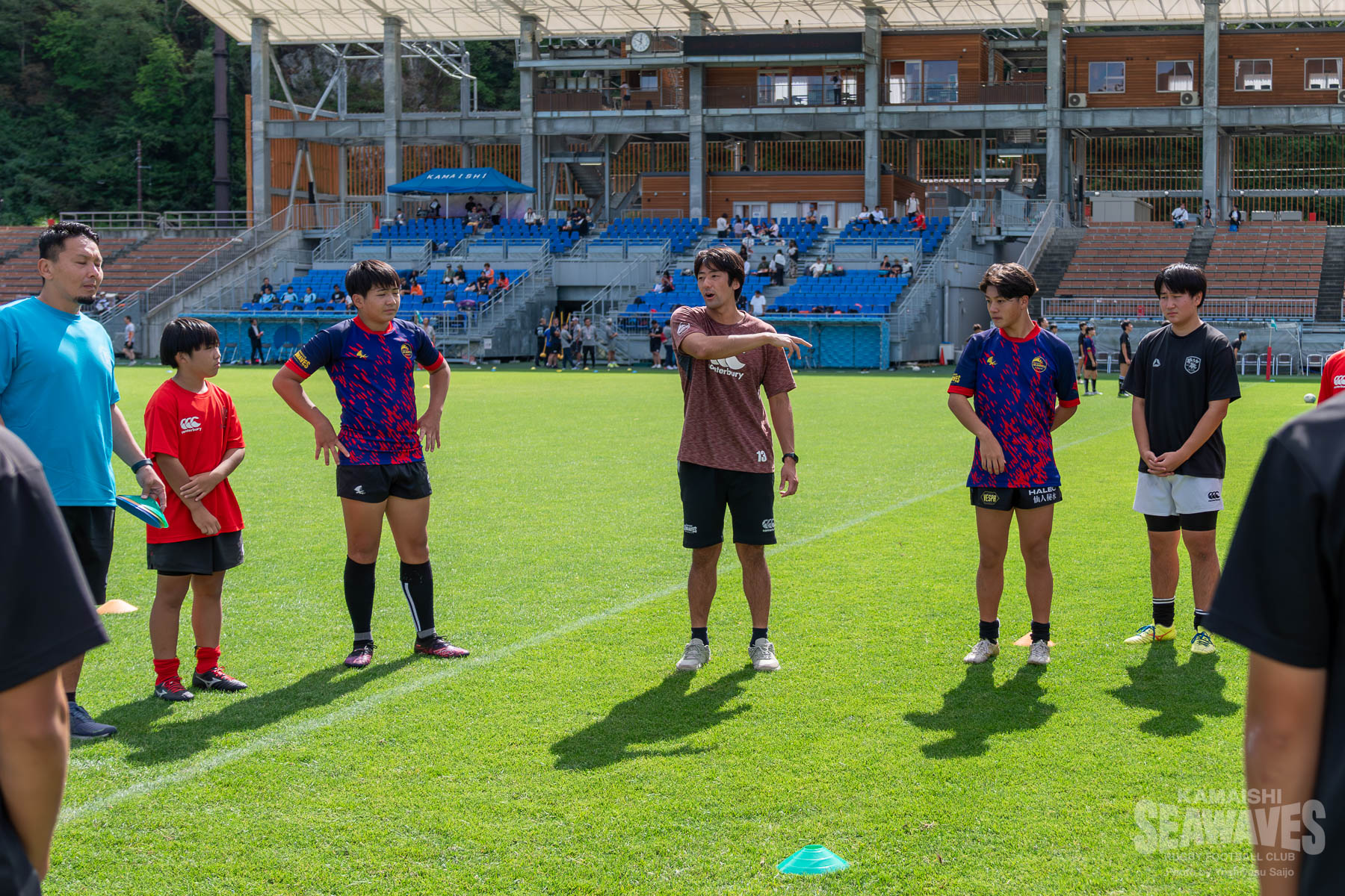 9月27日(土)、釜石鵜住居復興スタジアムで開催されたジャパンラグビー リーグワン ライジング 第1戦 「黄金の國、いわて。」Presents. 県政150周年記念スペシャルマッチ クボタスピアーズ船橋・東京ベイ戦の試合前に、岩手県内の中学生ラグビー選手を対象としたラグビーのまち釜石教室特別編「日本製鉄釜石シーウェイブス×クボタスピアーズ船橋・東京ベイ 合同ラグビークリニック」が行われました。
