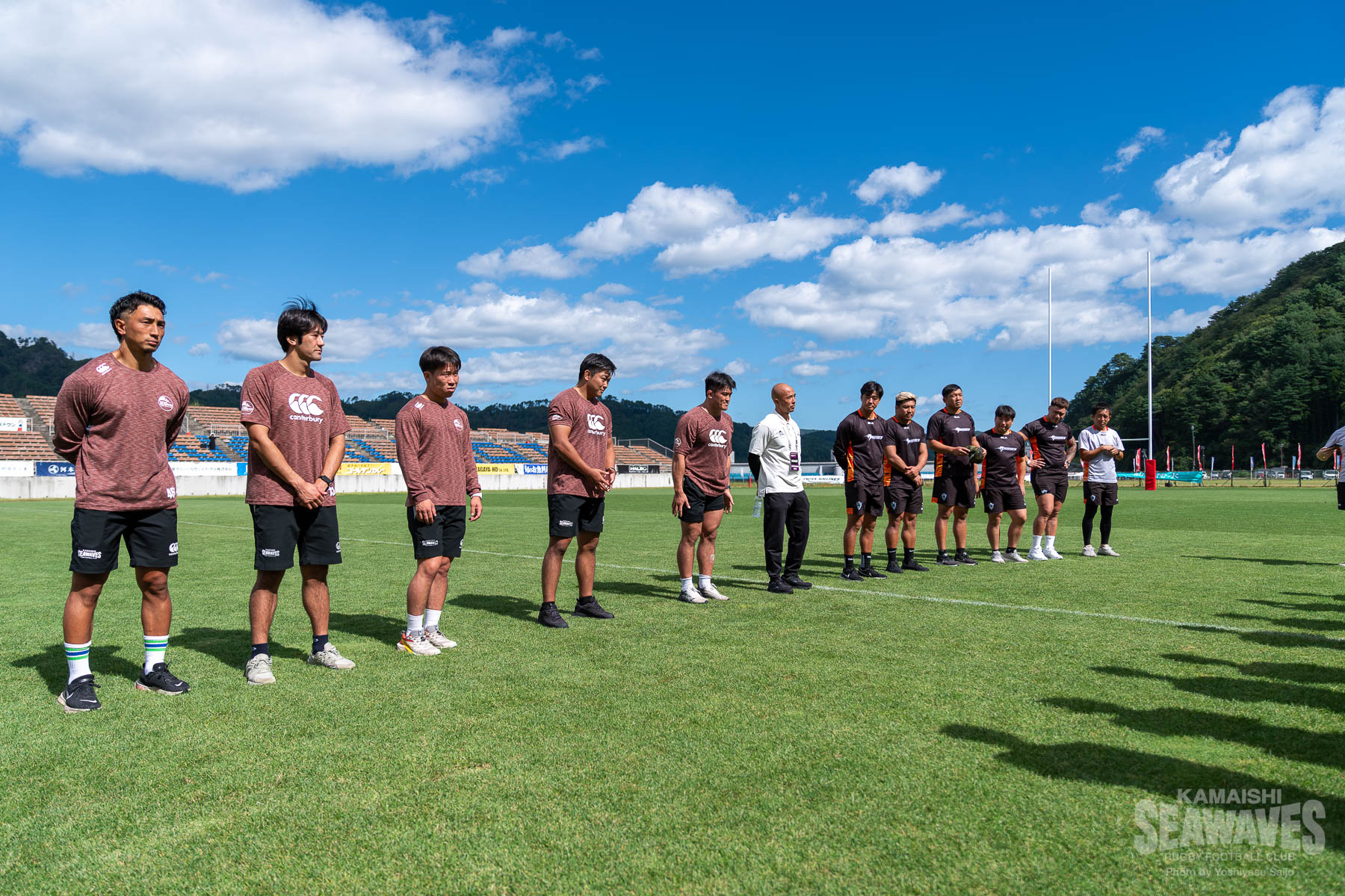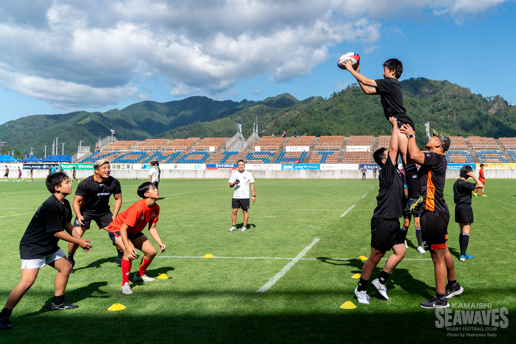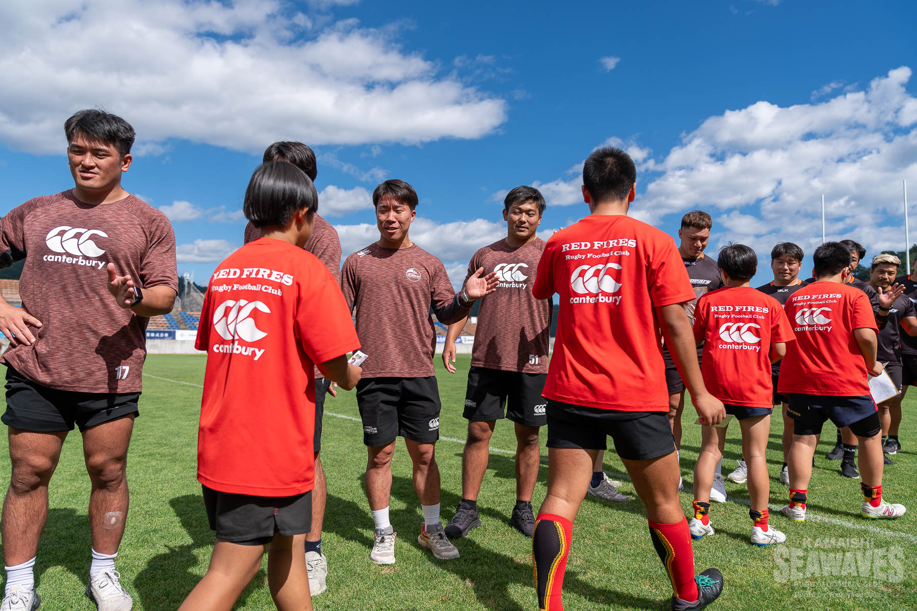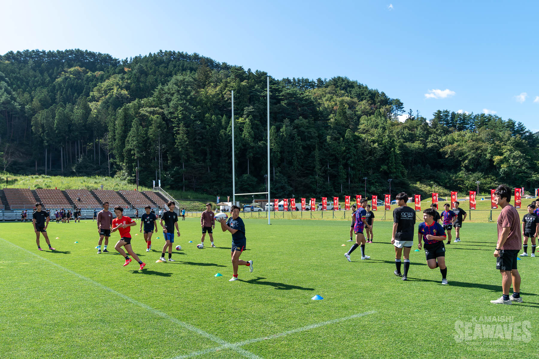 9月27日(土)、釜石鵜住居復興スタジアムで開催されたジャパンラグビー リーグワン ライジング 第1戦 「黄金の國、いわて。」Presents. 県政150周年記念スペシャルマッチ クボタスピアーズ船橋・東京ベイ戦の試合前に、岩手県内の中学生ラグビー選手を対象としたラグビーのまち釜石教室特別編「日本製鉄釜石シーウェイブス×クボタスピアーズ船橋・東京ベイ 合同ラグビークリニック」が行われました。