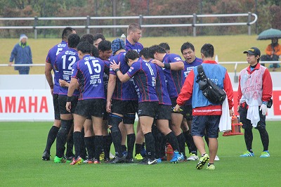 あいにく雨の中での試合になりましたが、試合開始からスクラムや前に出るディフェンスでプレッシャーを掛け、前半12分には中村のペナルティーゴールで先制します。その後も敵陣ゴール前まで攻め込みますが、ミスで追加点を奪うことが出来ません。25分には日野自動車にトライを奪われ、3対7とリードを許します。その後も日野自動車の時間帯が続きますが、終了間際、2人のシンビンを出してしまい、ハーフタイムを迎えることになります。